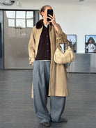 A refined vintage beige 1980s wool coat designed with a concealed placket and belted silhouette. Crafted in a double-faced construction with no lining. Finished with a hand-attached fur collar that can be removed for a more minimal look.