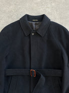 Vintage 1990s belted coat in a deep charcoal tone, designed with a concealed placket and clean single-button neckline. Cut with a softly structured silhouette and finished with a matching waist belt for adjustable shape, offering a timeless, understated outerwear profile.