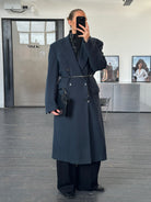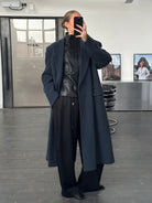 A vintage 1990s Moschino Uomo double breasted coat in a deep blue tone. A long tailored silhouette with broad lapels that feels classic, substantial and quietly formal.