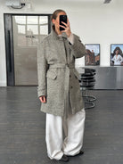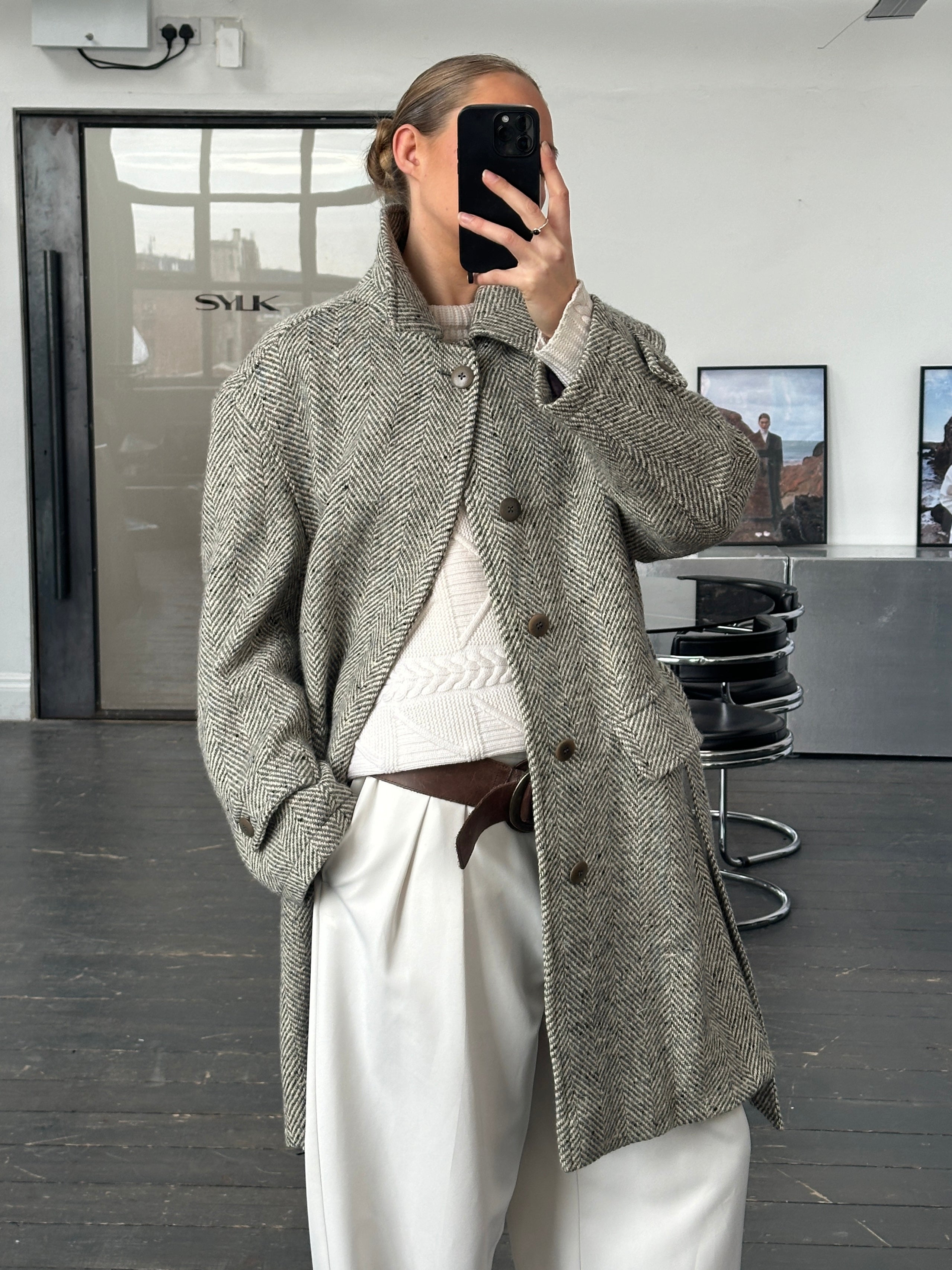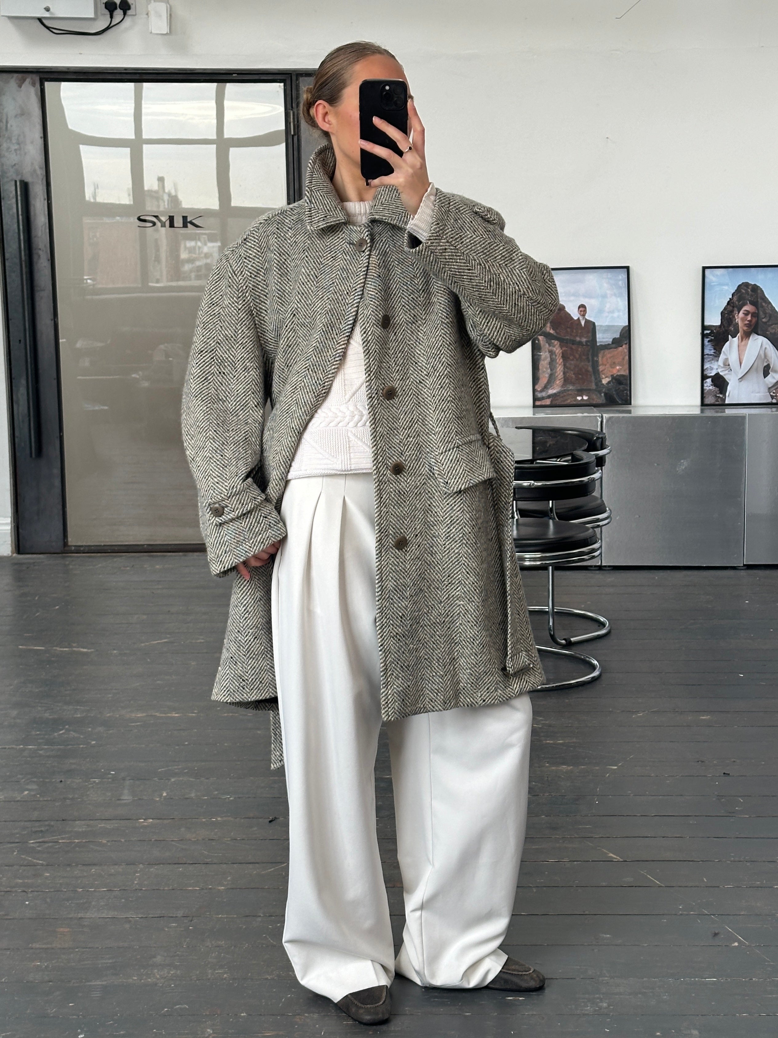 A vintage 1990s Valentino UOMO belted coat in a soft greige herringbone with cream and grey threads. A brushed pure wool piece with a clean tailored structure and understated Italian refinement.