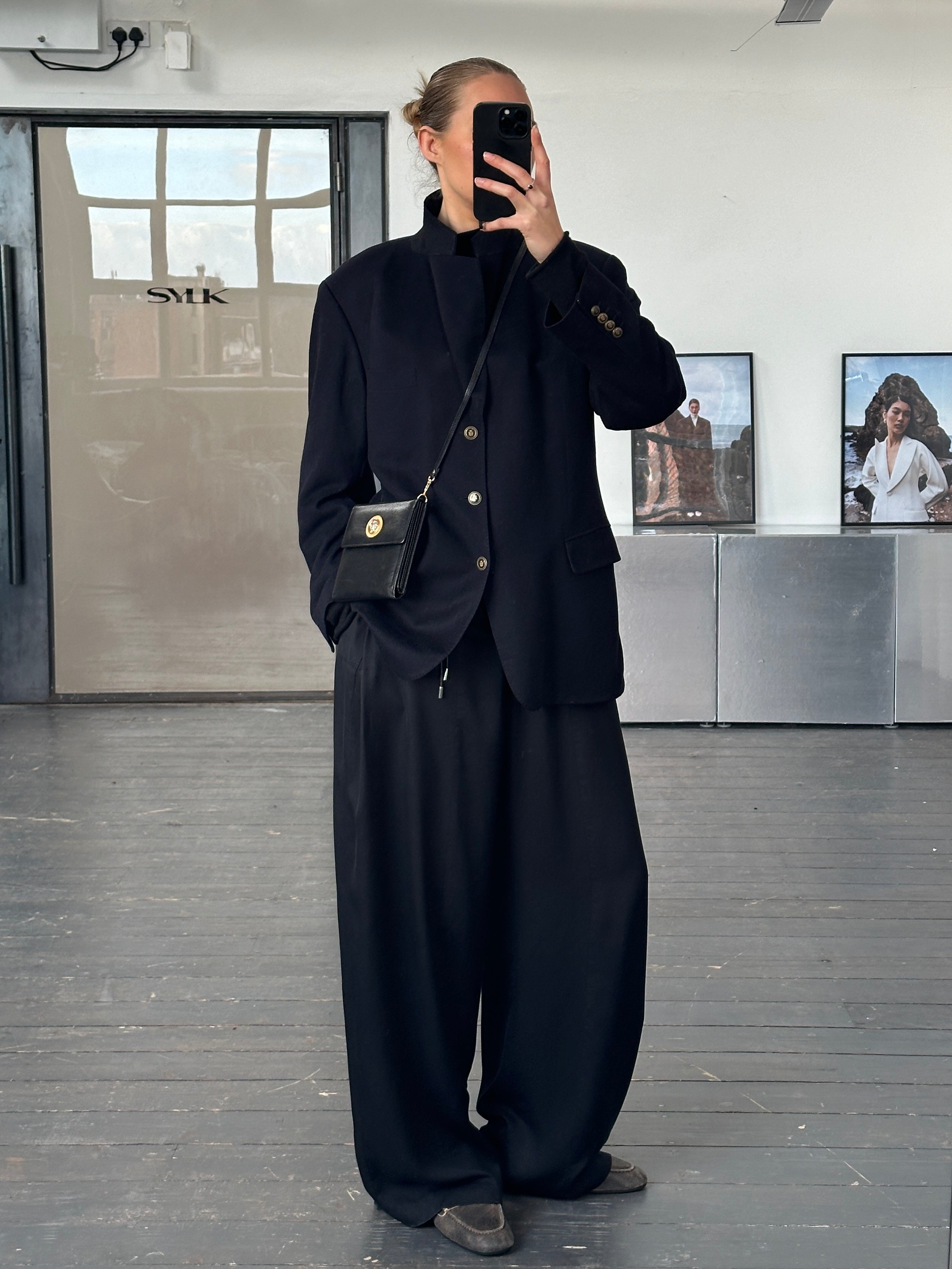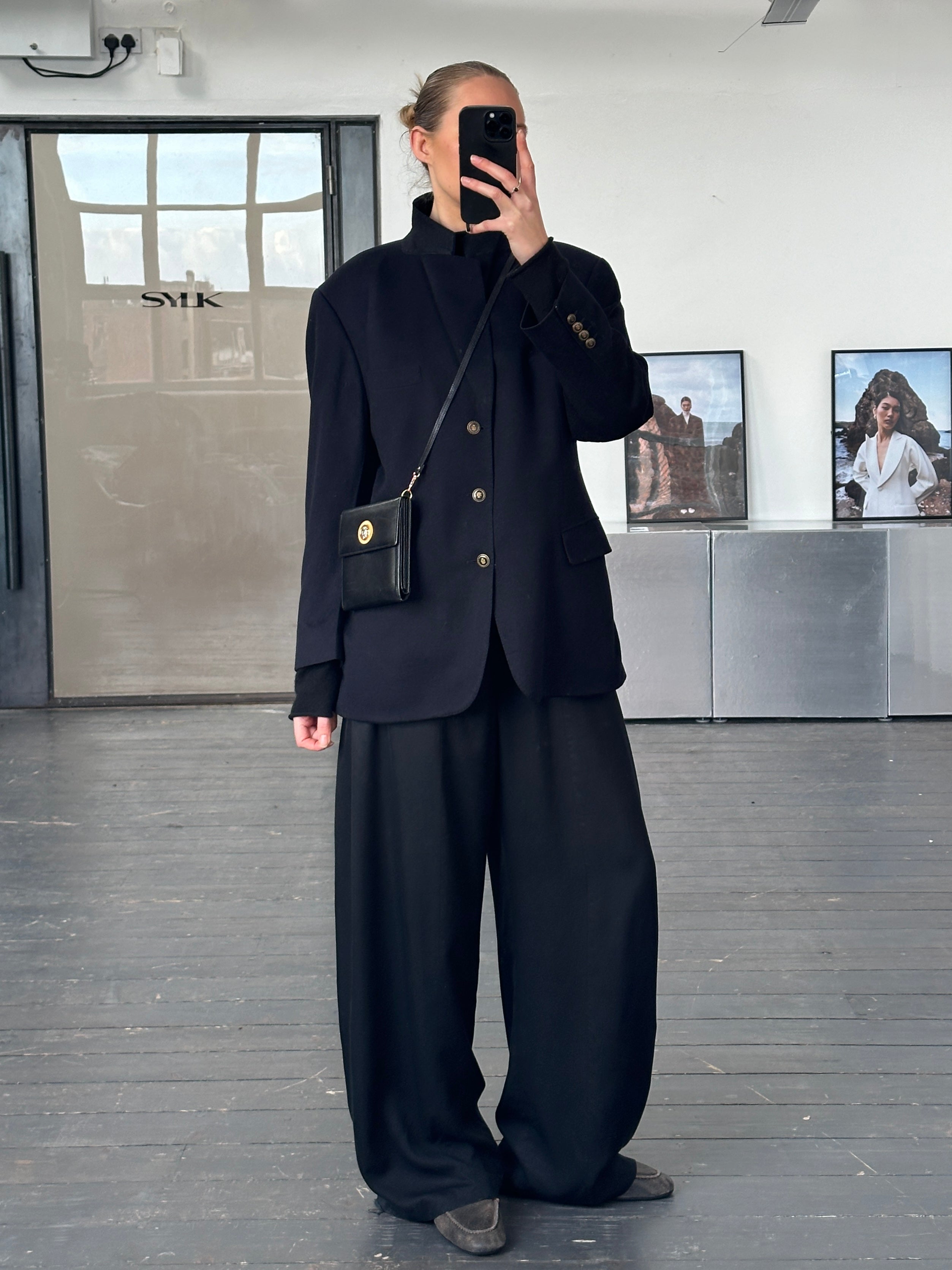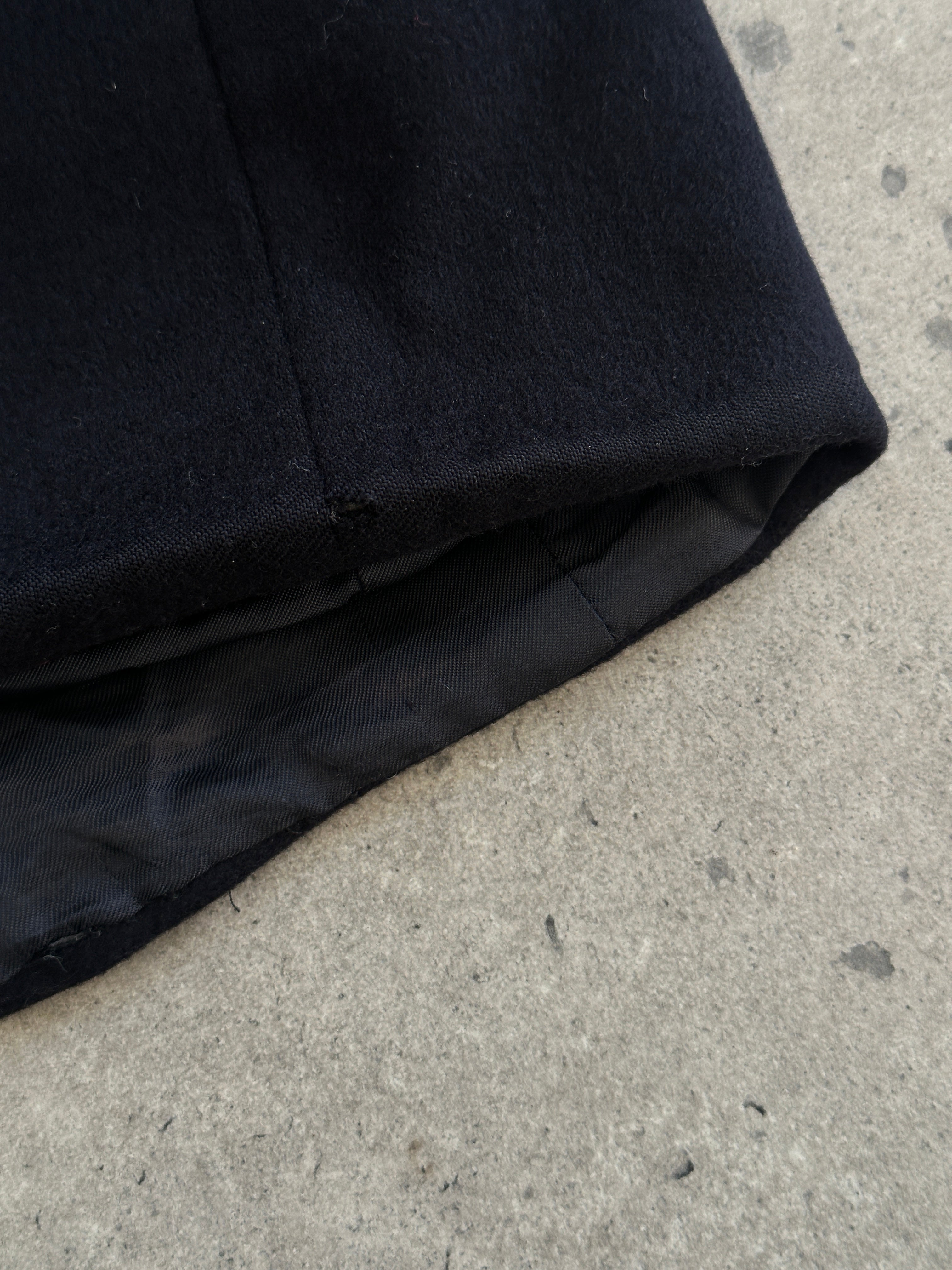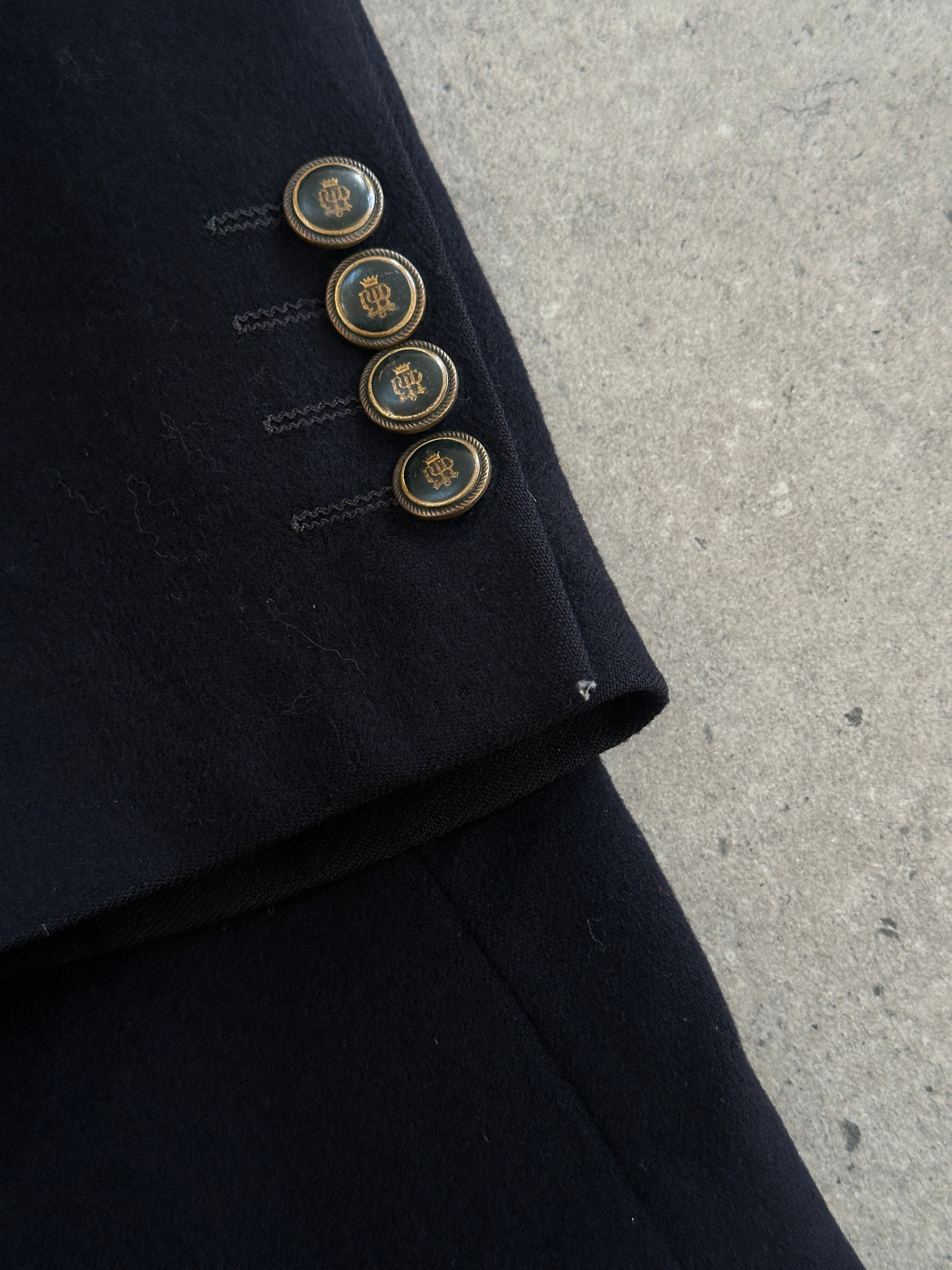 A vintage 1990s Bonacelli single breasted blazer in a deep navy tone. Cut in pure cashmere with a relaxed silhouette and refined bespoke buttons detailing.