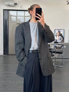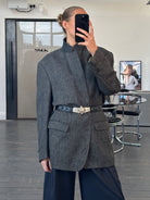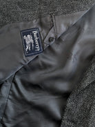 A vintage classic 1990s Burberrys blazer in a soft grey herringbone wool with a clean tailored silhouette and lightly structured shoulders.