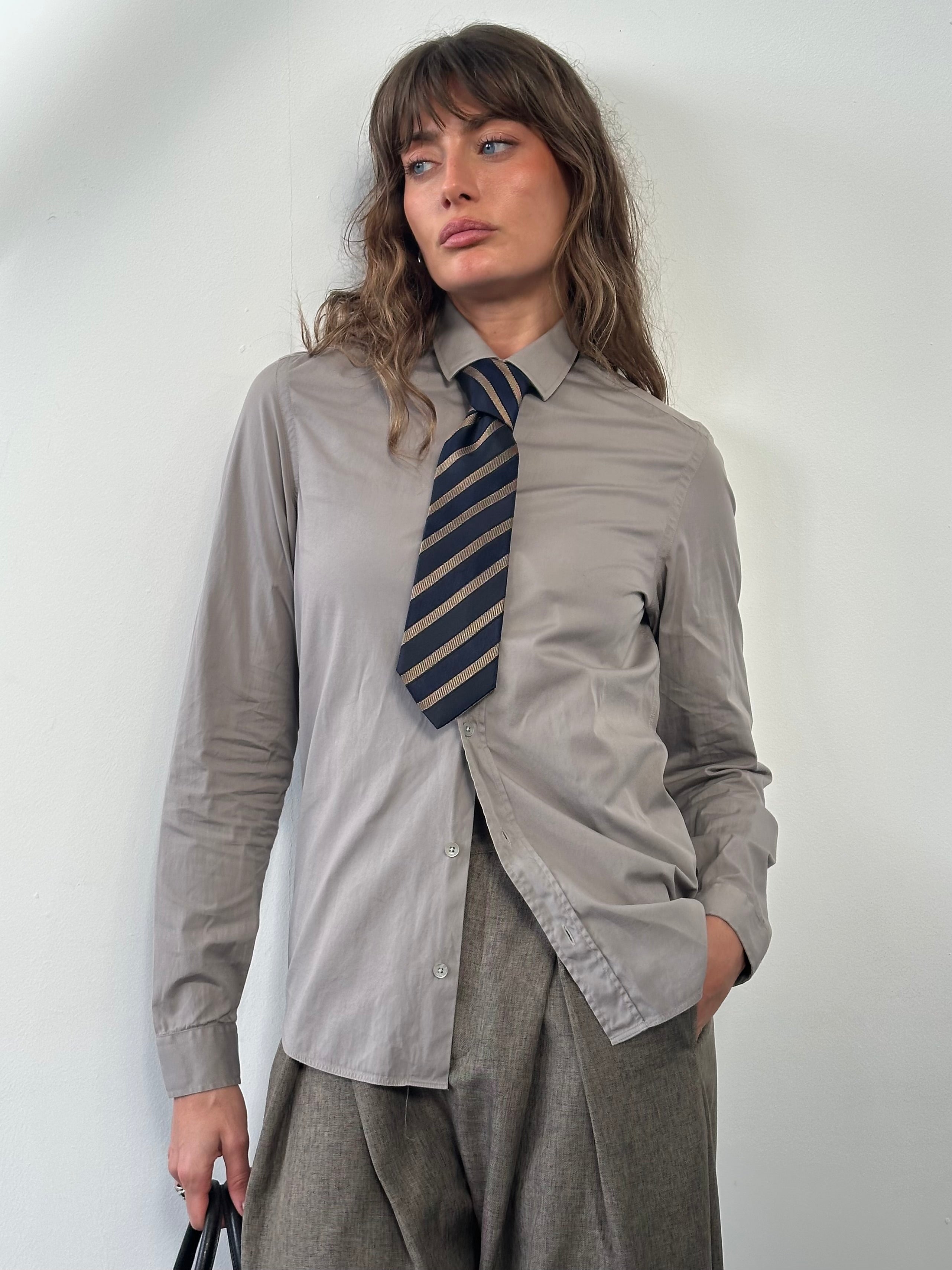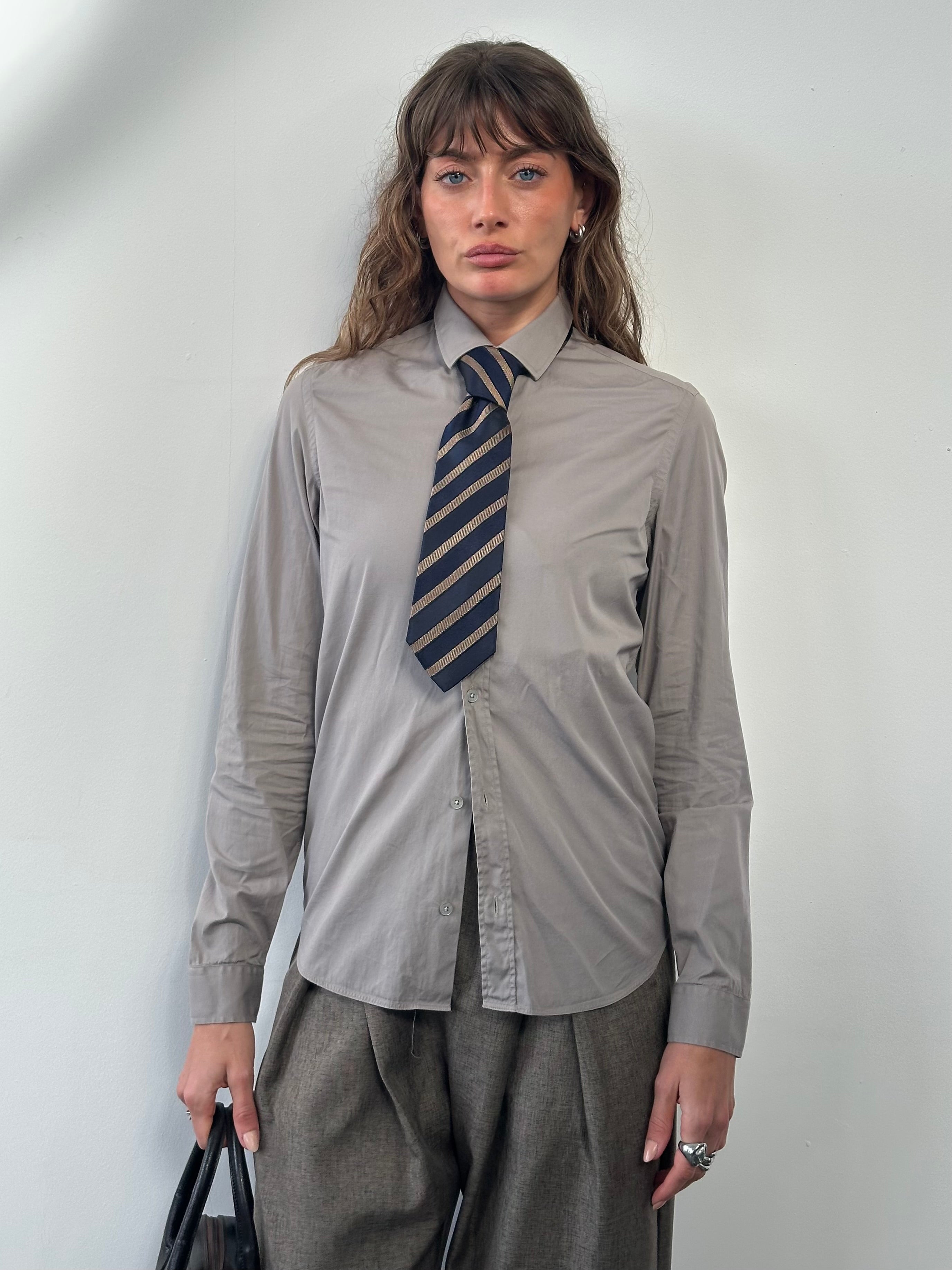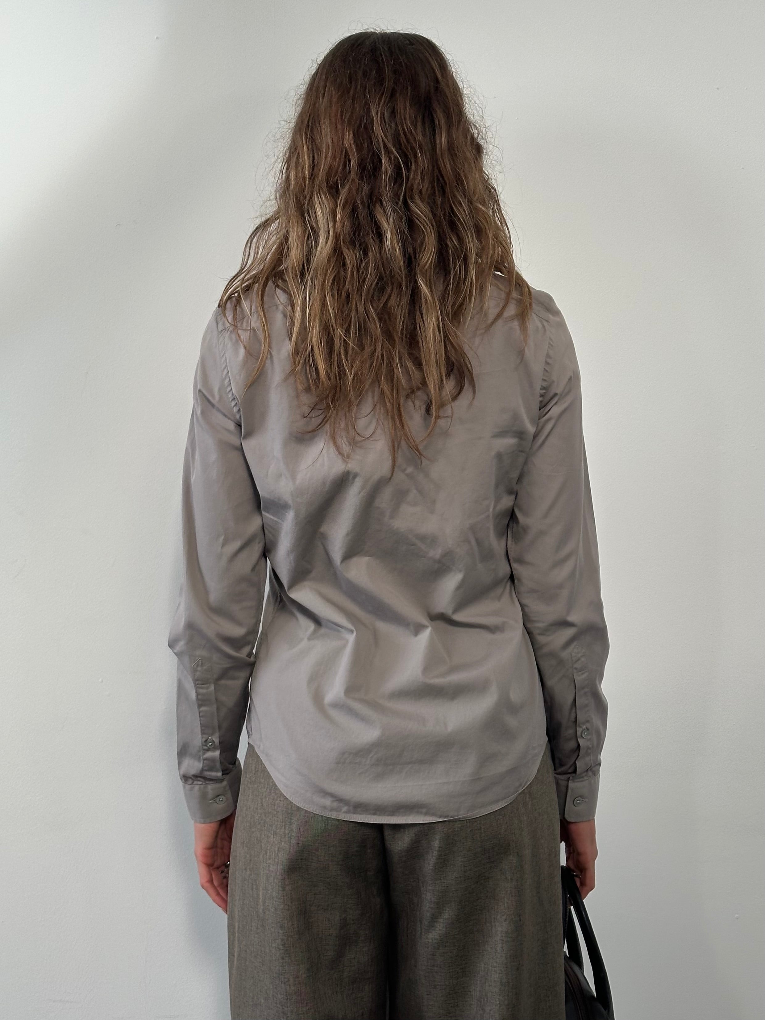 Vintage Burberry Prorsum 2000s runway shirt in taupe cotton featuring a clean tailored silhouette with a slightly fitted cut. Designed with a sharp collar, tonal logo buttons and minimalist construction typical of the Burberry Prorsum runway line.