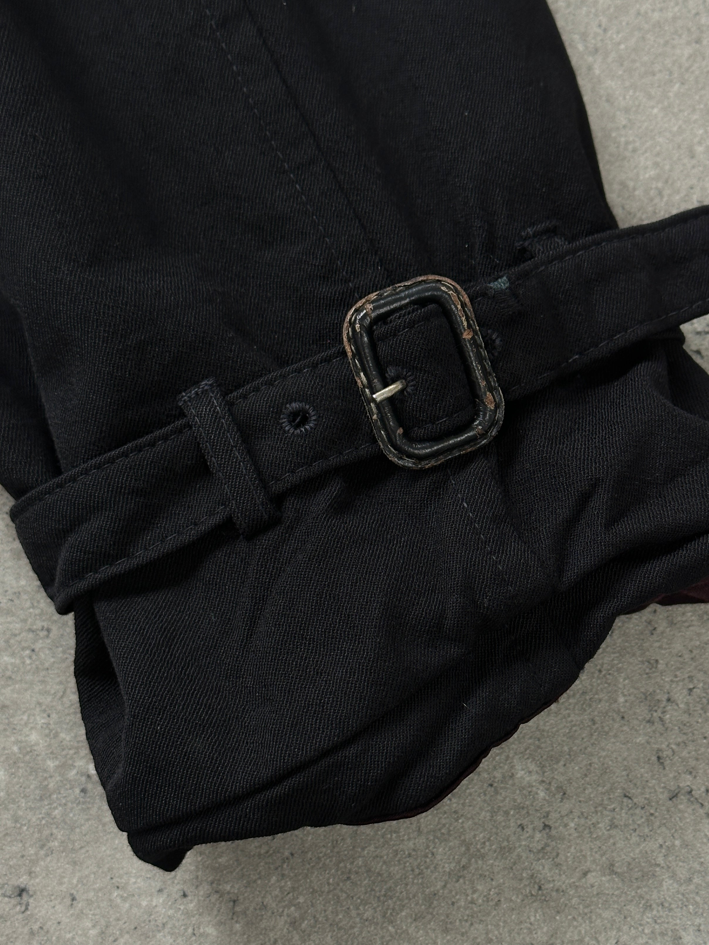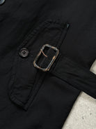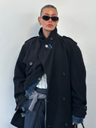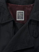 Vintage Christian Dior Monsieur 1980s double-breasted trench coat in a deep black tone, crafted in pure new wool with a belted waist. Designed with a wide lapel, storm flap detailing, and classic trench proportions, offering a strong tailored drape through the body.