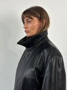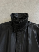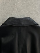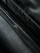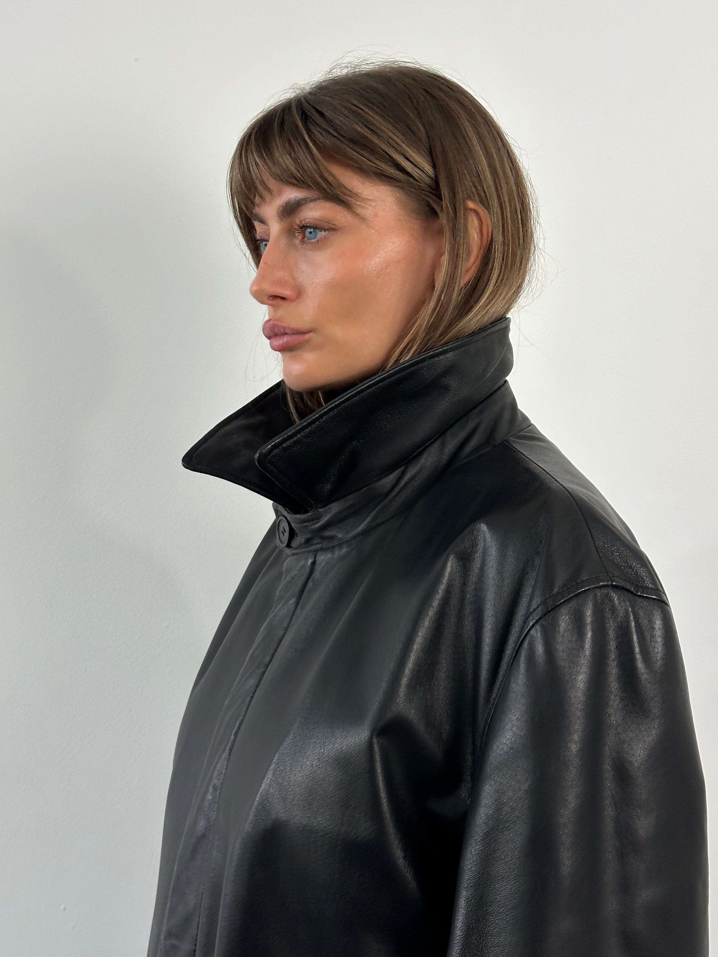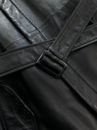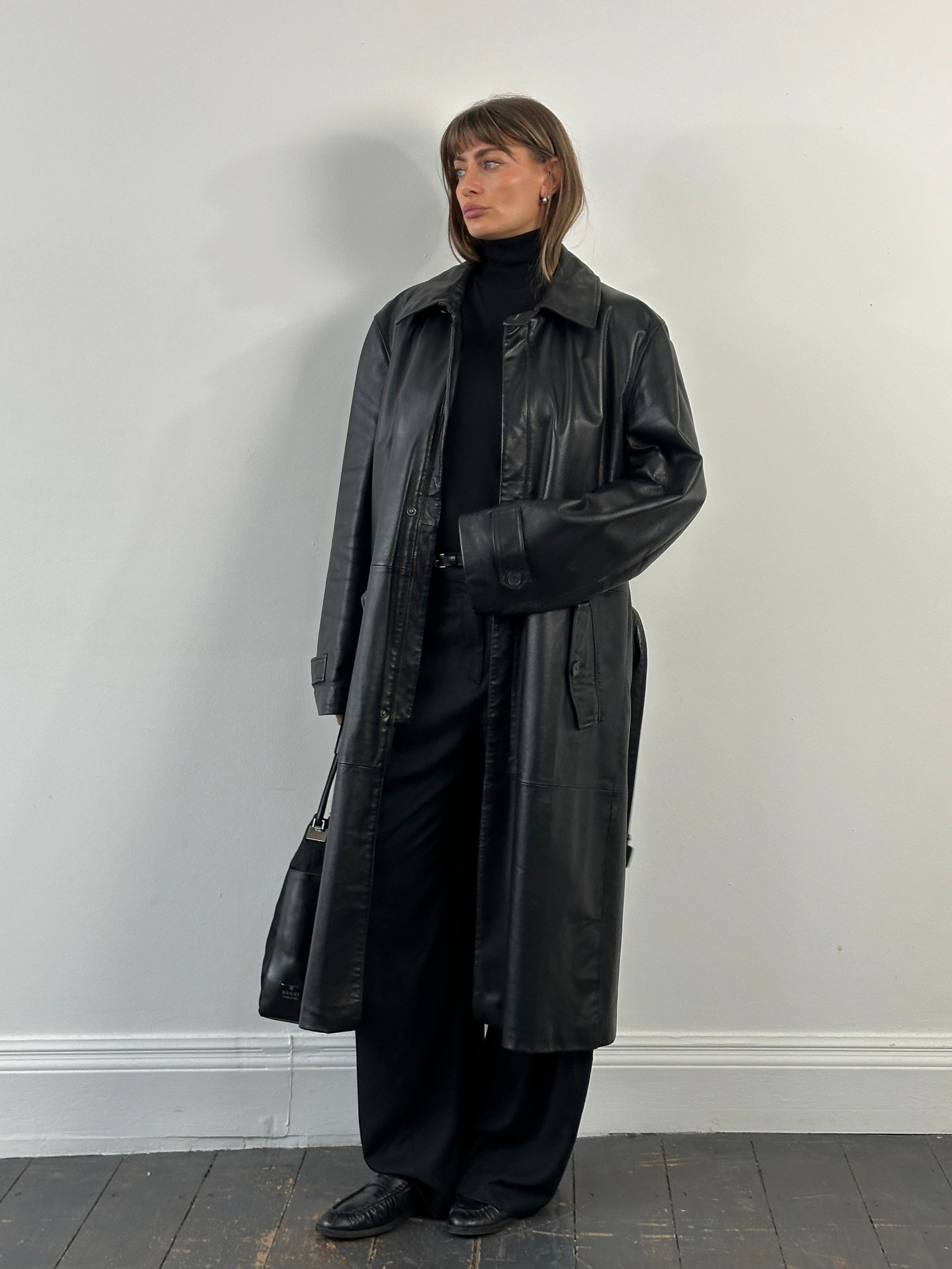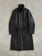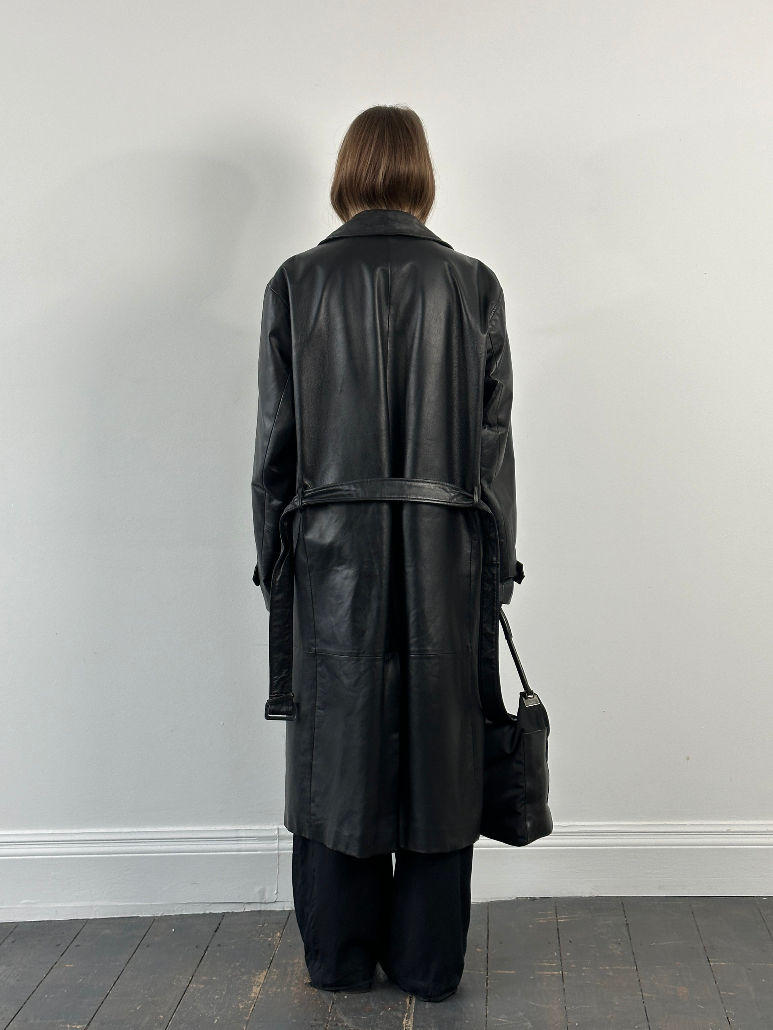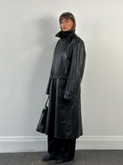 A vintage 1990s Conbipel heavyweight leather belted trench in a deep black tone with a concealed placket. A long structured silhouette with a high neck fastening and a quietly refined finish.