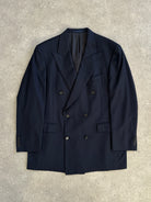Vintage Daniel Cremieux double-breasted blazer in a deep navy tone with a refined pinstripe, crafted from pure Loro Piana wool and tailored for Dillard’s. A structured 1990s silhouette with sharp lapels and understated American luxury detailing.