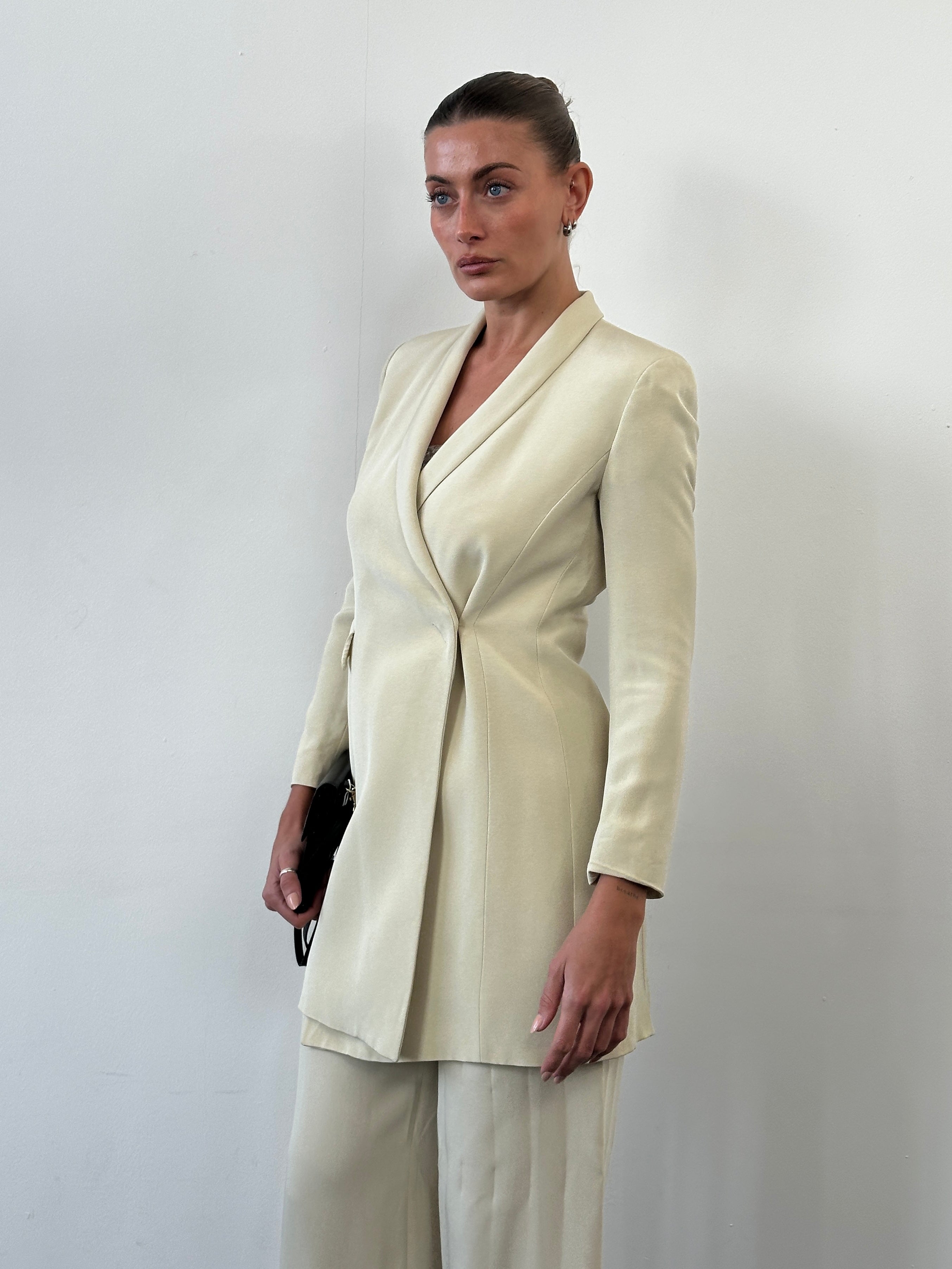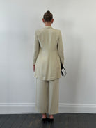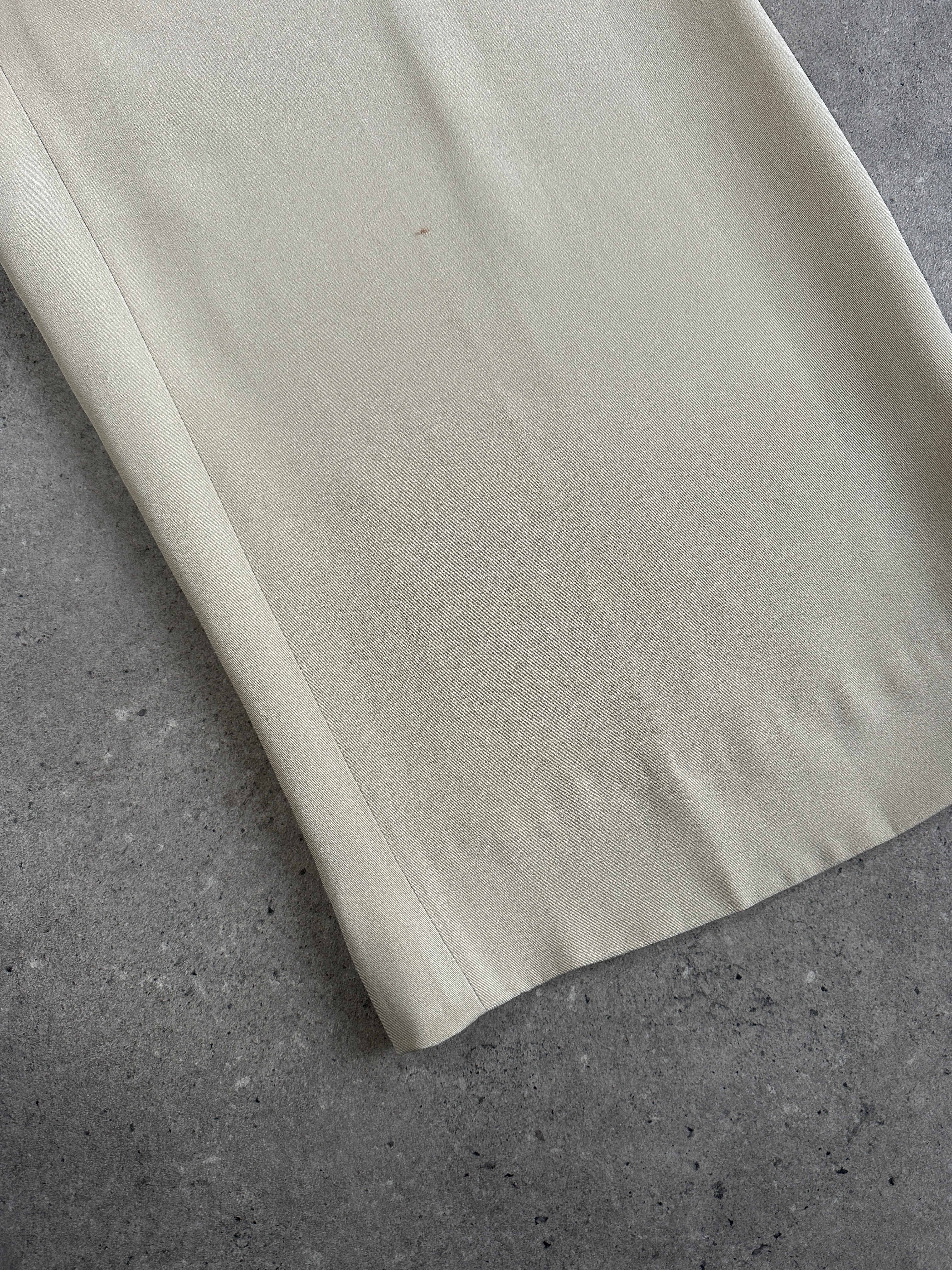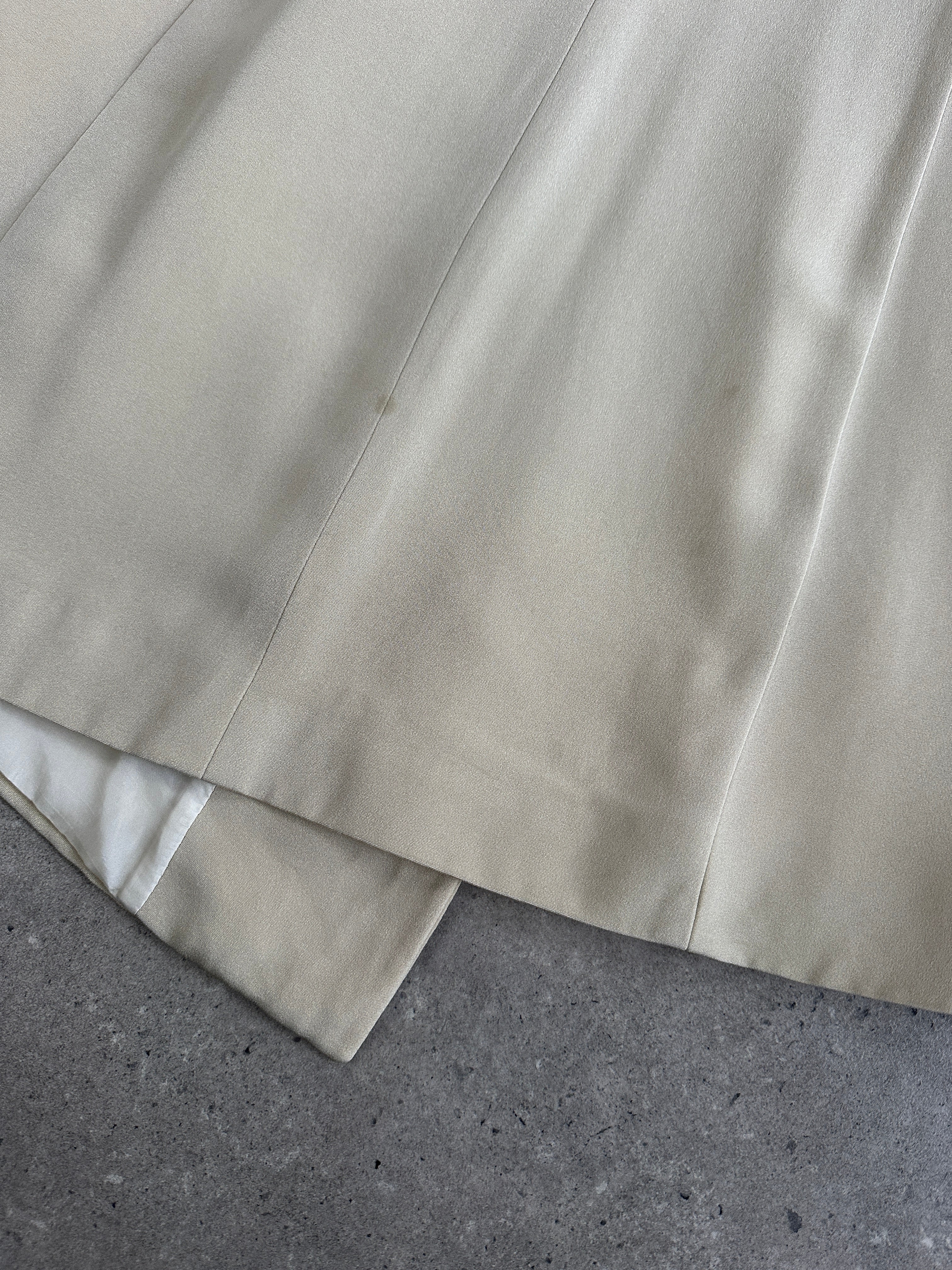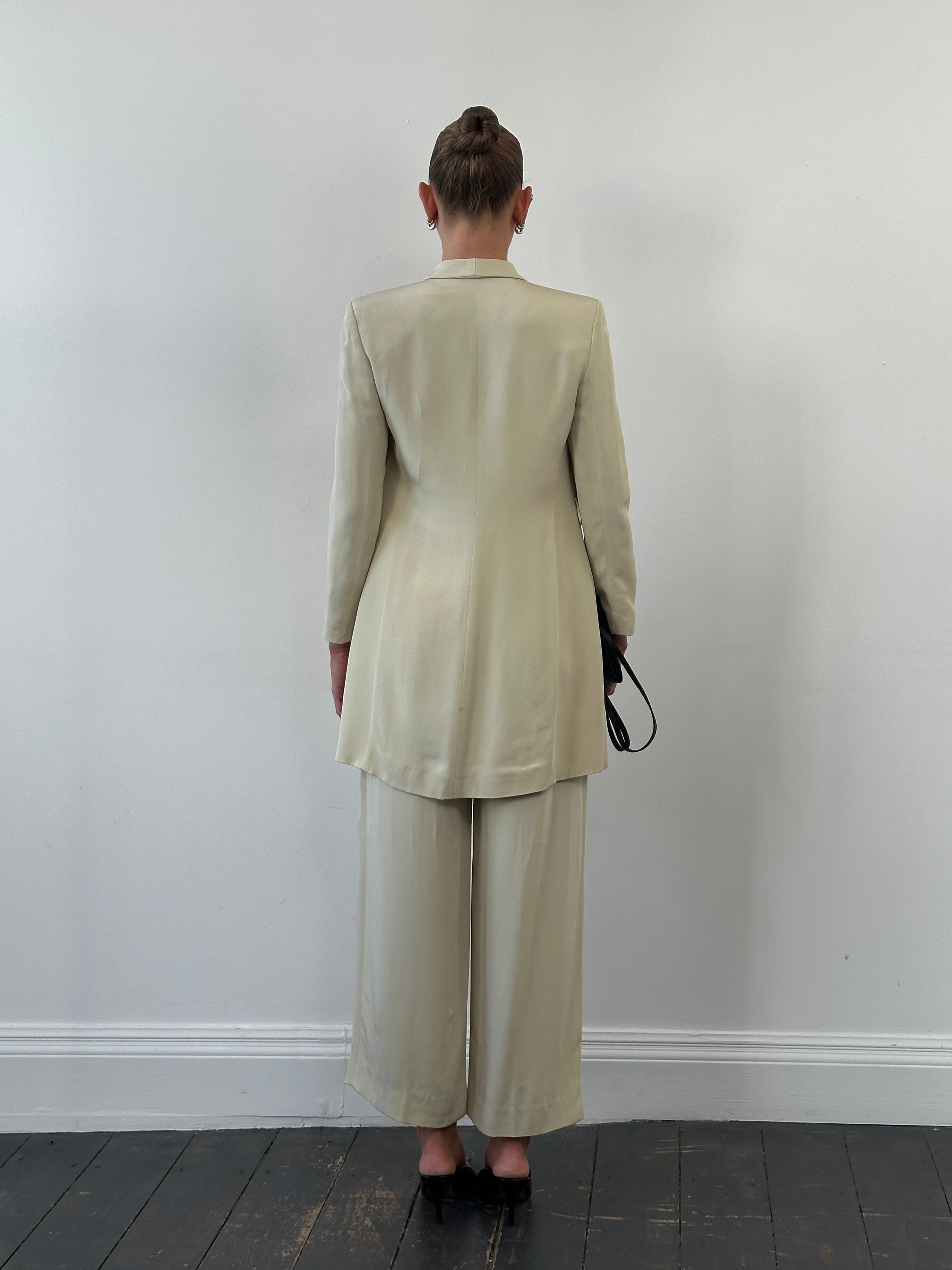 A cream Emporio Armani 1990s two-piece suit featuring a clean fitted blazer paired with wide-leg trousers, crafted in a smooth acetate-viscose fabric with a soft structured drape.