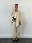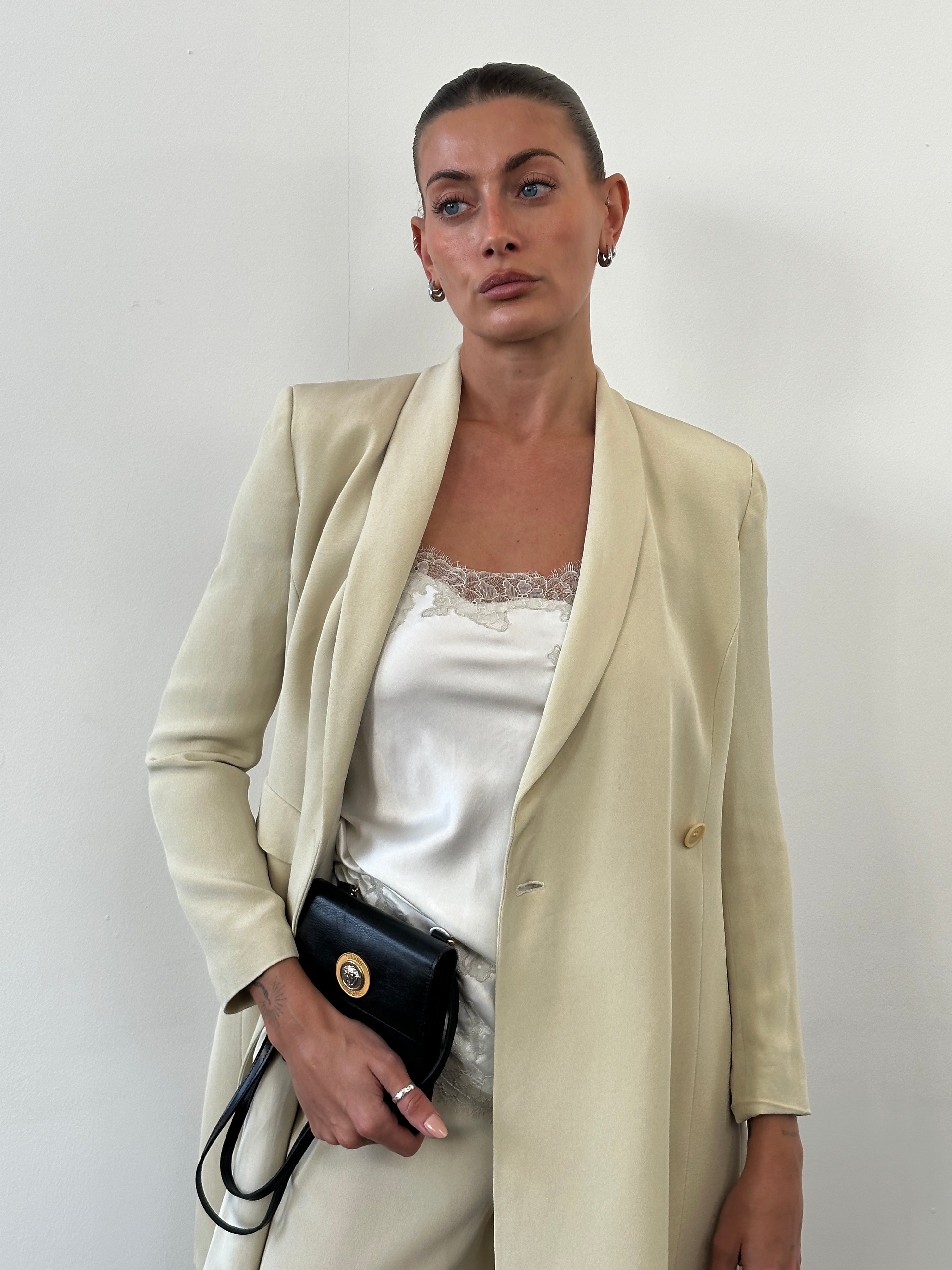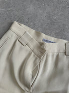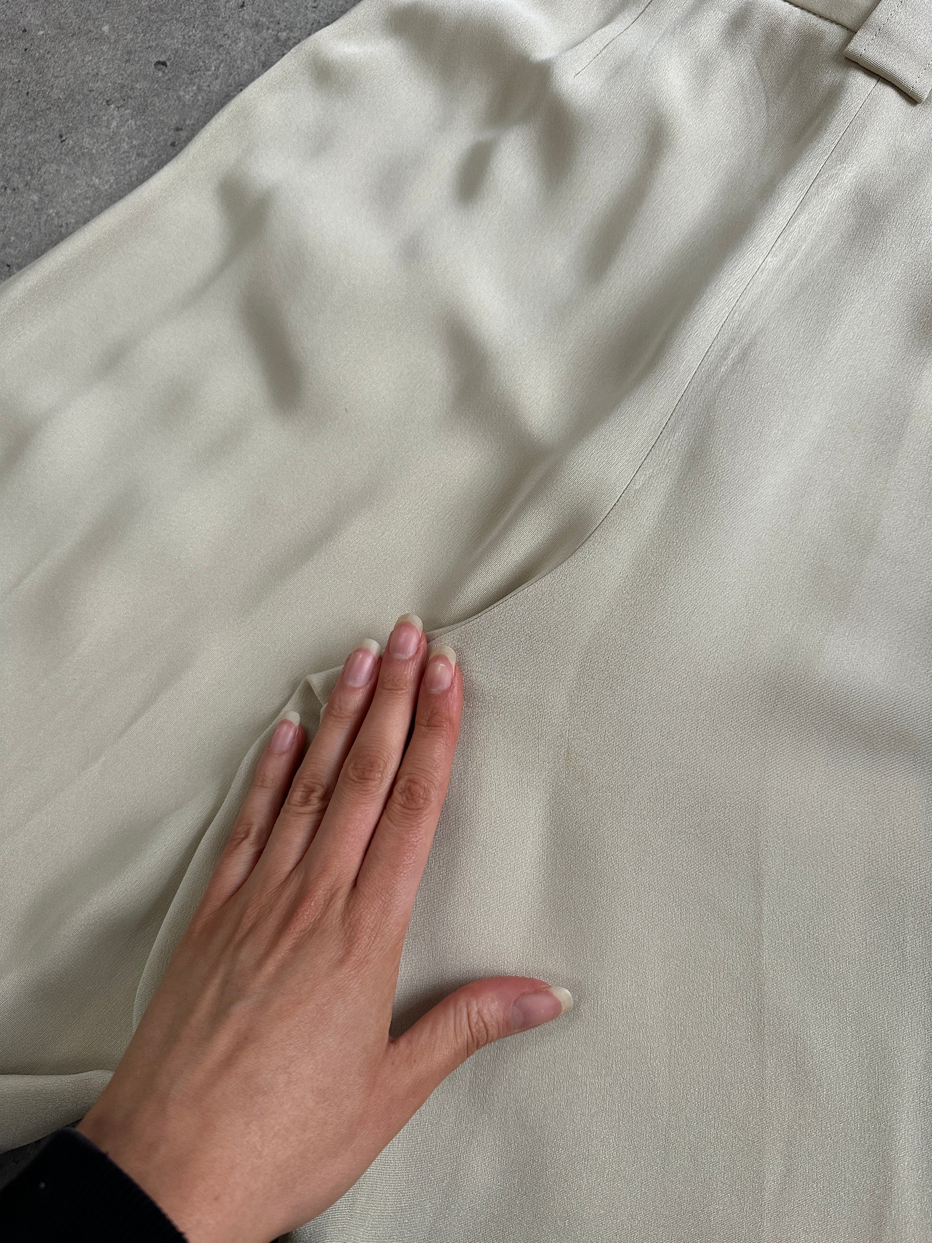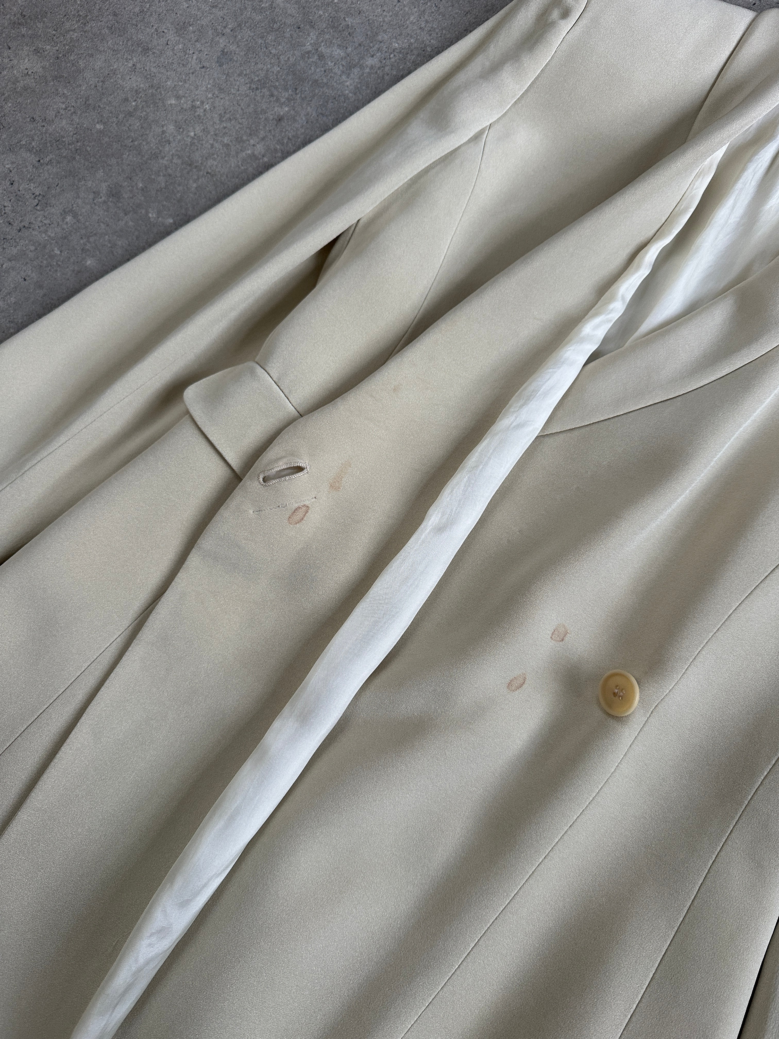 A cream Emporio Armani 1990s two-piece suit featuring a clean fitted blazer paired with wide-leg trousers, crafted in a smooth acetate-viscose fabric with a soft structured drape.