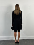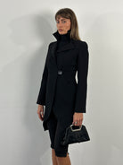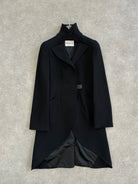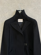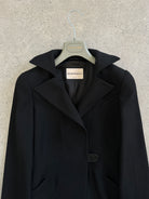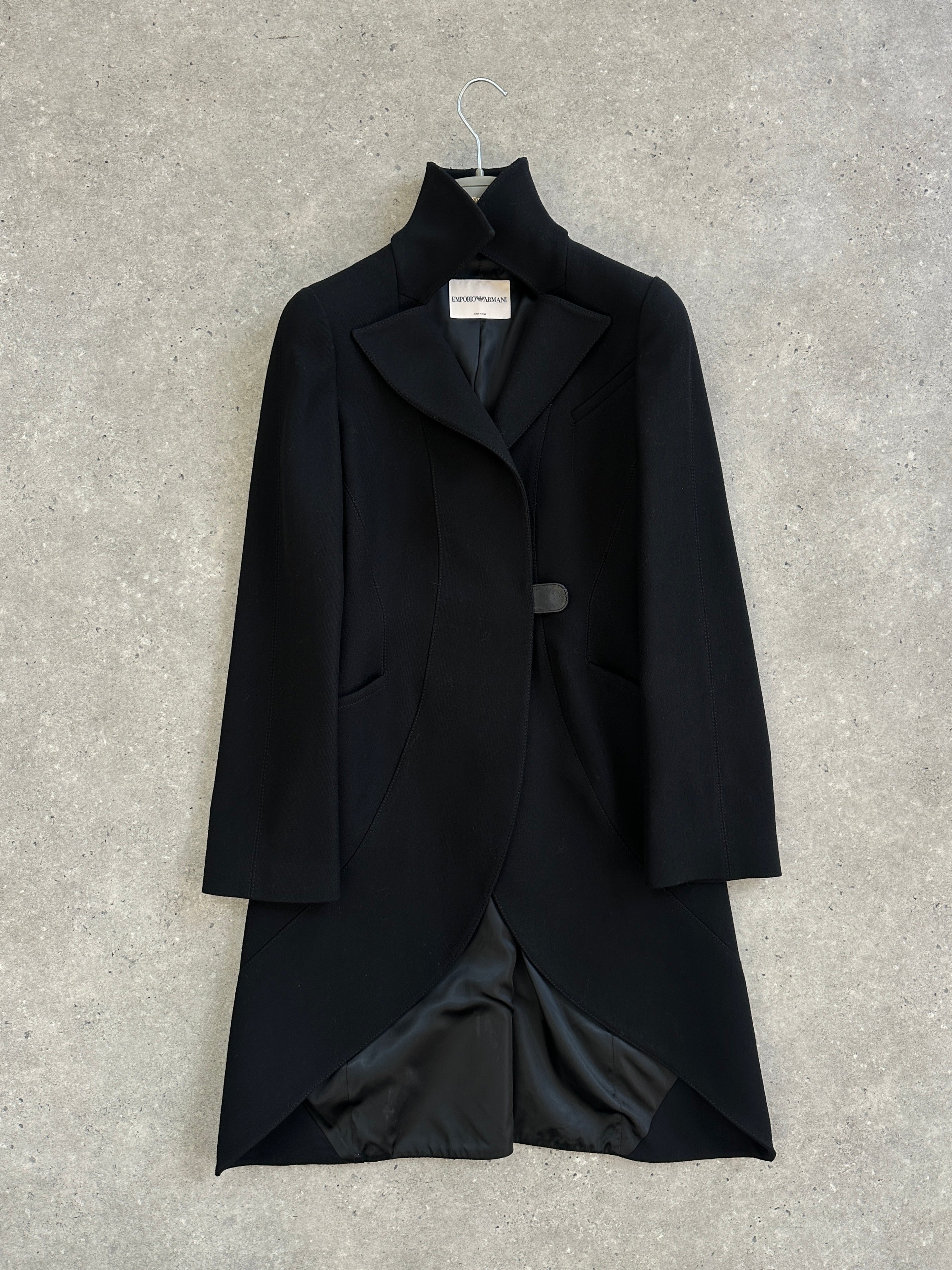 A vintage 2000s Emporio Armani tailored coat in a deep black tone with sculpted seams and a curved silhouette. A refined minimalist shape with quiet luxury detailing.