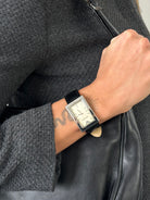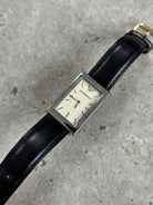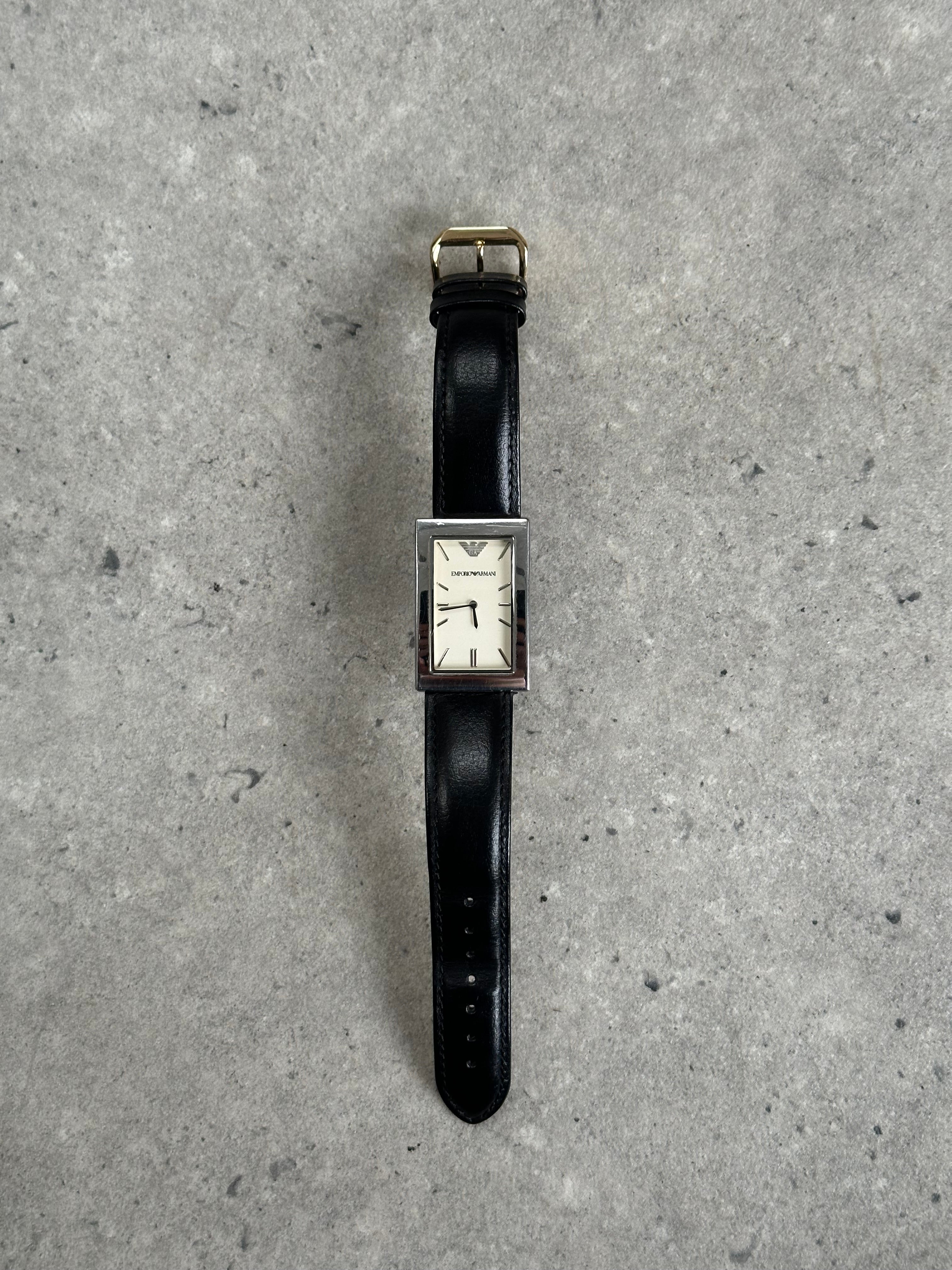 Emporio Armani vintage rectangular silver tone stainless steel watch with a minimalist cream dial and applied baton hour markers. Finished with a black leather strap and subtle Emporio Armani eagle at 12, presented with original branded case.