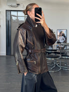A vintage 1980s brown leather belted jacket with a rich patina, lightly distressed finish and an elasticated back that shapes the waist. Features quilted lining and asymmetric front fastening.