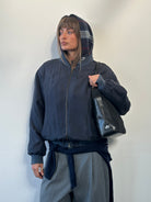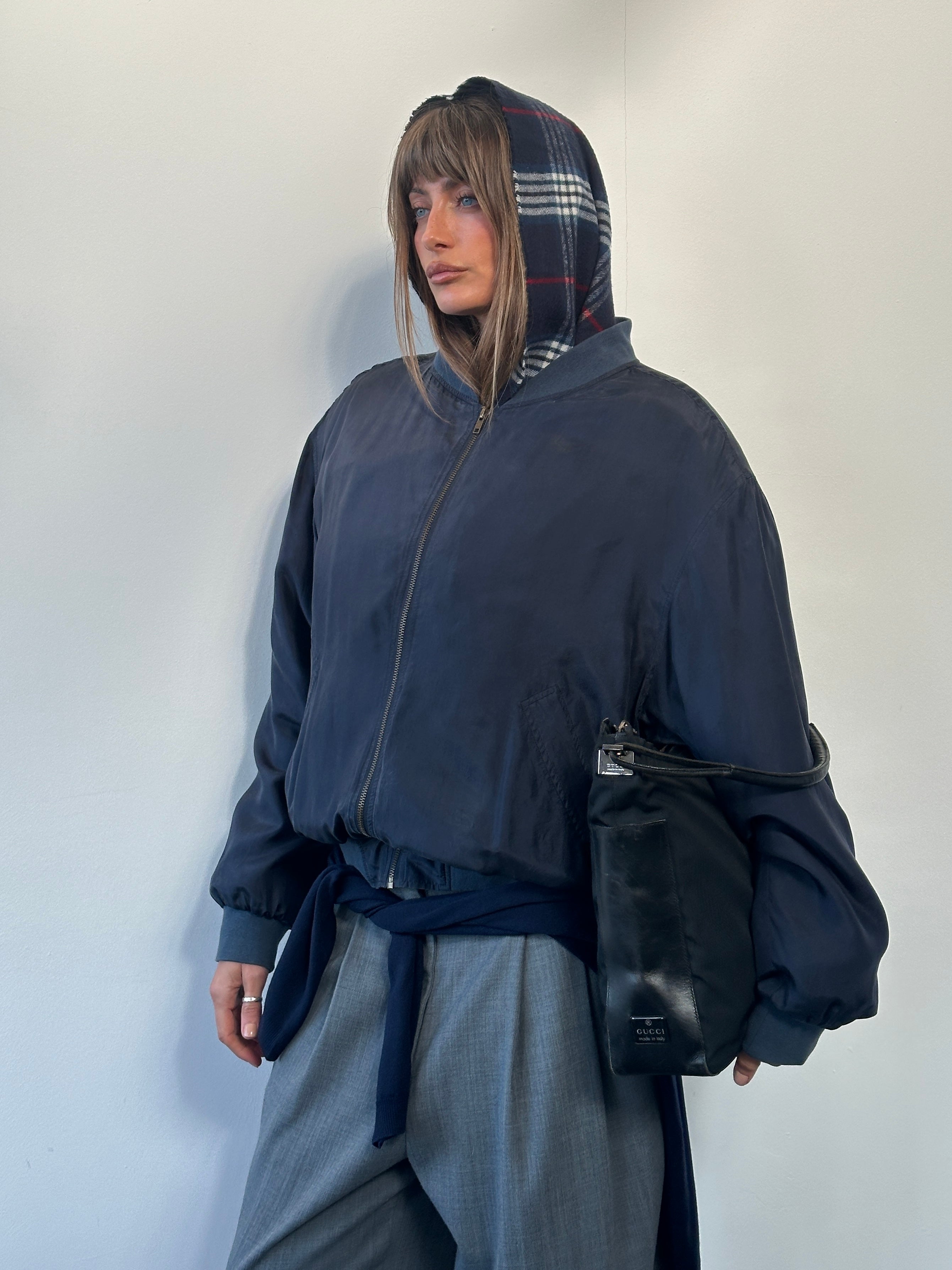 A vintage 1990s Italian lightweight navy silk bomber jacket with subtle shoulder structure, rib trims and a bronze zip. A refined minimal silhouette with a soft drape.