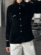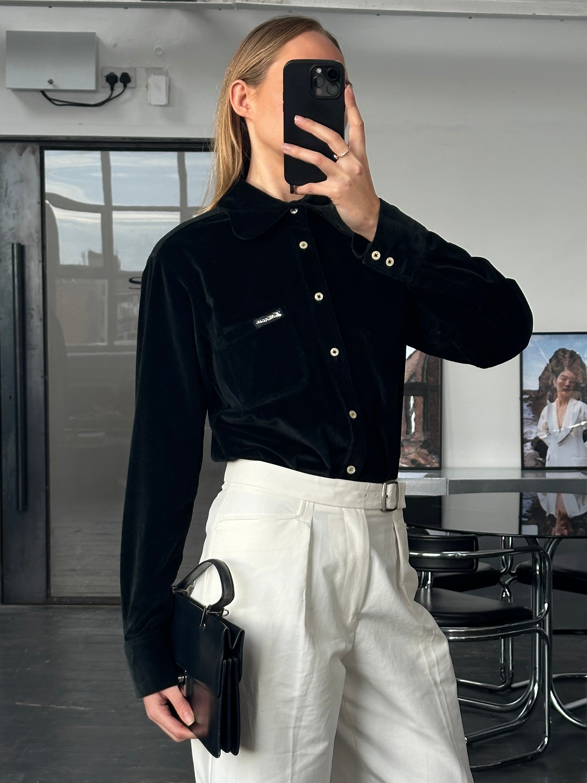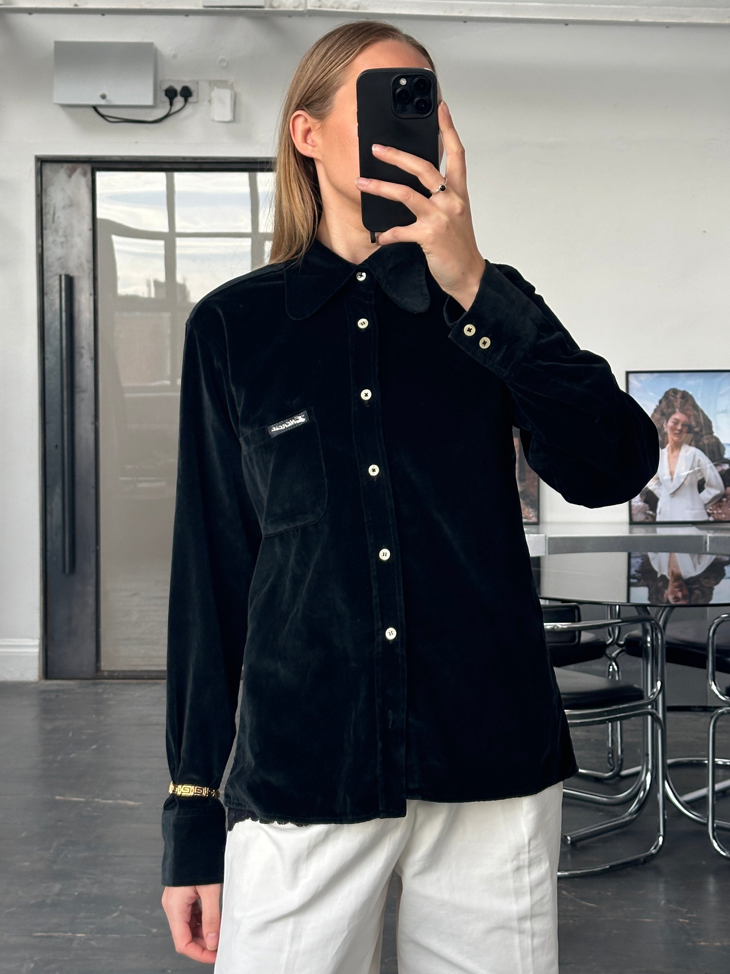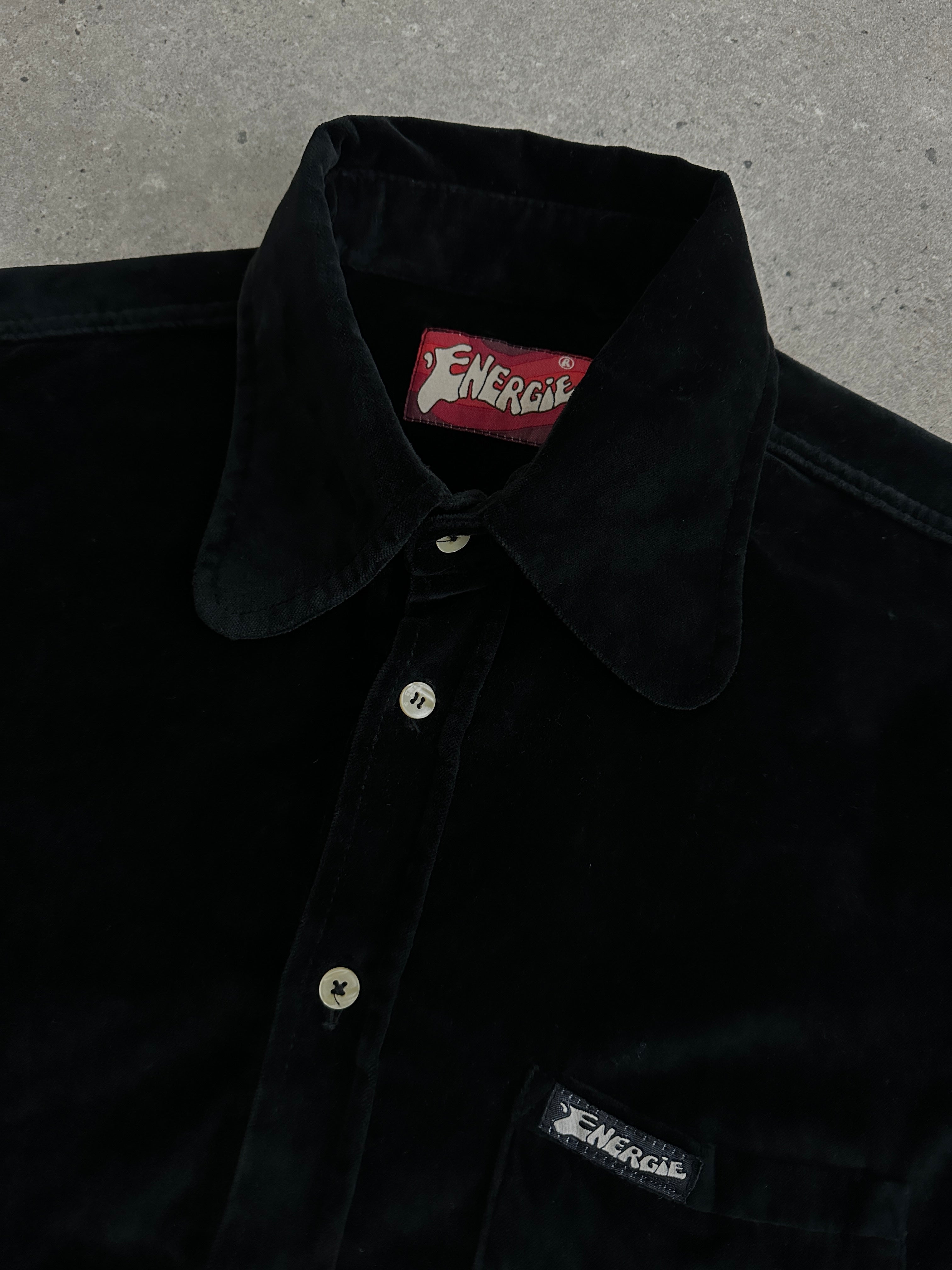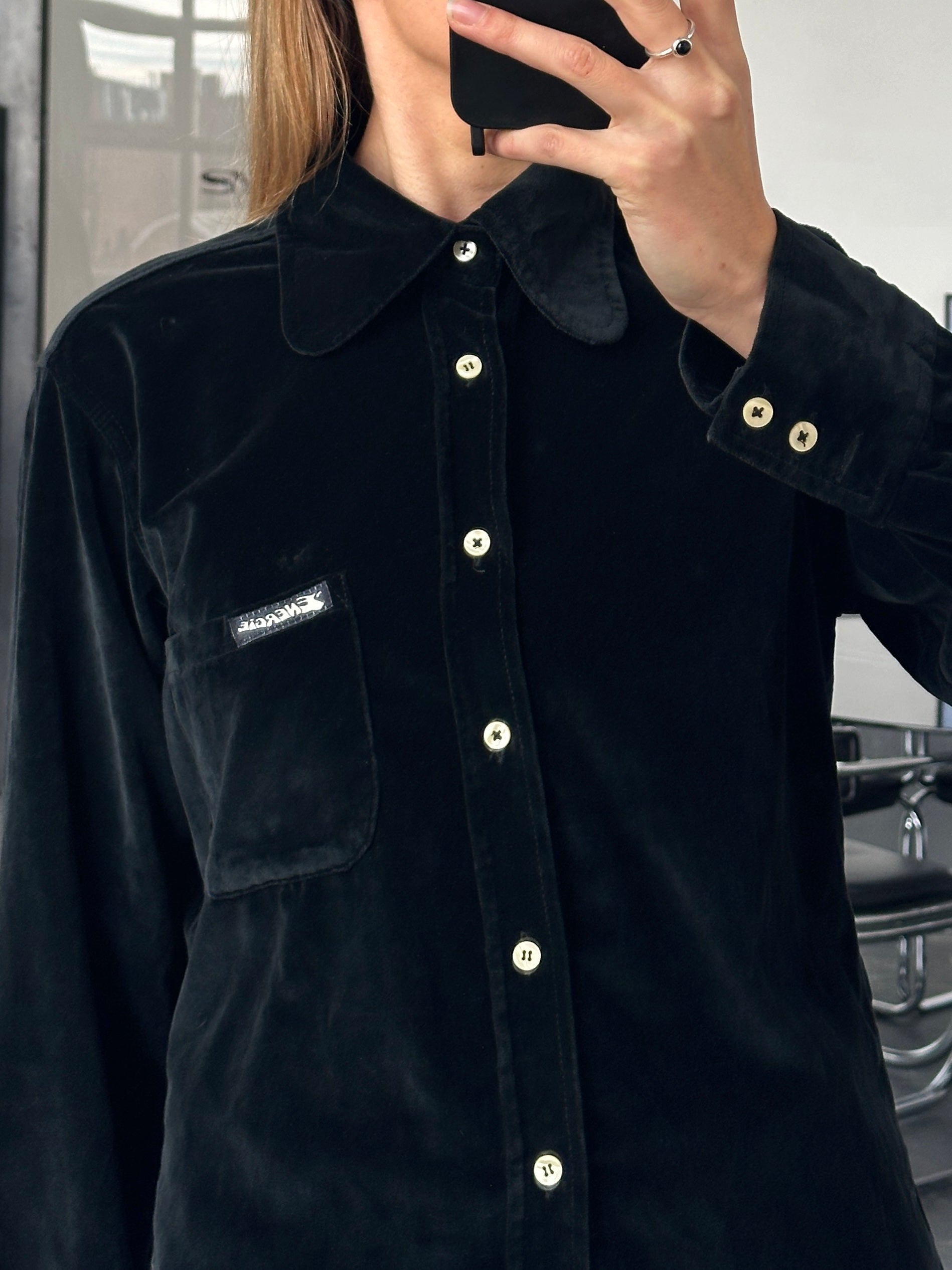 Italian vintage minimal black velvet shirt from Energie with a soft drape and rounded collar. A clean Italian 1990s piece that brings a refined, understated mood to contemporary styling.