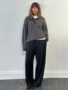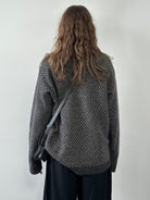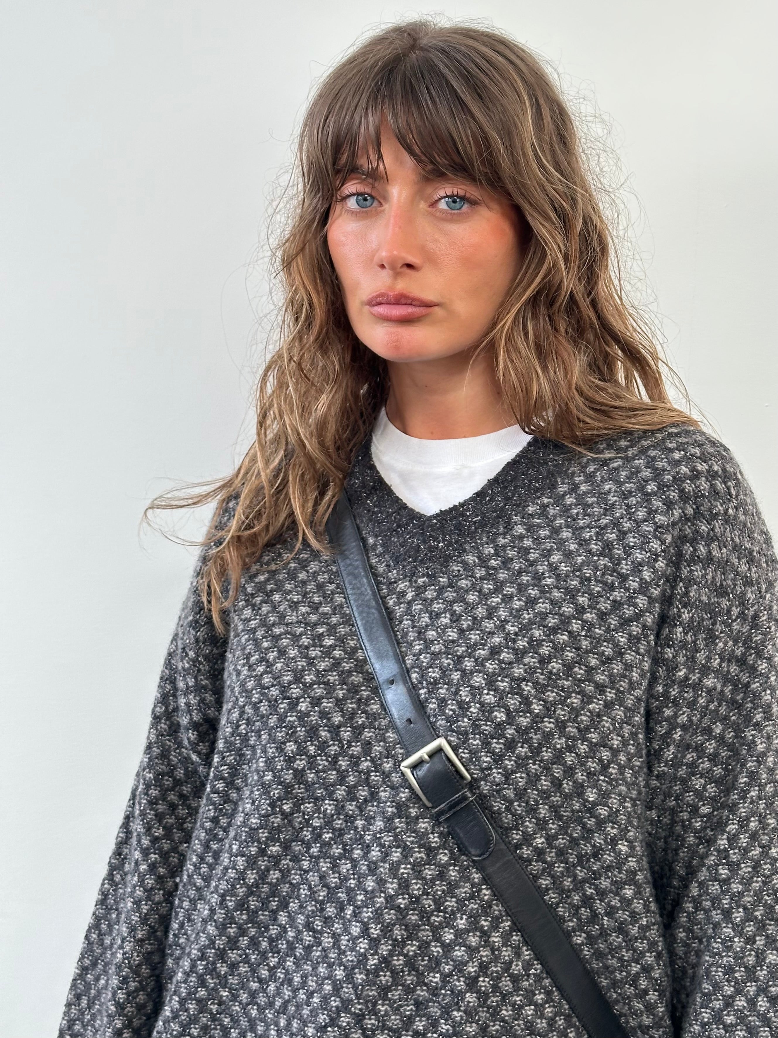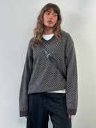 Italian vintage grey textured V neck jumper by Stefanel, crafted in Italy with a soft speckled knit and relaxed silhouette. The blended composition gives structure while maintaining a lightweight drape, typical of refined 1990s Italian knitwear.