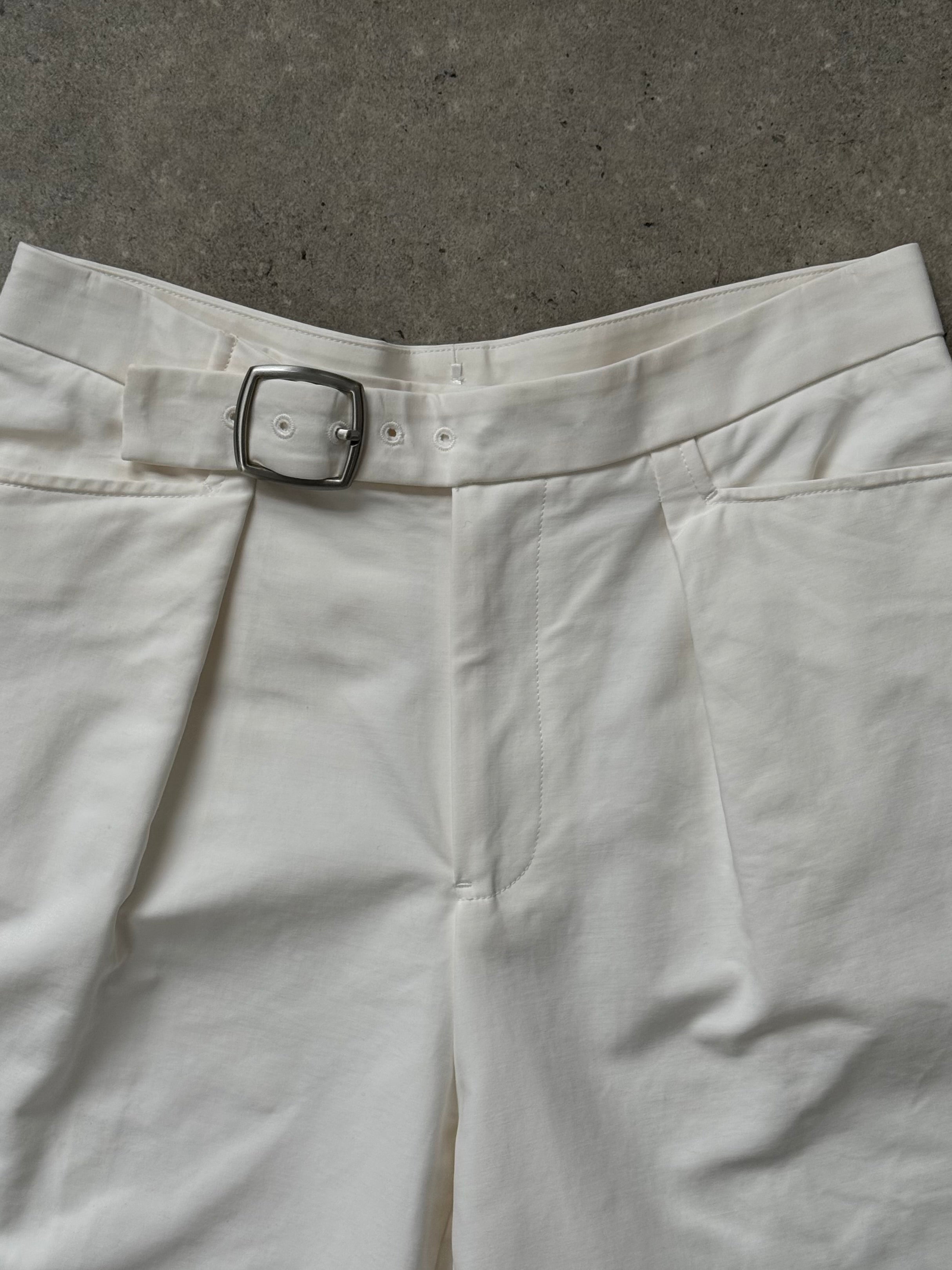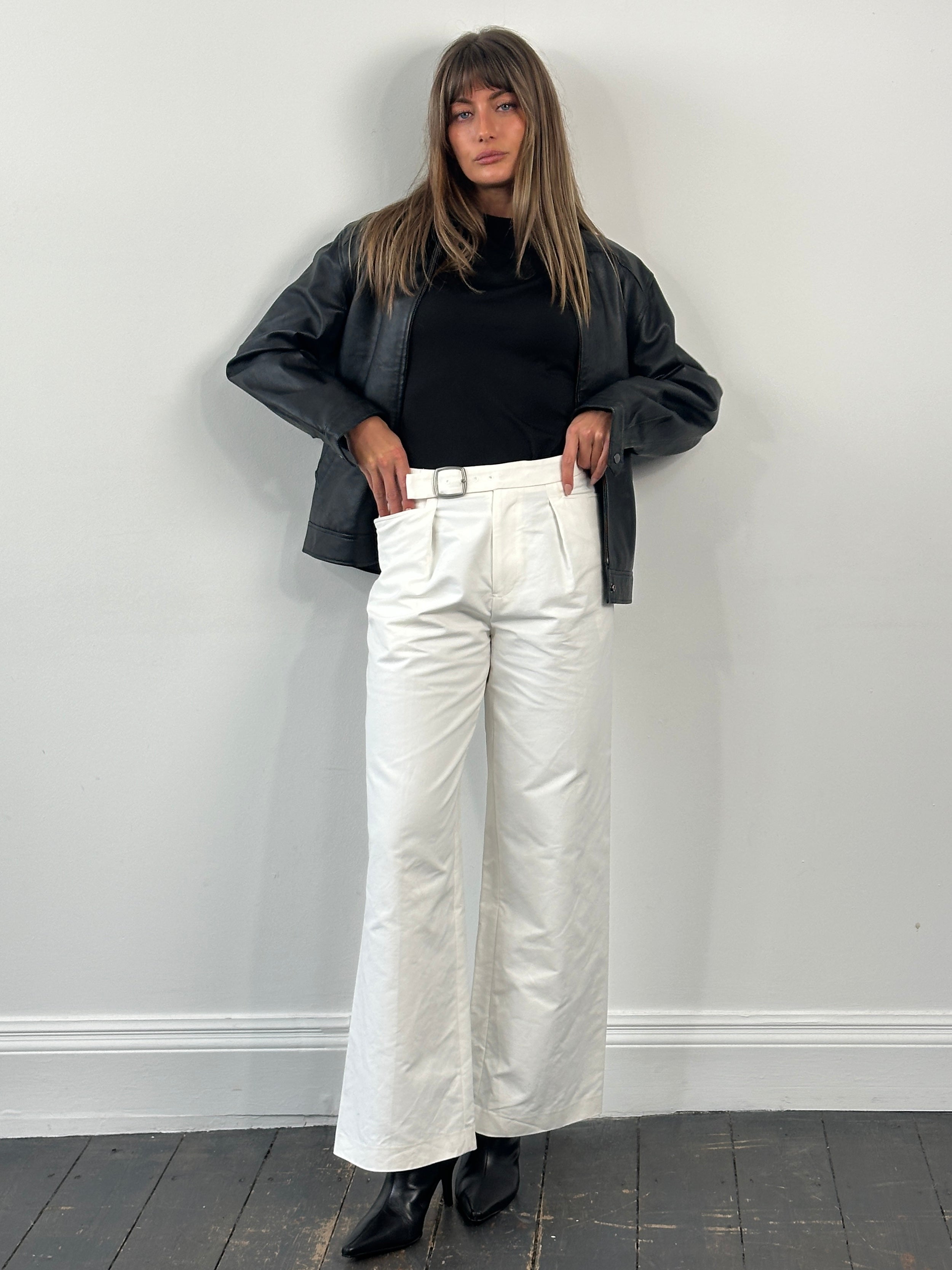 Jil Sander AW 2023 off white high waisted wide leg trousers in structured cotton with a clean tailored drape. Designed with a statement buckle waistband and sharp front pleat, finished in a crisp 100% cotton fabric with a smooth matte handle that reflects Jil Sander’s minimalist aesthetic.