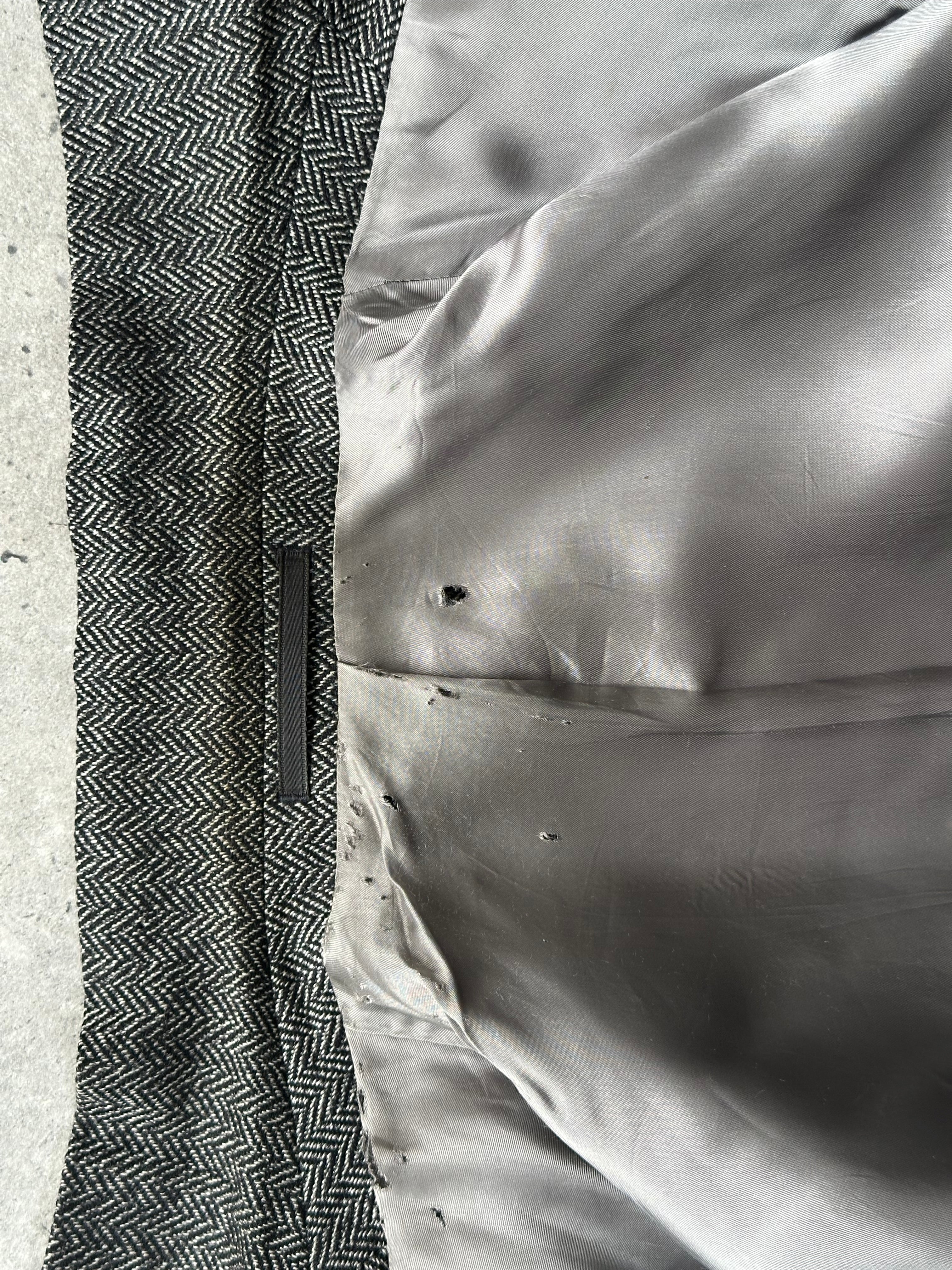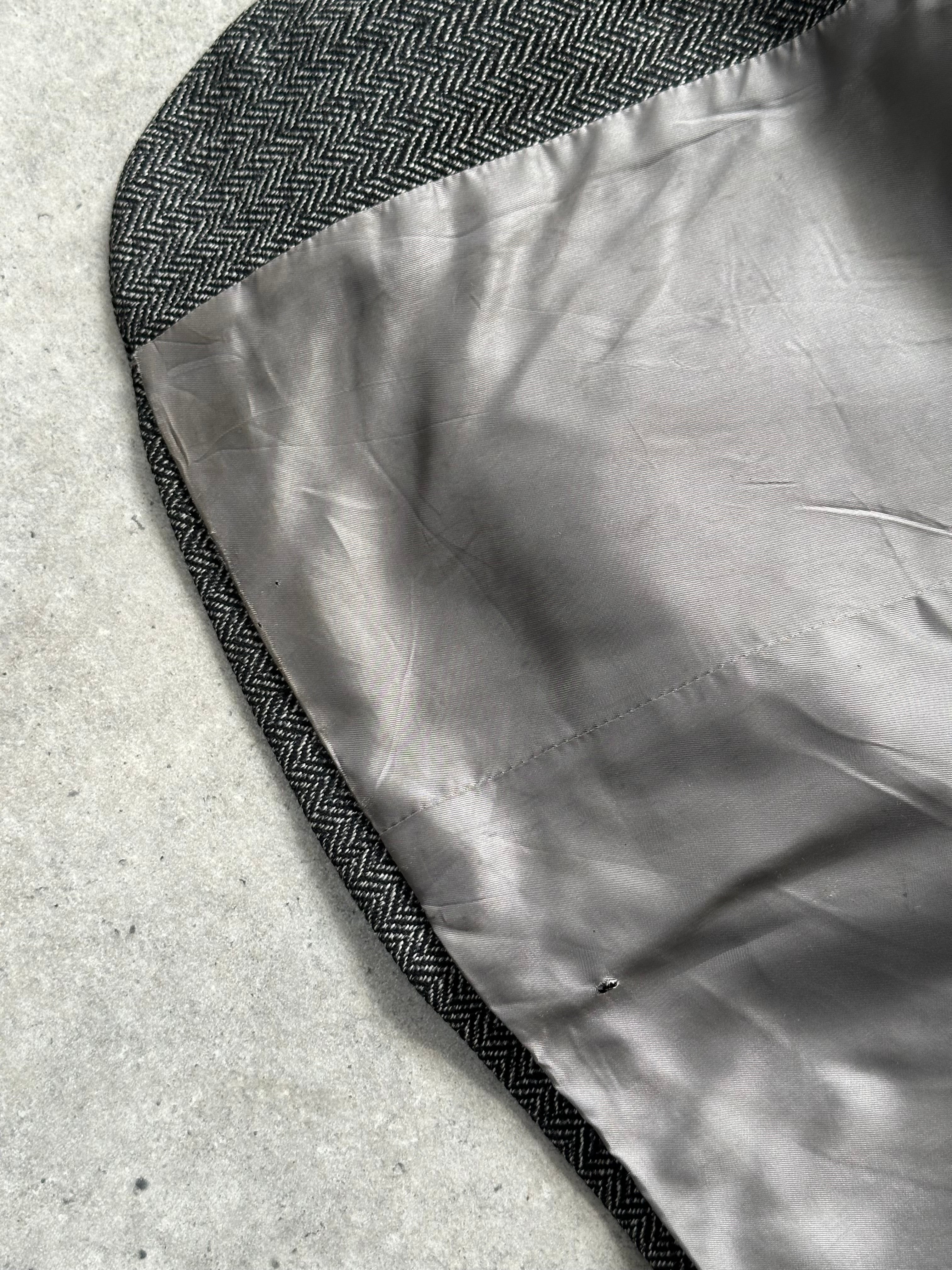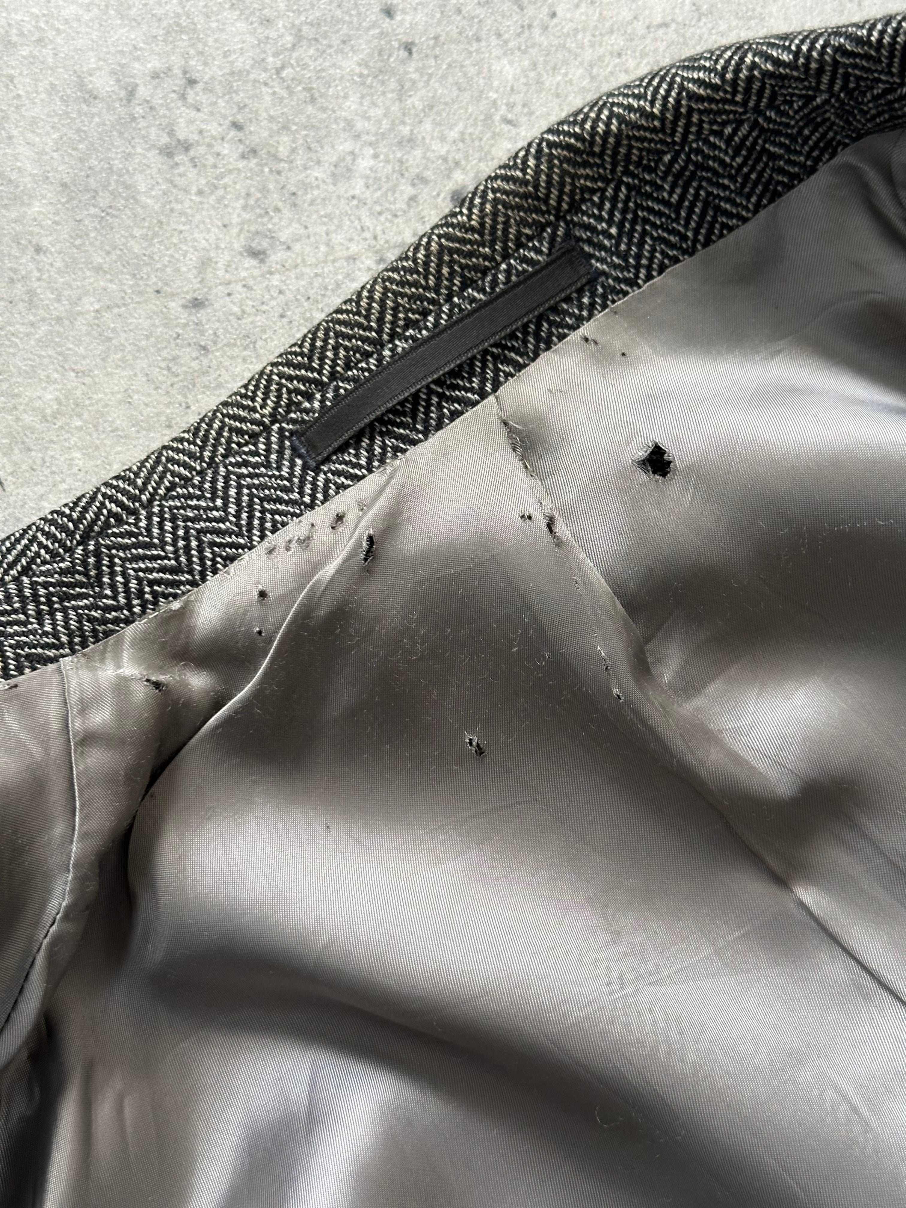 A grey Loro Piana 1990s single breasted blazer in a refined herringbone weave, crafted from a luxurious wool and cashmere blend. The silhouette is softly structured with a classic notch lapel and flap pockets, offering a timeless tailored profile in a textured neutral tone. Original brand label has been removed.