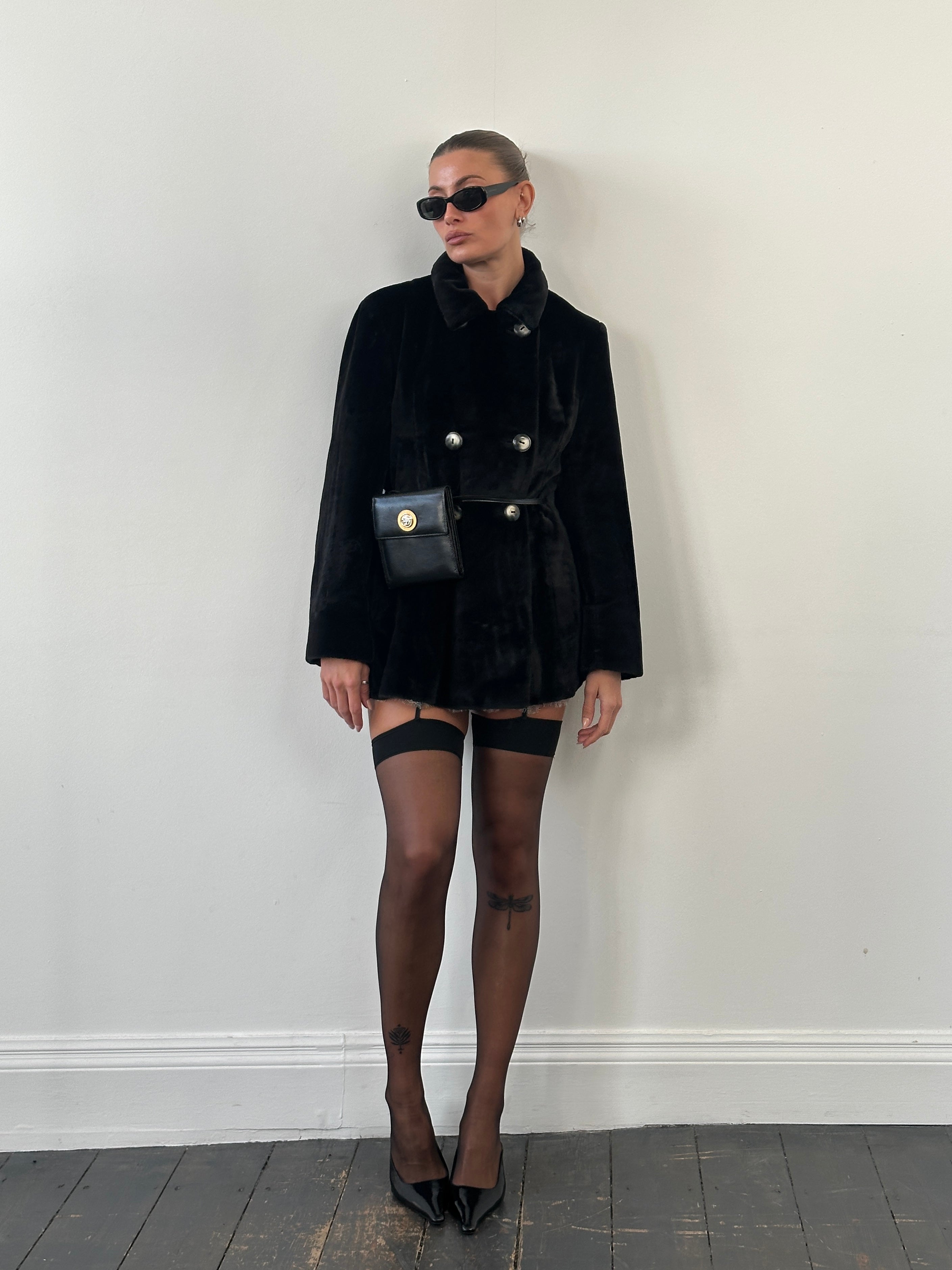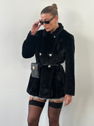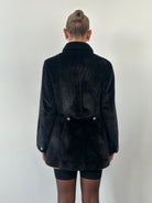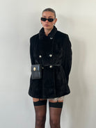 A black 1990s Italian vintage faux fur coat by Sportmax, designed with a structured double breasted front and a soft matte faux fur finish. Cut with a subtly boxy silhouette and a slightly cropped length.