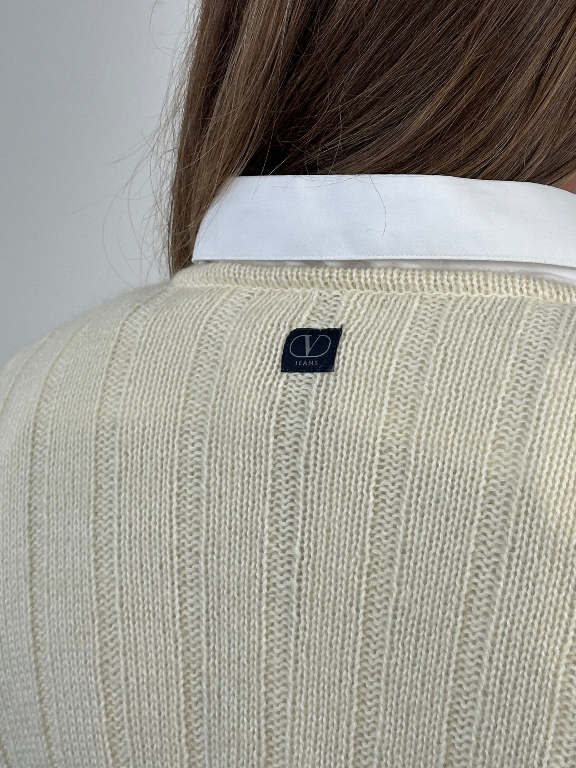 A vintage 1990s Valentino Jeans cream ribbed knit jumper with a soft fluffy handle and deep V neckline. Designed with a fitted silhouette, elongated sleeves and tonal back logo patch for subtle branding.