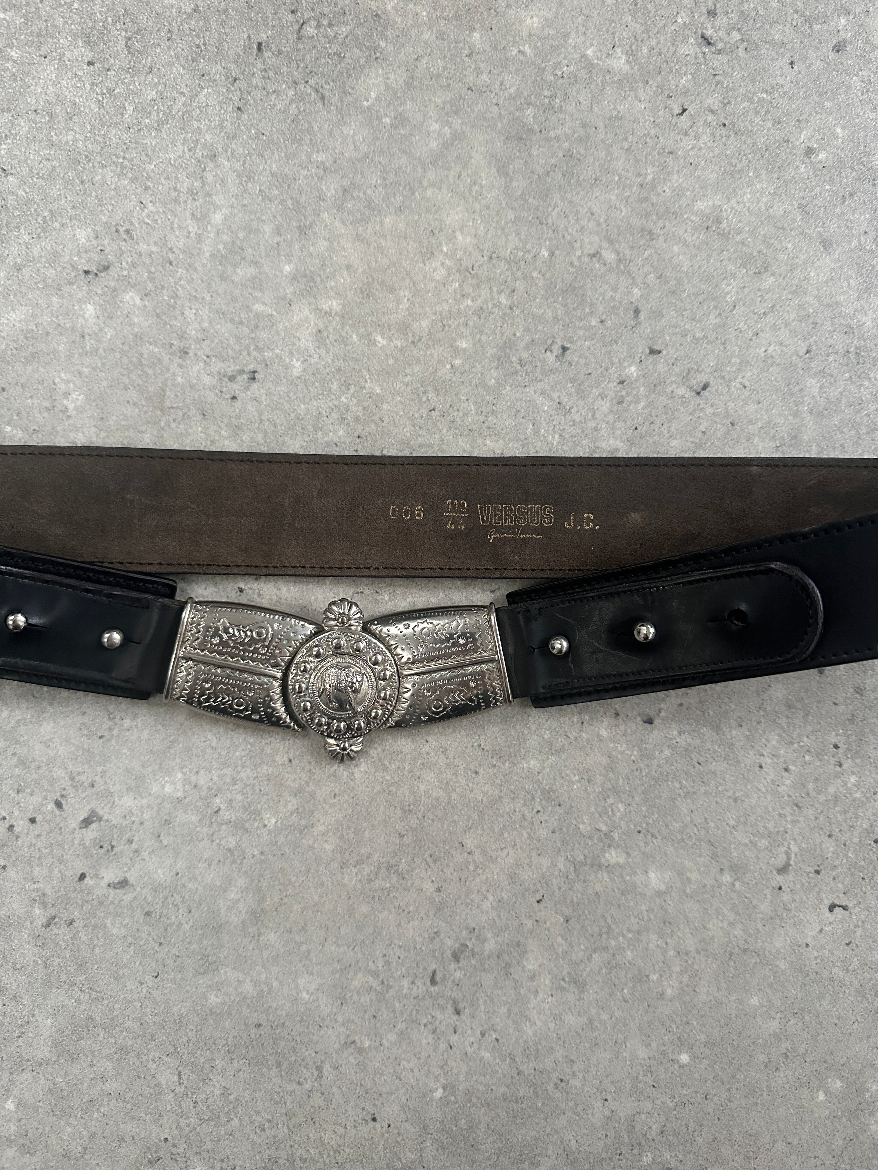 A rare Versus Gianni Versace leather belt featuring an ornate silver panther buckle with engraved detailing. A statement archival accessory with strong sculptural character and signature 1990s Versus hardware.