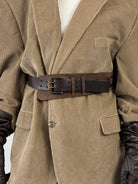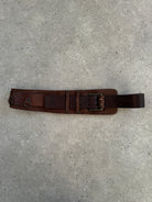 Vintage 1980s brown leather belt with braided detailing and aged metal hardware. A sculptural utilitarian accessory with character and structure.