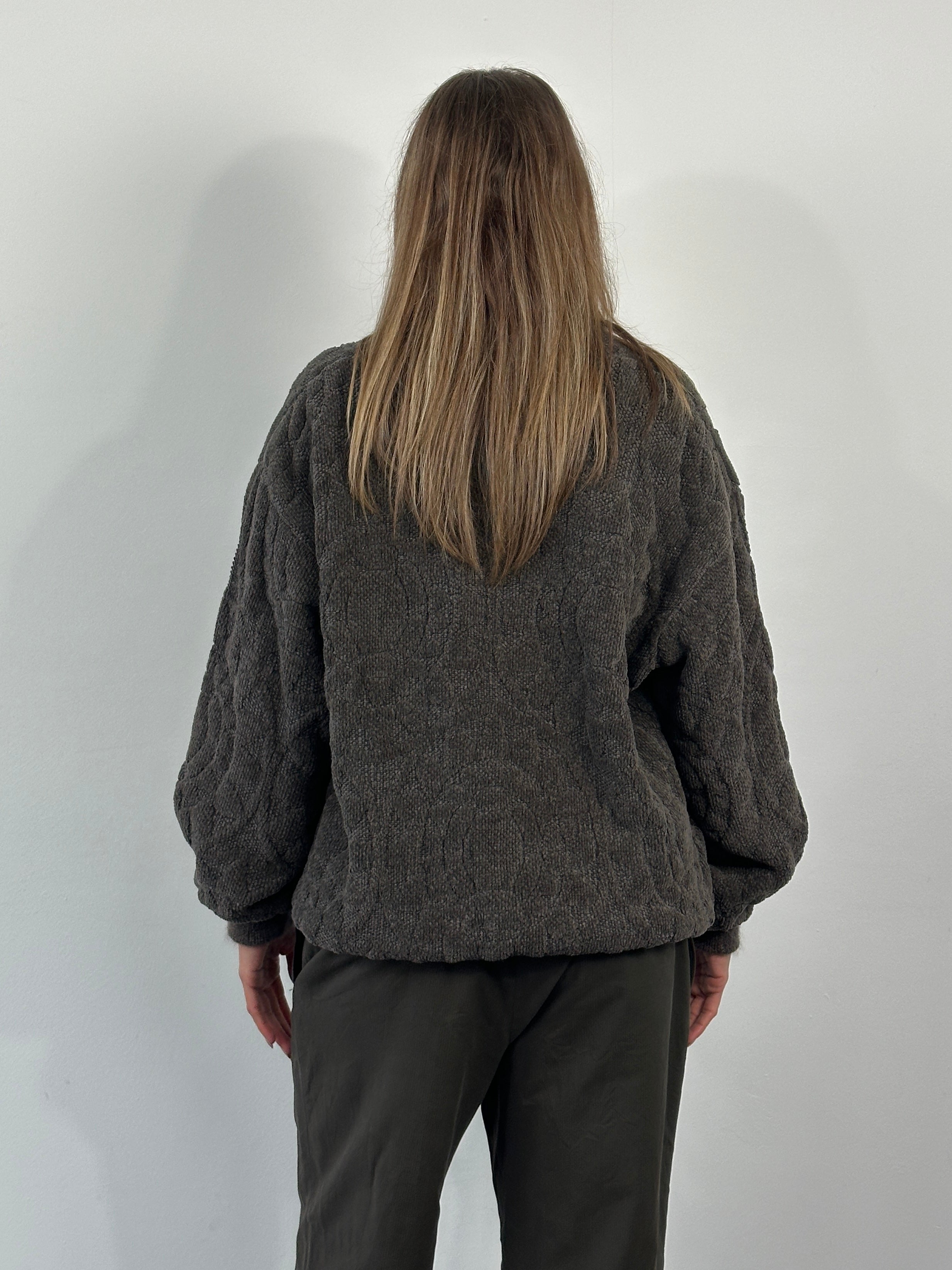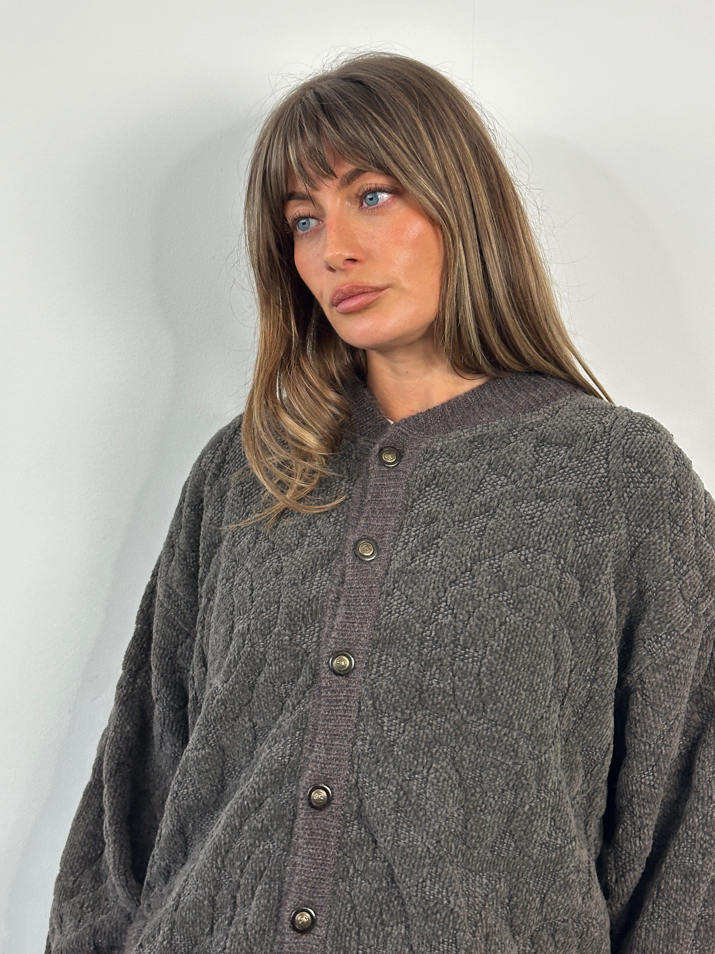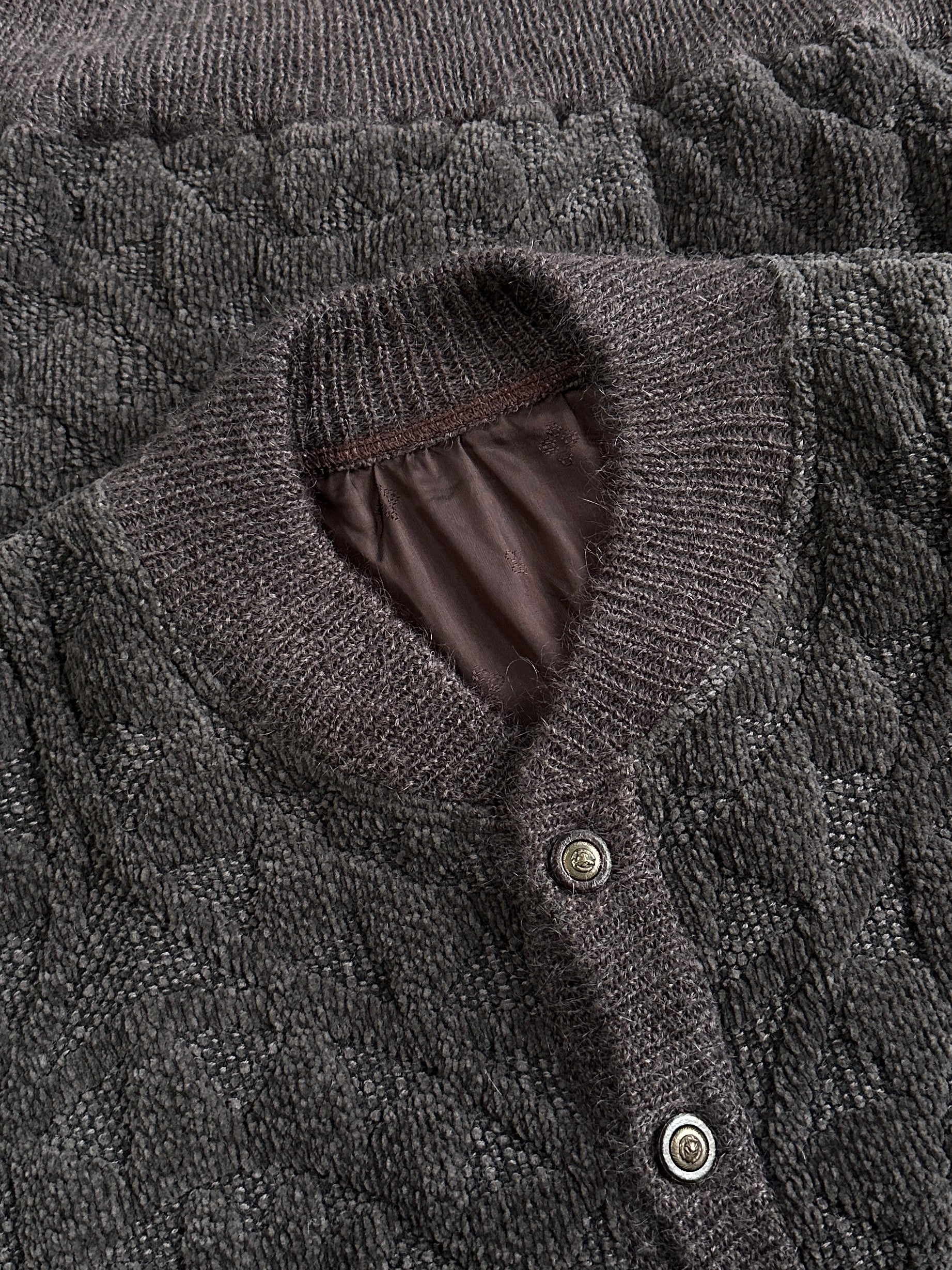 Vintage brown knitted bomber jacket with a textured knit pattern and classic button-through front. Designed with a relaxed silhouette, ribbed neckline, cuffs and hem, and lightly padded interior for structure. A versatile 1980s piece offering understated vintage texture in a deep brown tone.
