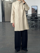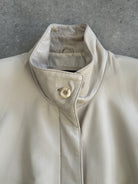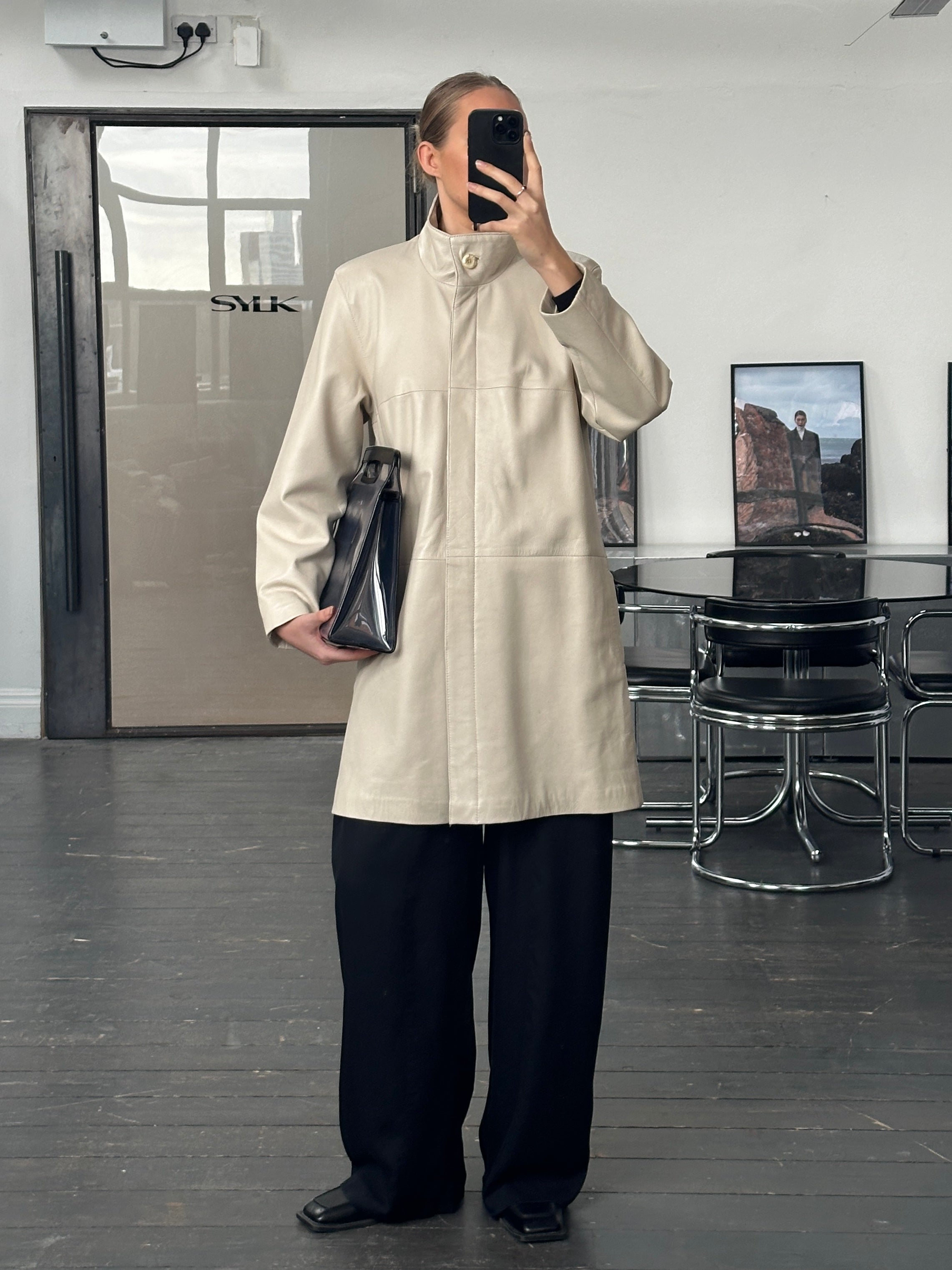 A vintage 1990s Milan Leather high neck trench in a soft cream tone with a concealed placket. A minimal elongated silhouette that feels chic and quietly refined.