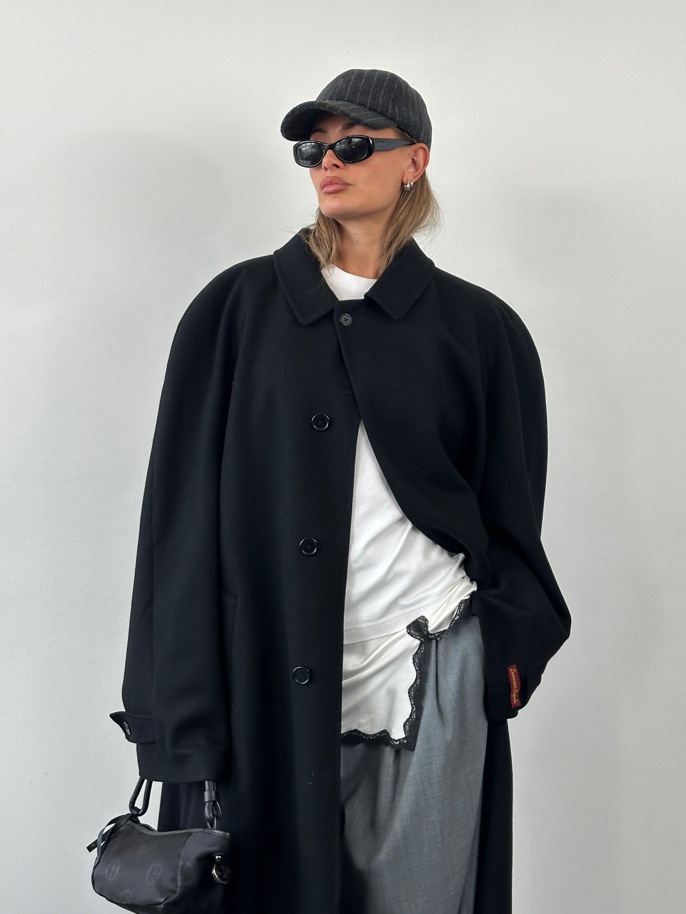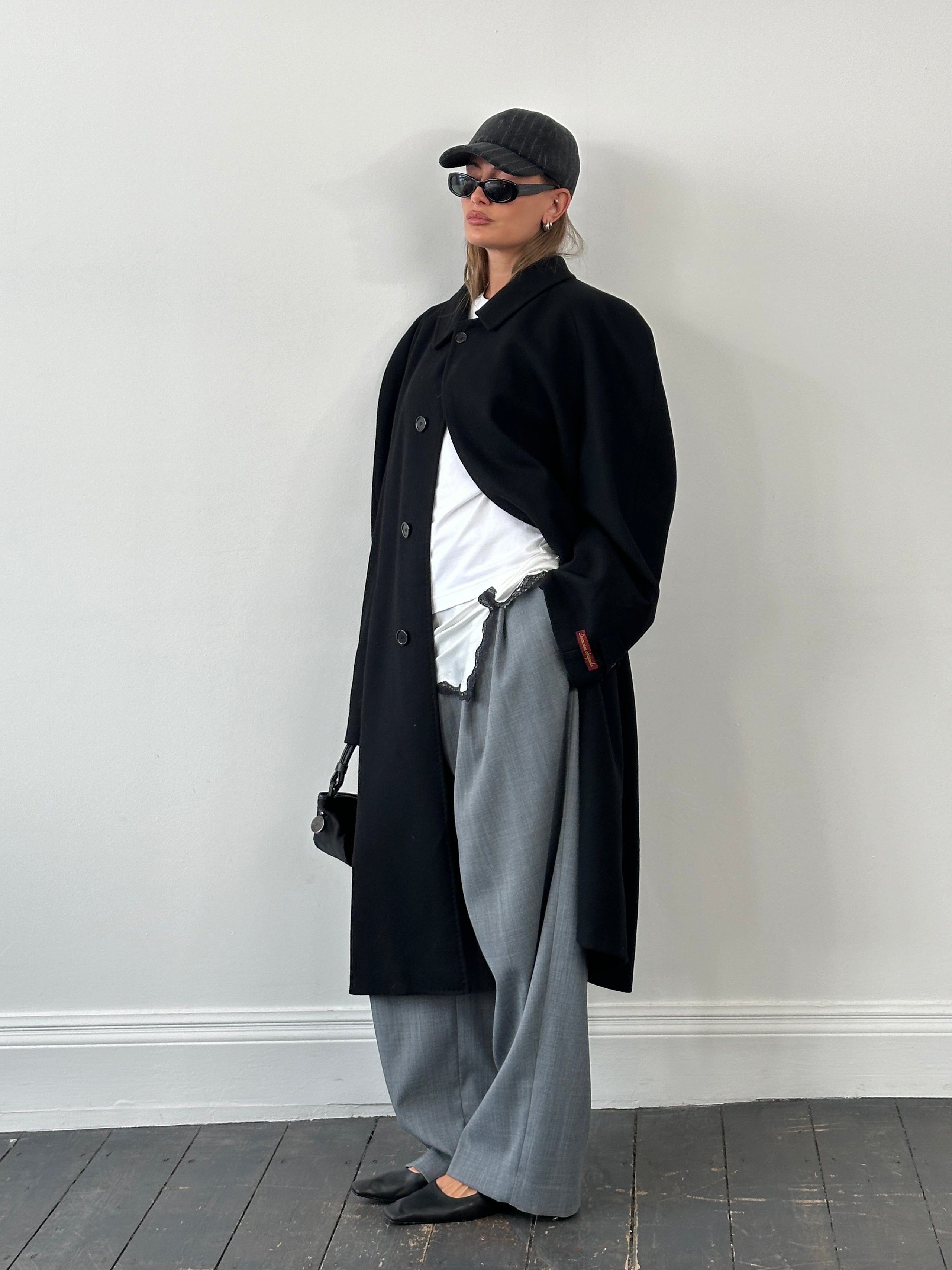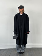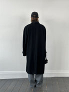 Vintage 1990s Italian overcoat in black, crafted from wool and cashmere by Gruppo Sartoriale, made in Italy with a clean tailored silhouette. Features refined topstitch detailing and a minimal front for a sharp outerwear profile.