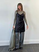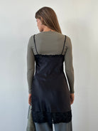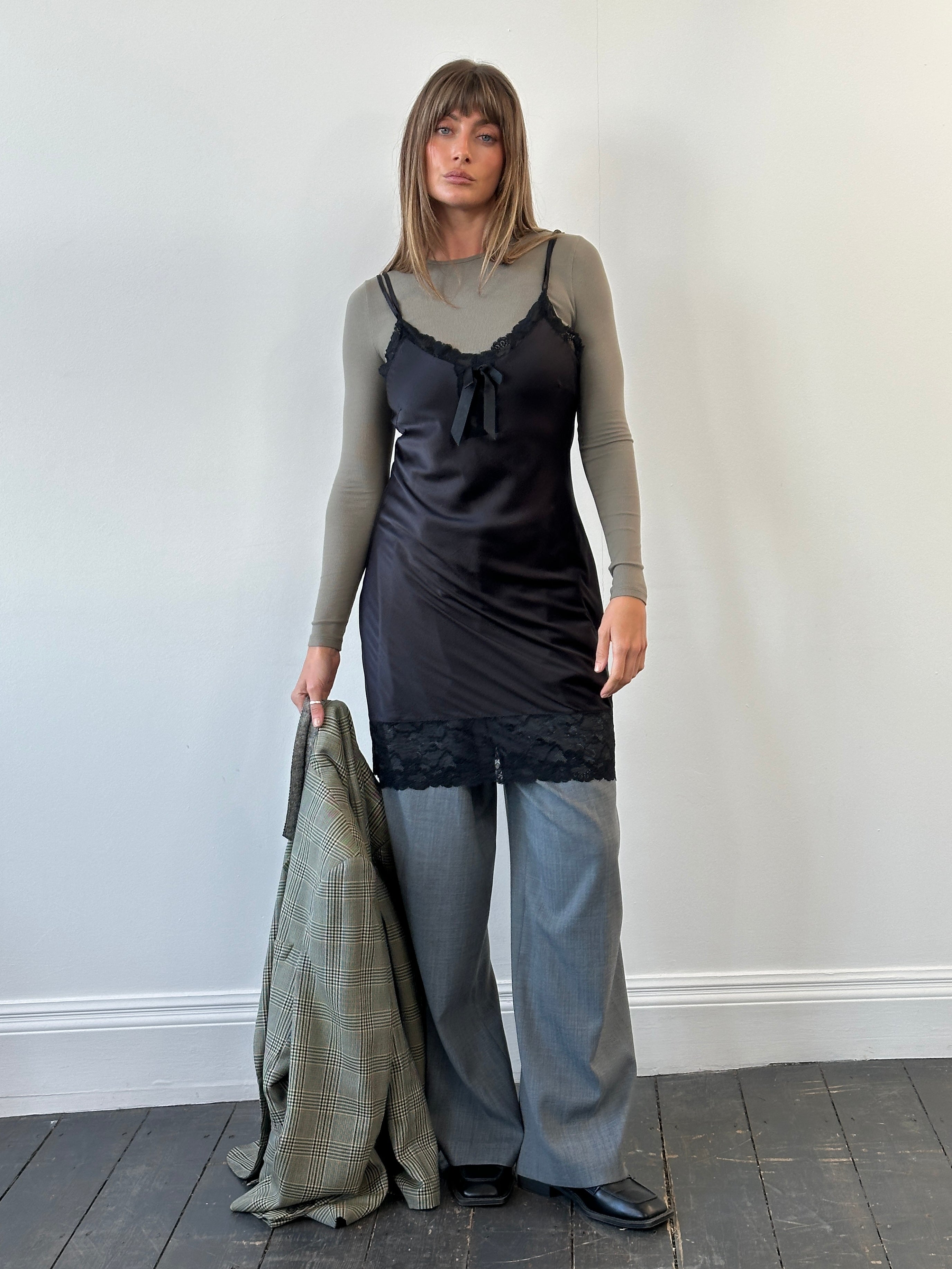 Vintage black minimalist slip dress with delicate lace trims and a subtle ribbon bow detail. Clean lines with a soft drape, typical of 1990s Bon A’Parte lingerie styling.