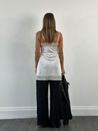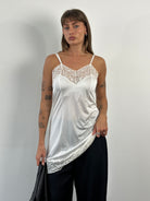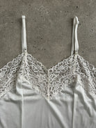 A vintage 1990s white mini slip dress designed with delicate lace detailing through the neckline and hem, finished with adjustable shoulder straps for a soft, feminine fit. Lightweight and fluid with classic lingerie-inspired styling.