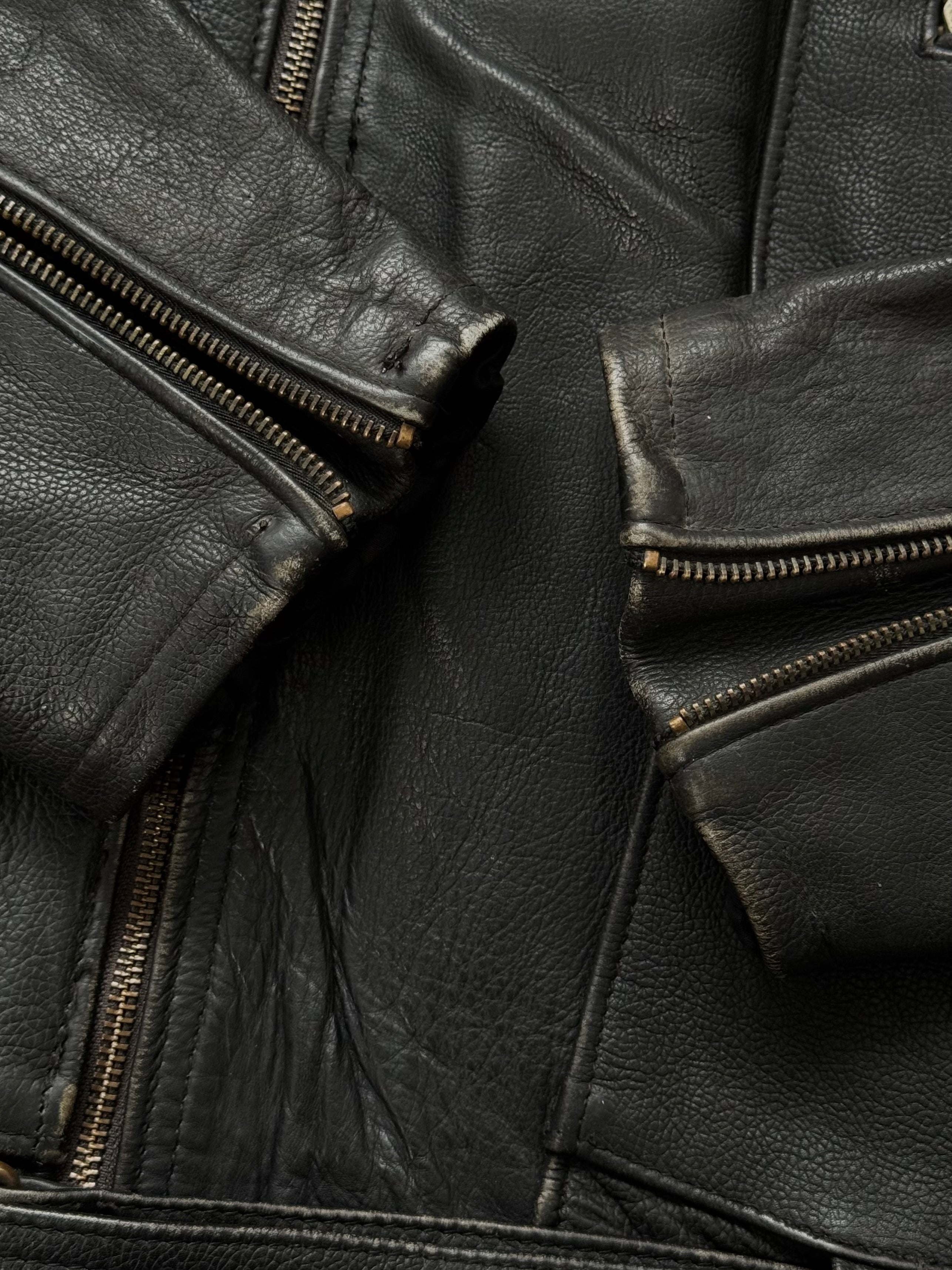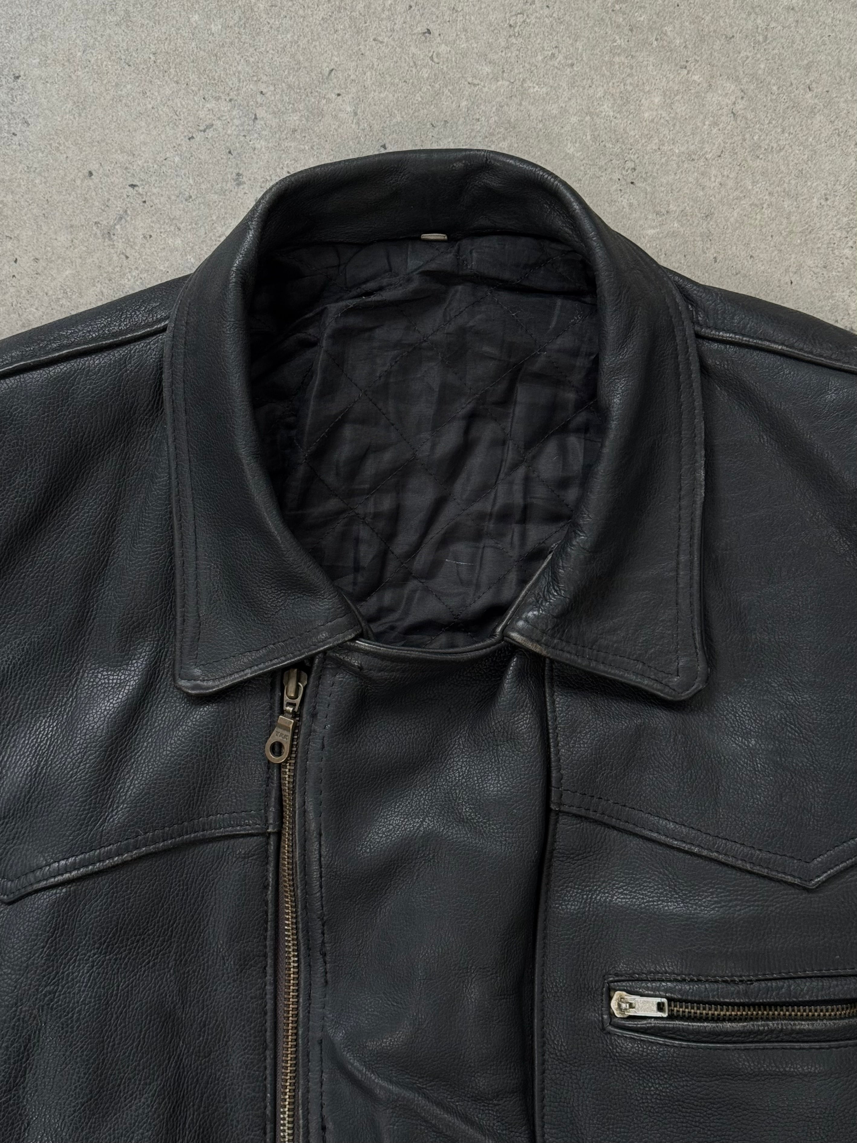 A vintage 1990s black heavyweight leather jacket with structured shoulders, western style yoke detailing and a zip front. Designed with multiple zip pockets, a belted waist and elasticated back panel for shape, finished with zip cuffs and a quilted lining for added weight.