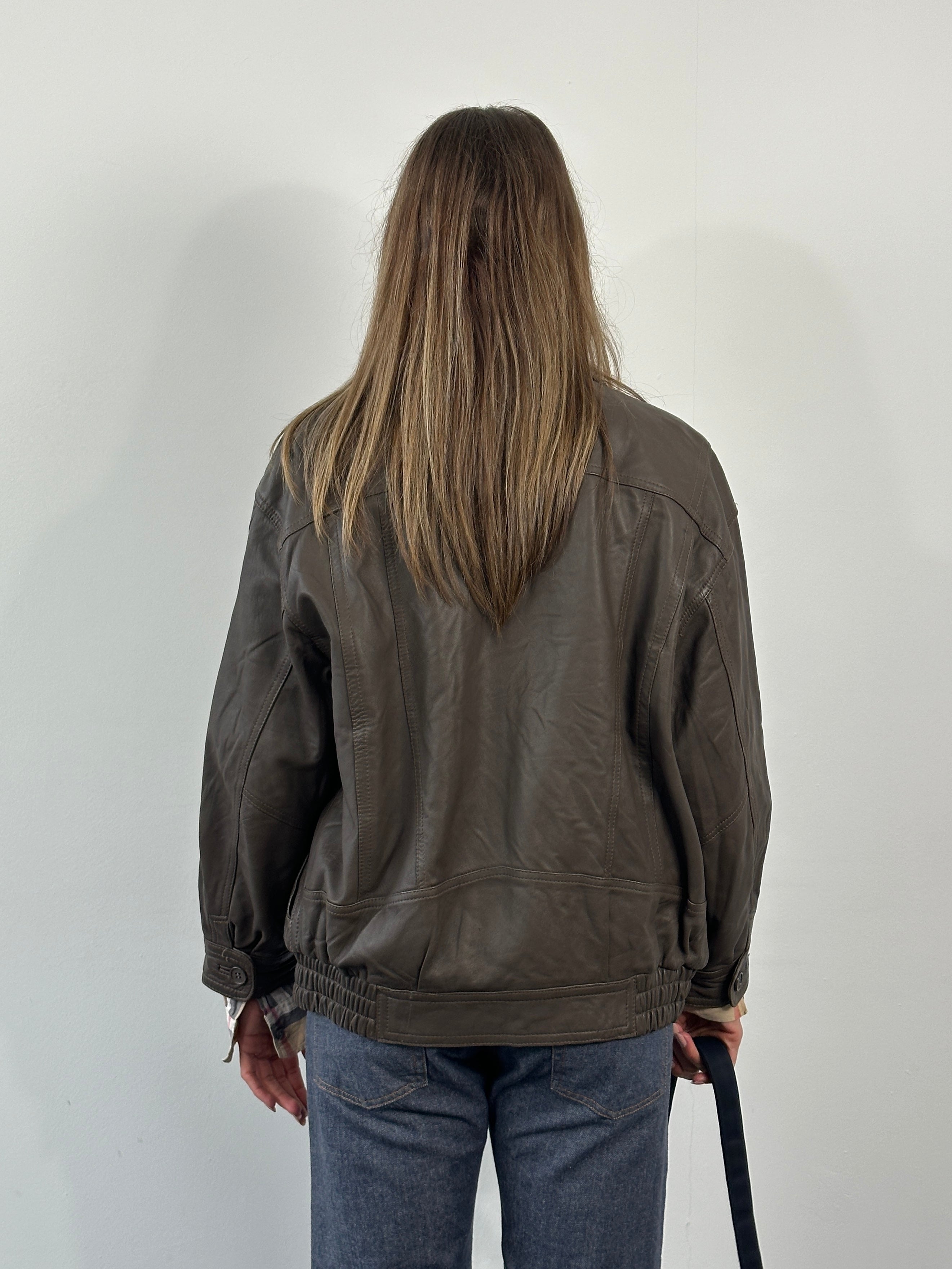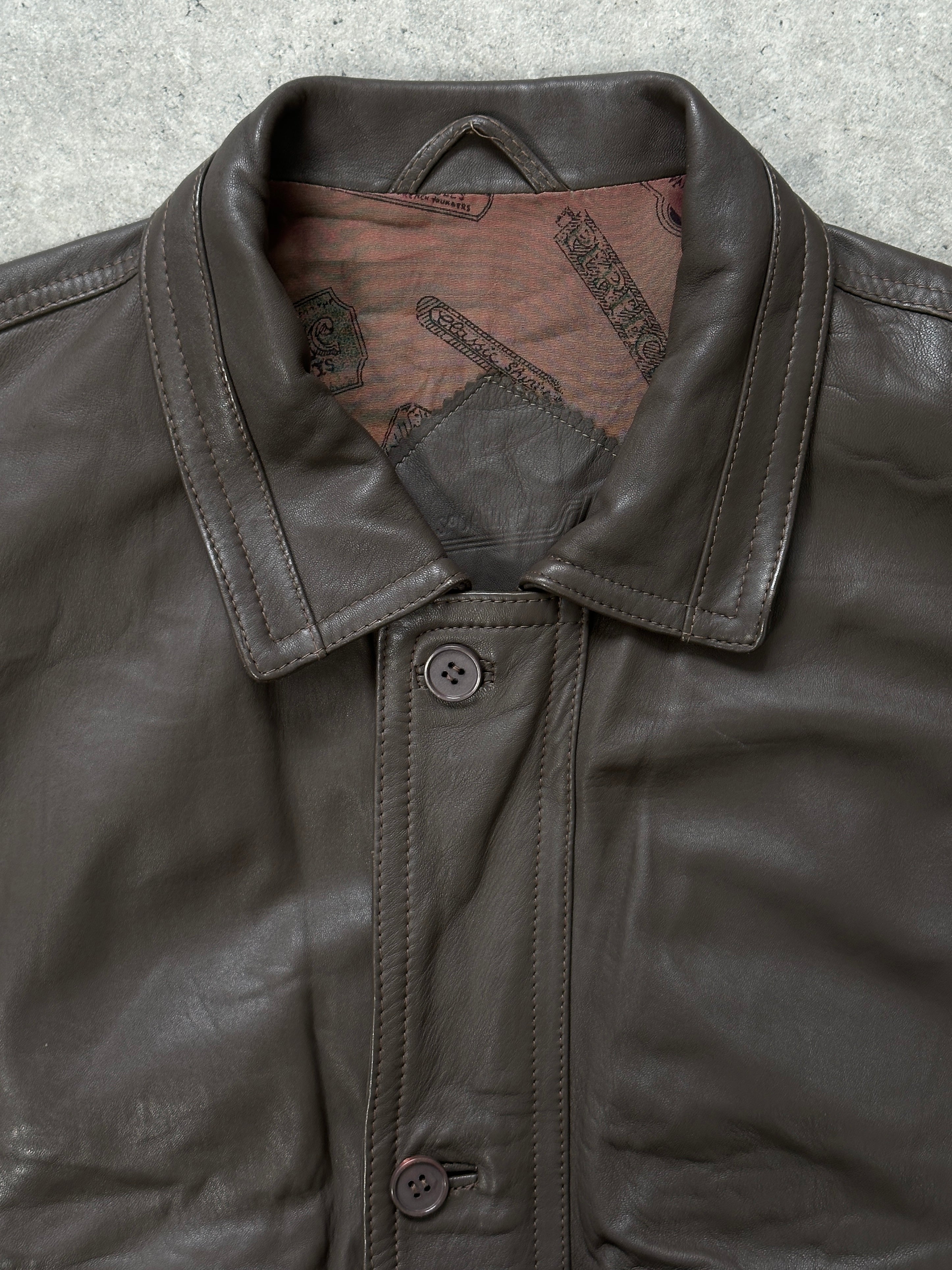 Vintage 1990s brown leather bomber jacket featuring a softly structured silhouette with panelled construction and ribbed hem. Designed with a printed interior lining for a true vintage feel.