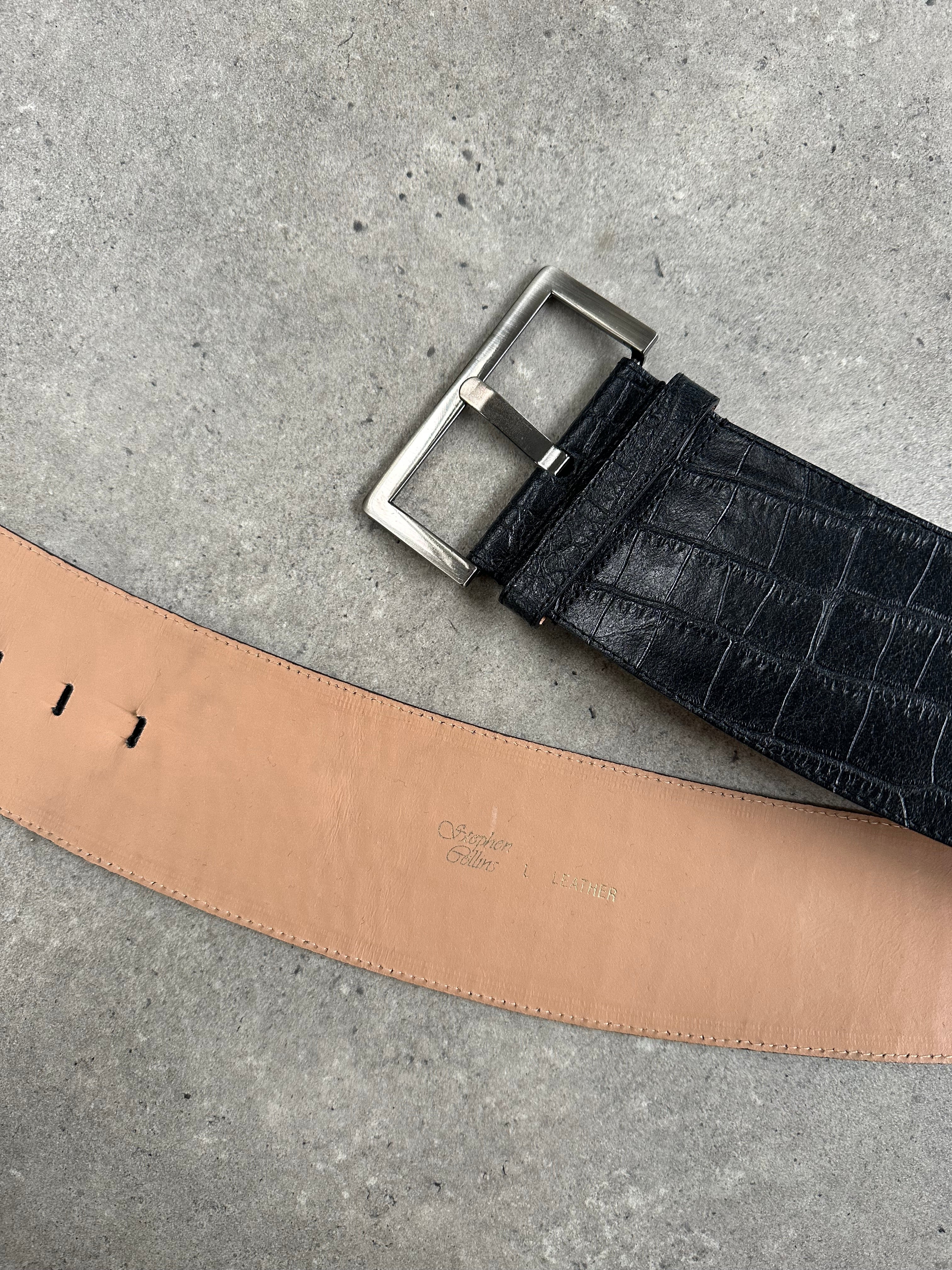 A vintage 1990s Stephen Collins black leather belt with croc embossing and a structured wide hip silhouette. Designed with a square brushed metal buckle, tapering from 3” at the front to a slimmer back for a sculpted fit at the waist or hip.