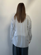 Vintage white pure silk shirt by Umberto Rosetti featuring a soft drape, subtle chest embroidery and relaxed tailoring. A minimal 1990s piece with a clean oversized silhouette.