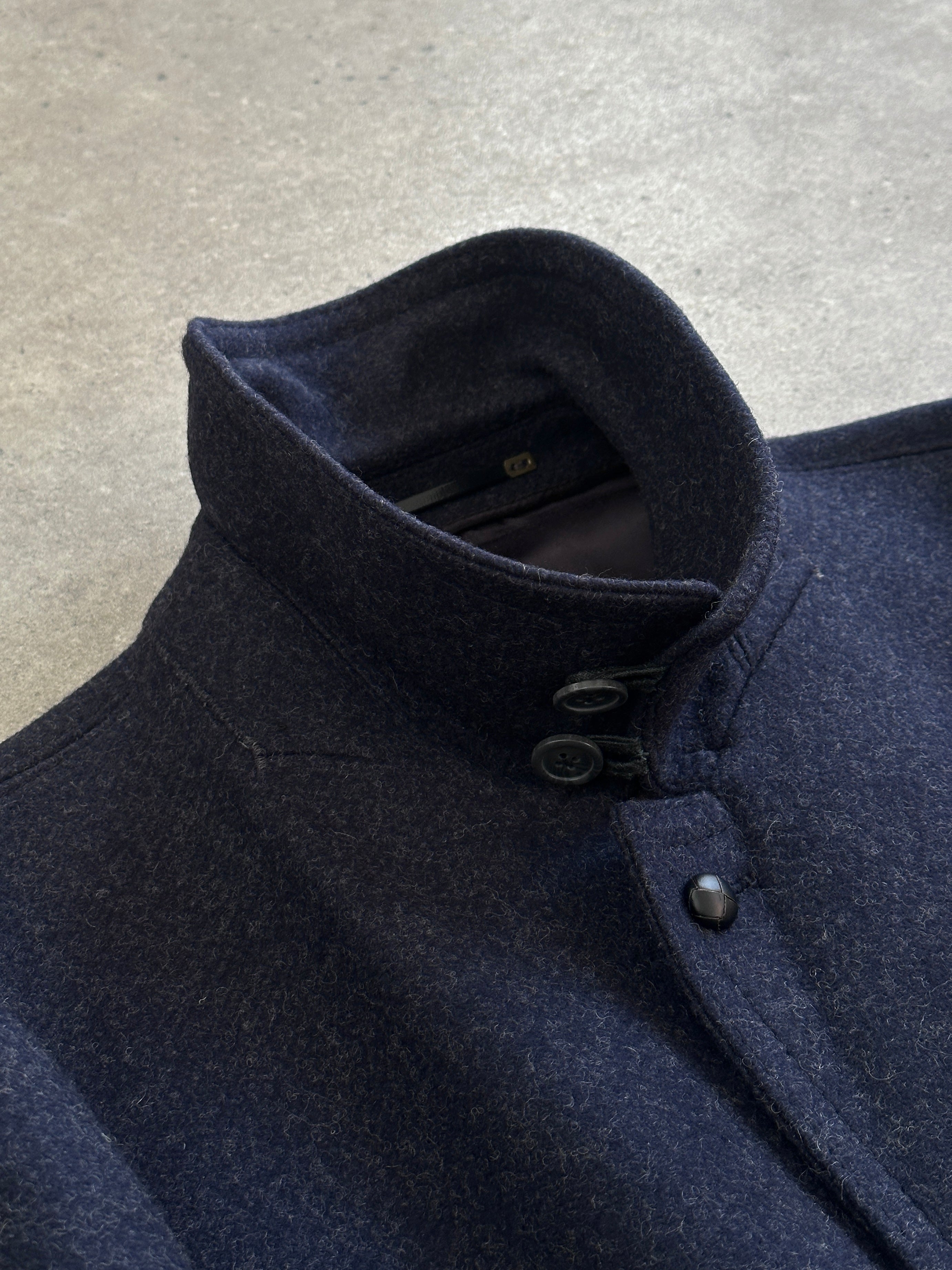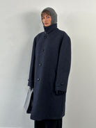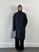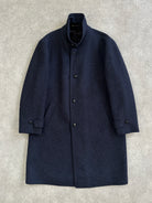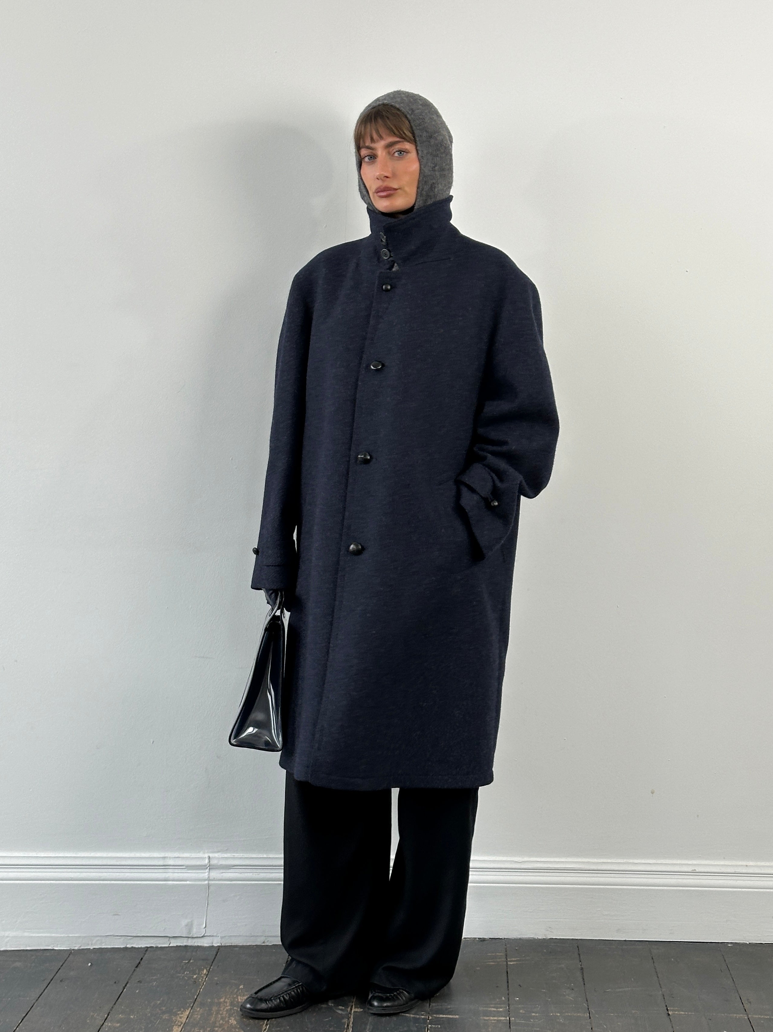 A vintage 1990s pure wool single breasted coat in a deep navy tone with a high neck fastening. A clean oversized silhouette with concealed placket, softly structured drape and understated refinement.