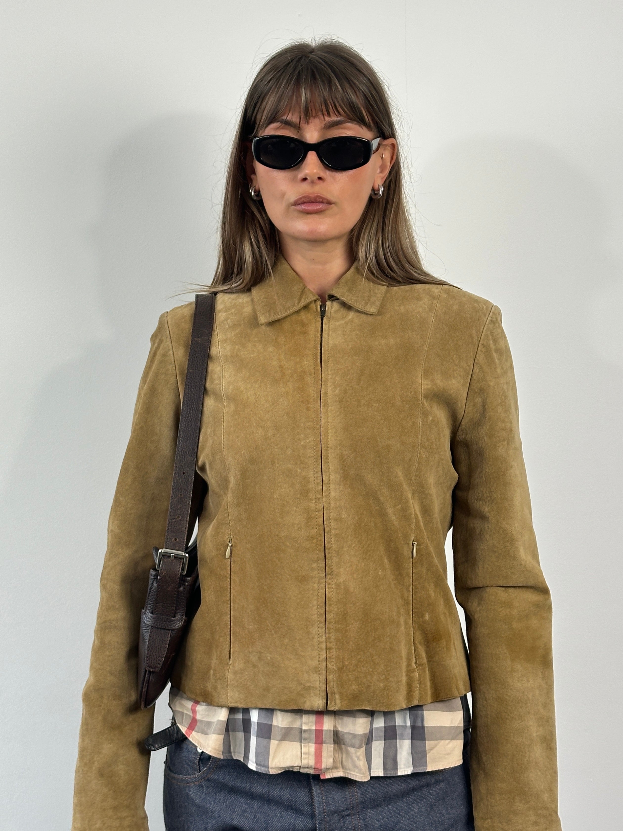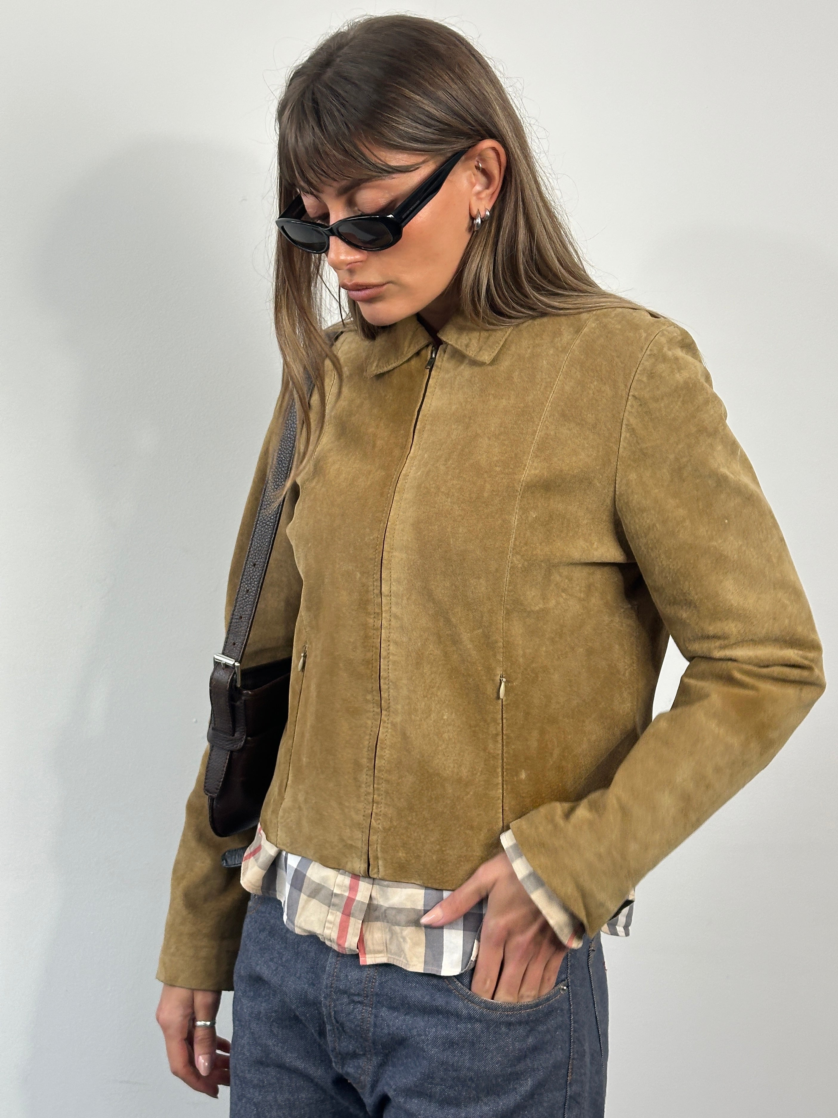 A vintage women’s suede jacket in a warm brown tone, cut with a clean cropped silhouette and soft structured shoulders. Finished with a concealed zip front and minimalist lines, offering an easy everyday layer with a refined 1990s feel.