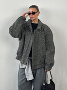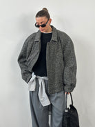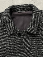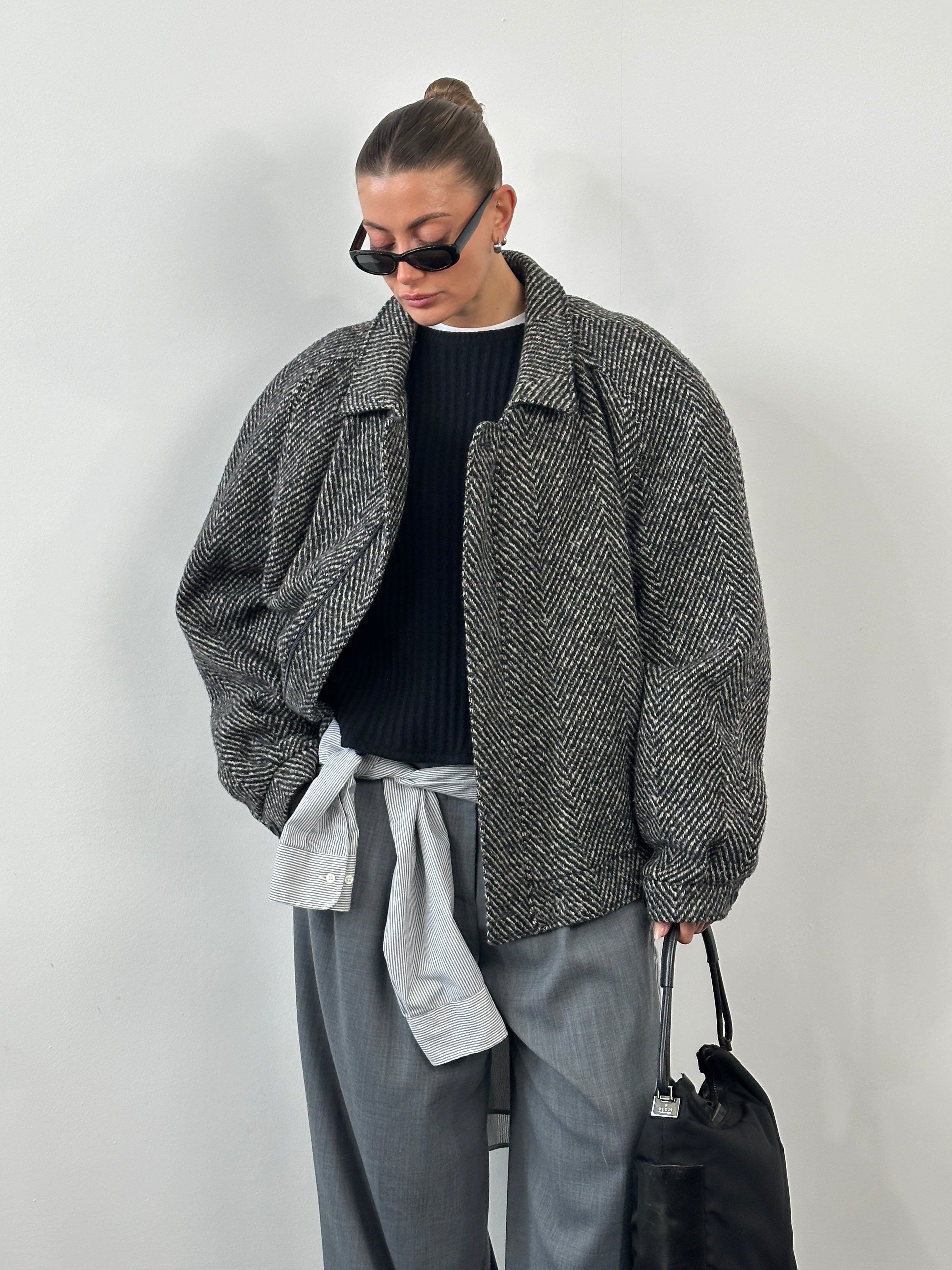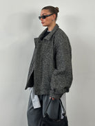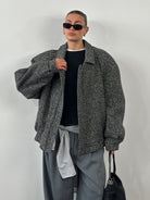 A vintage wool bomber jacket in grey herringbone, cut with a relaxed oversized silhouette and finished with a classic collar and elasticated hem. The textured weave and soft structure give it an effortless 1990s outerwear feel suited to layering.