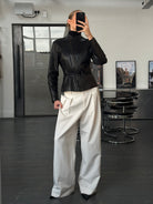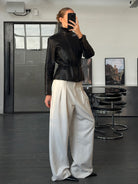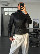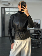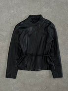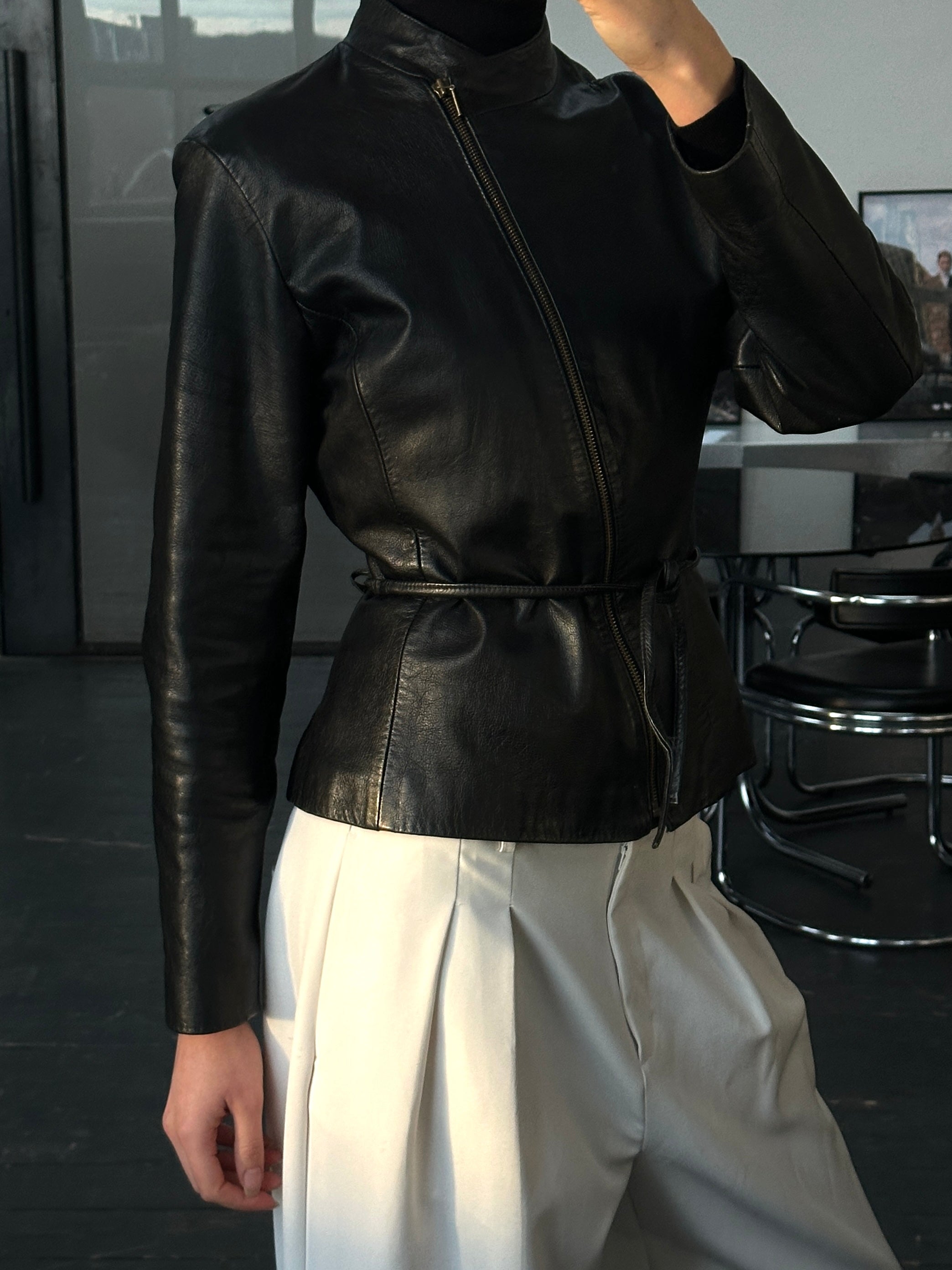 A vintage black leather jacket with a clean minimal neckline, asymmetric zip closure and subtle rope tie belt at the waist. Softly structured with a sleek cropped length, offering a refined take on early 2000s leather tailoring.