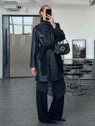 A vintage Milan leather trench coat in black with a sleek high-neck collar and concealed placket. A minimal, tailored silhouette designed for refined everyday wear with a softly structured finish.