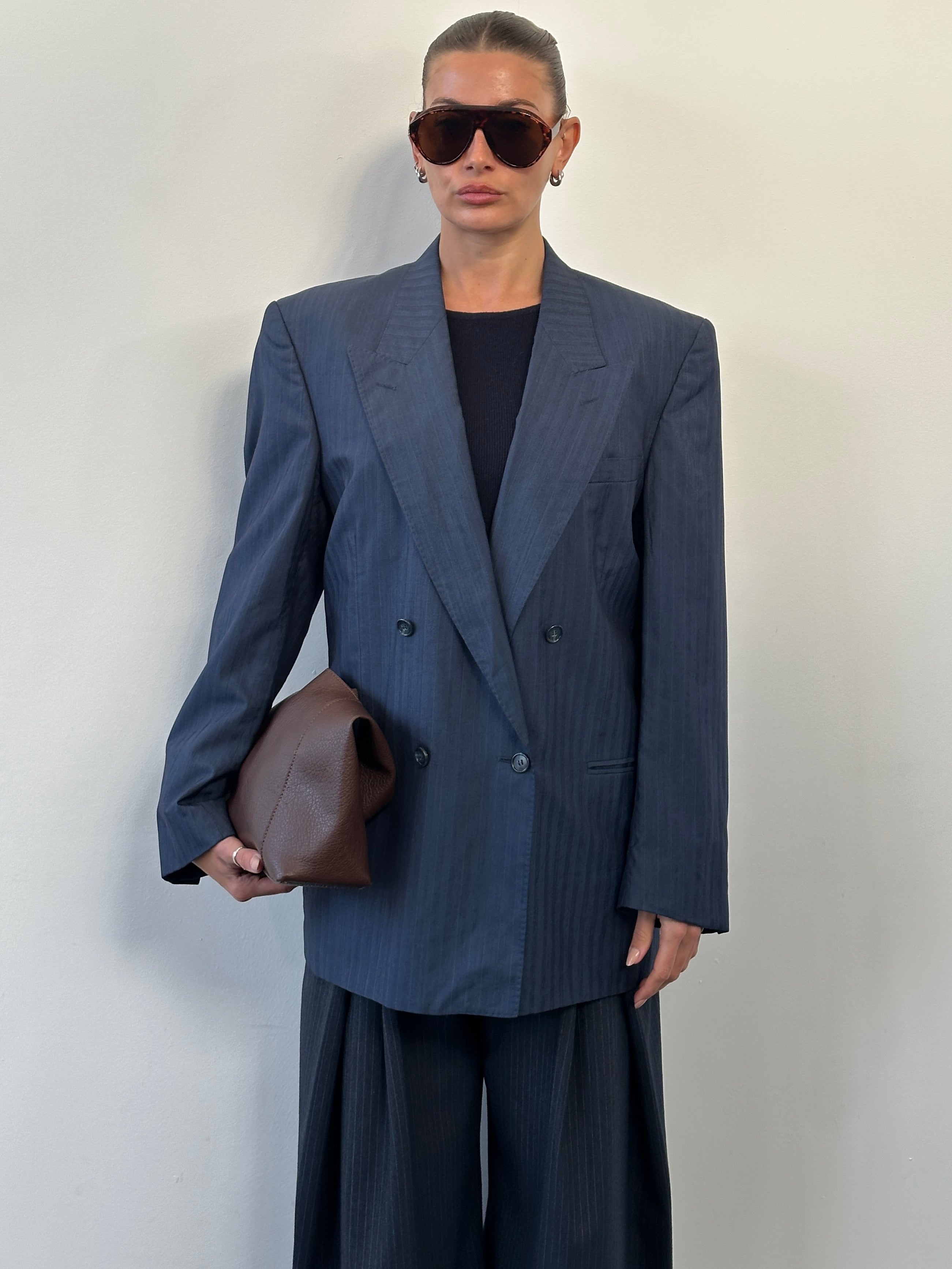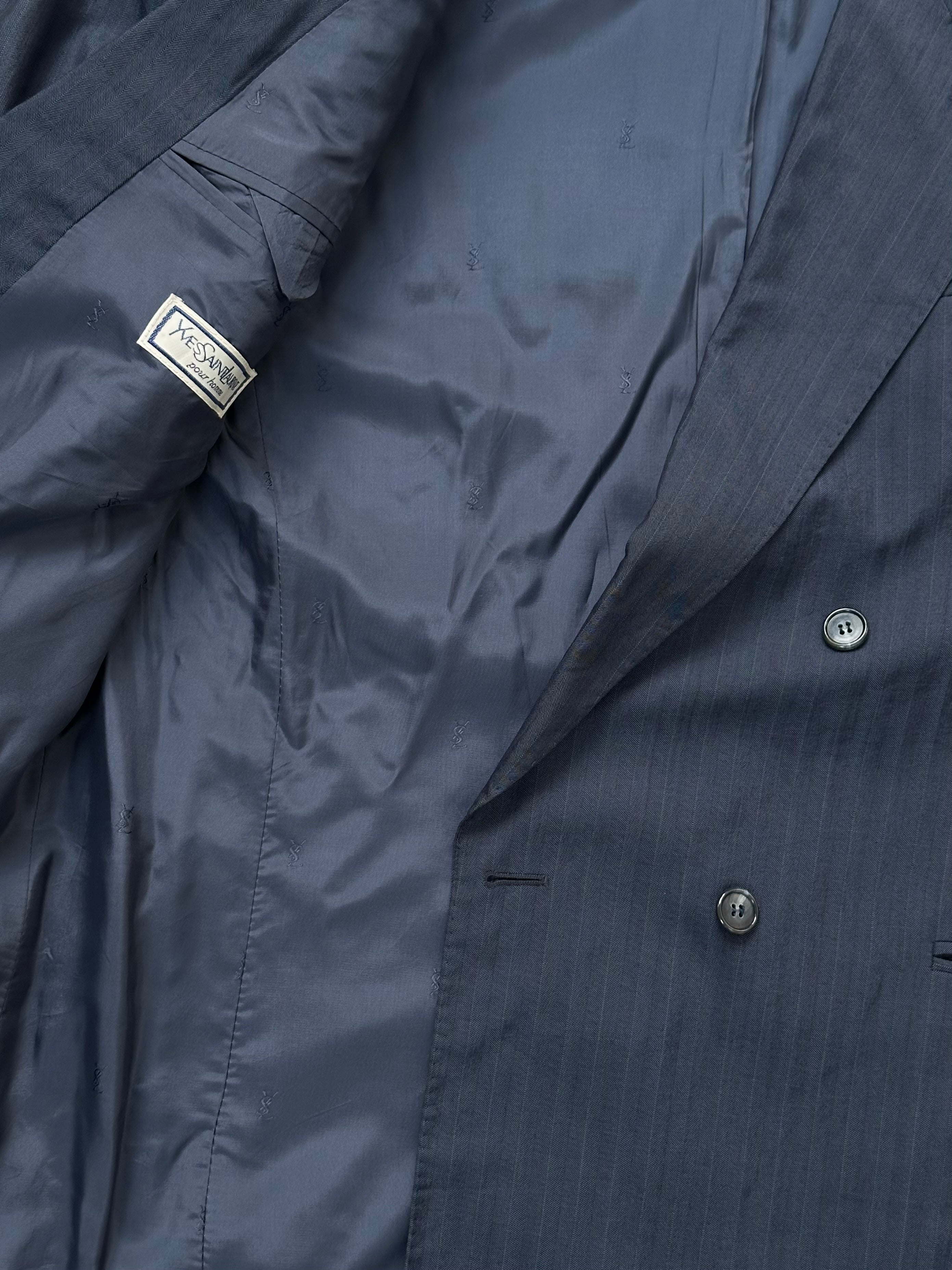 A blue double breasted blazer by Yves Saint Laurent pour homme, crafted in a rich wool and silk blend with a subtle sheen. Cut with strong shoulders and wide peak lapels, the deep blue tone and sharp tailoring create a structured, architectural silhouette typical of refined 1990s tailoring.