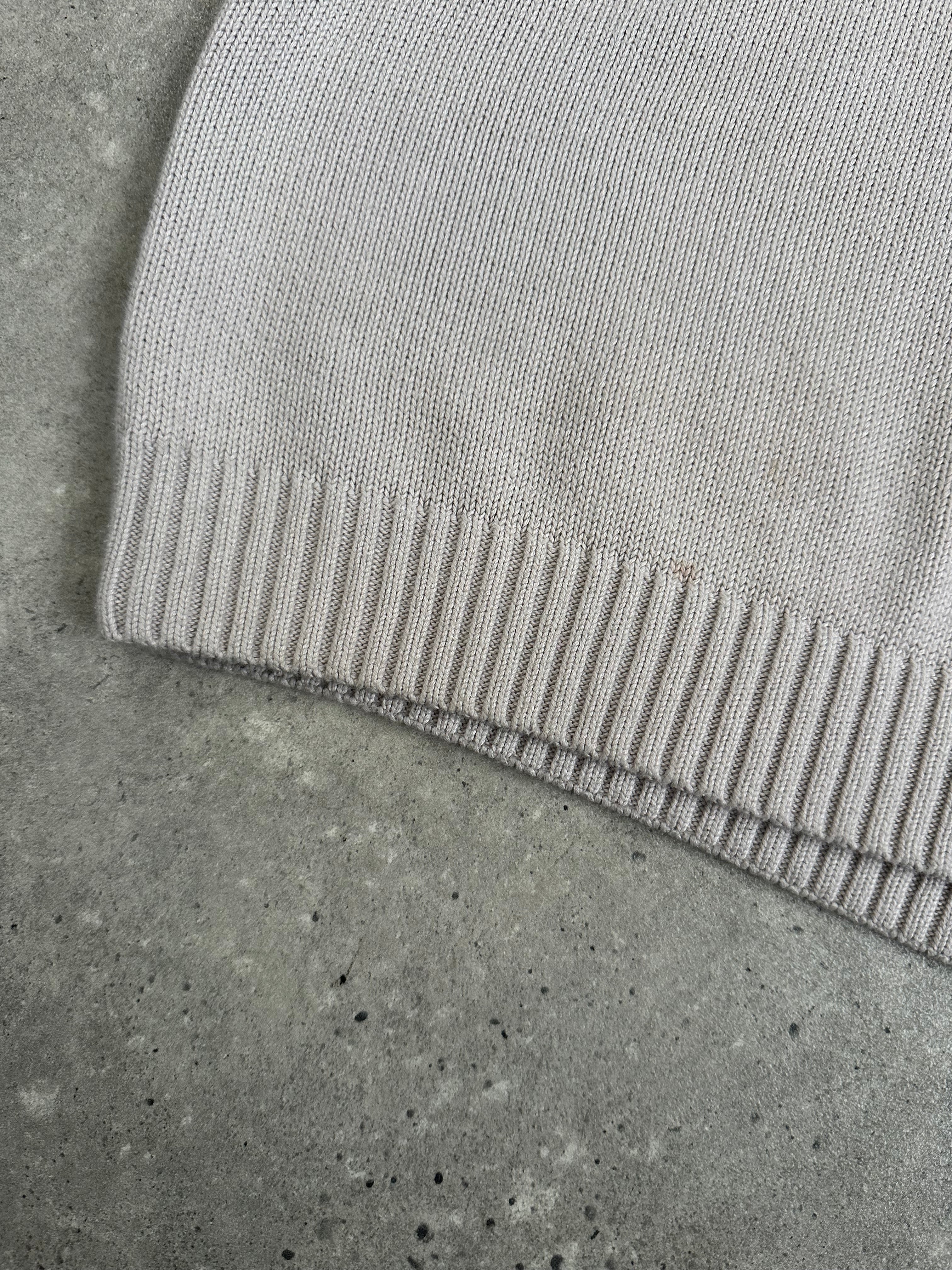 A beige 1990s knitted jumper by Yves Saint Laurent featuring a fine gauge cotton knit and subtle embroidered YSL logo to the chest. Designed with a classic crew neckline, ribbed collar, cuffs and hem, offering a relaxed structured drape in soft neutral tones.