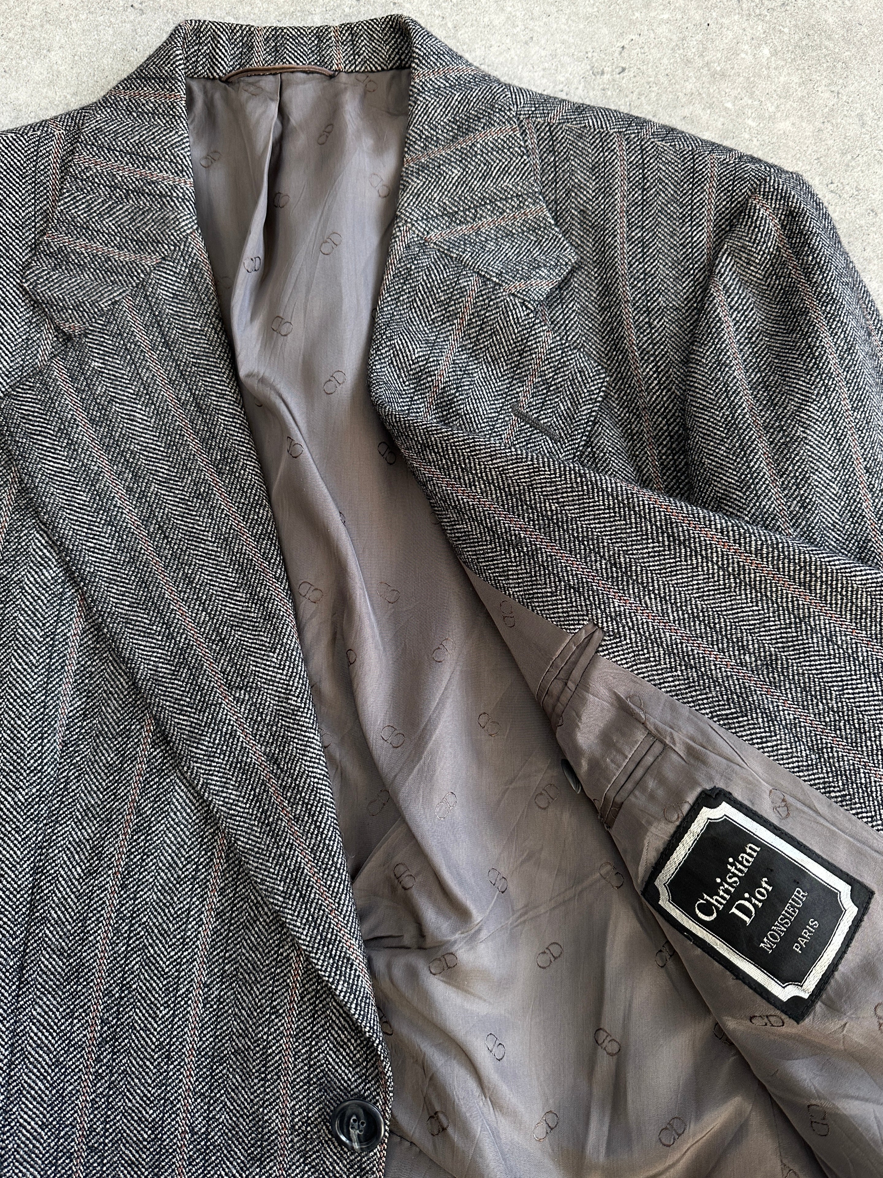 Vintage grey tone Christian Dior Monsieur Paris blazer featuring a subtle herringbone tweed effect with a fine orange stripe running through the weave. Finished with a two button front and full CD monogram lining for a refined tailored look.