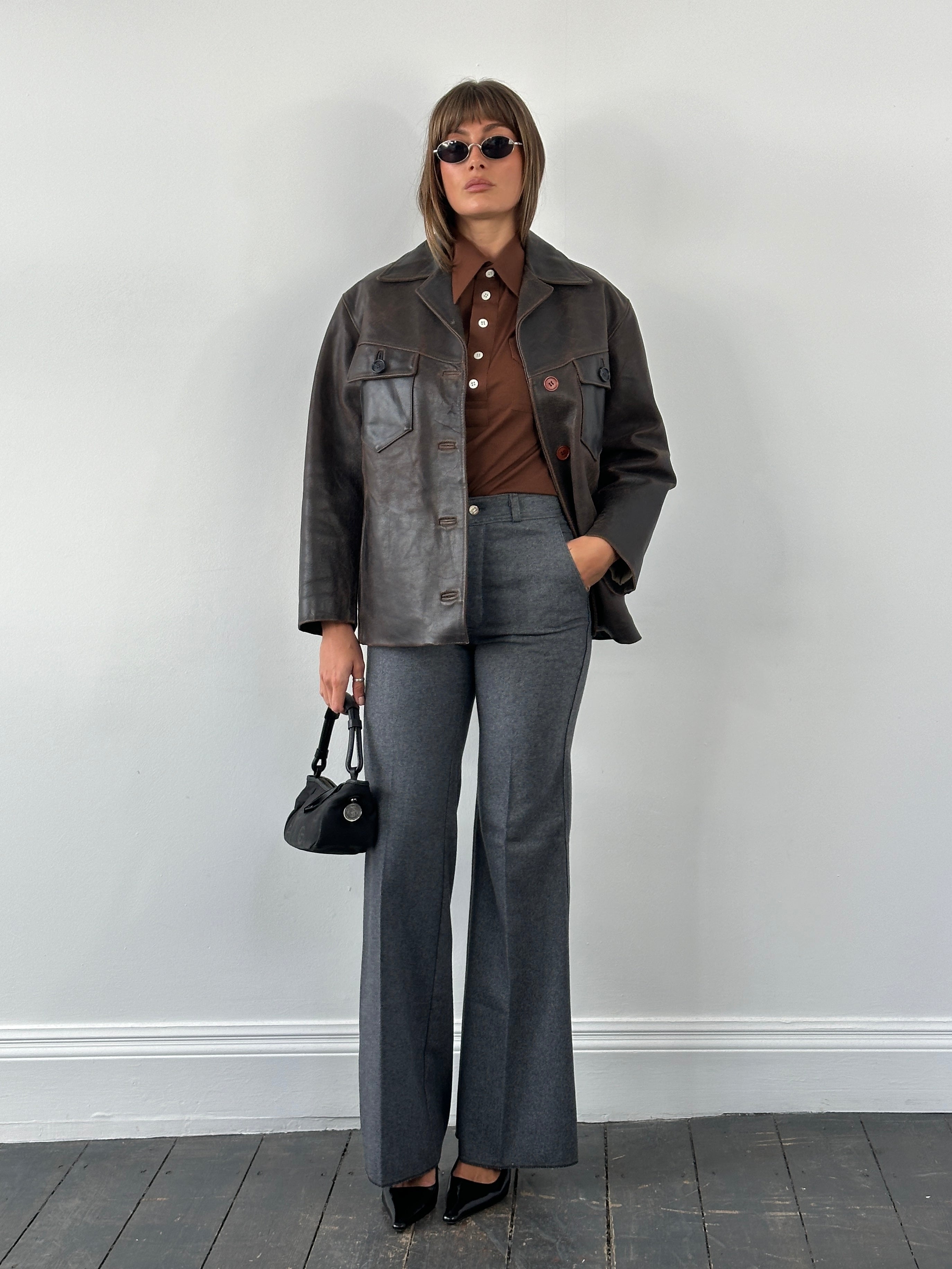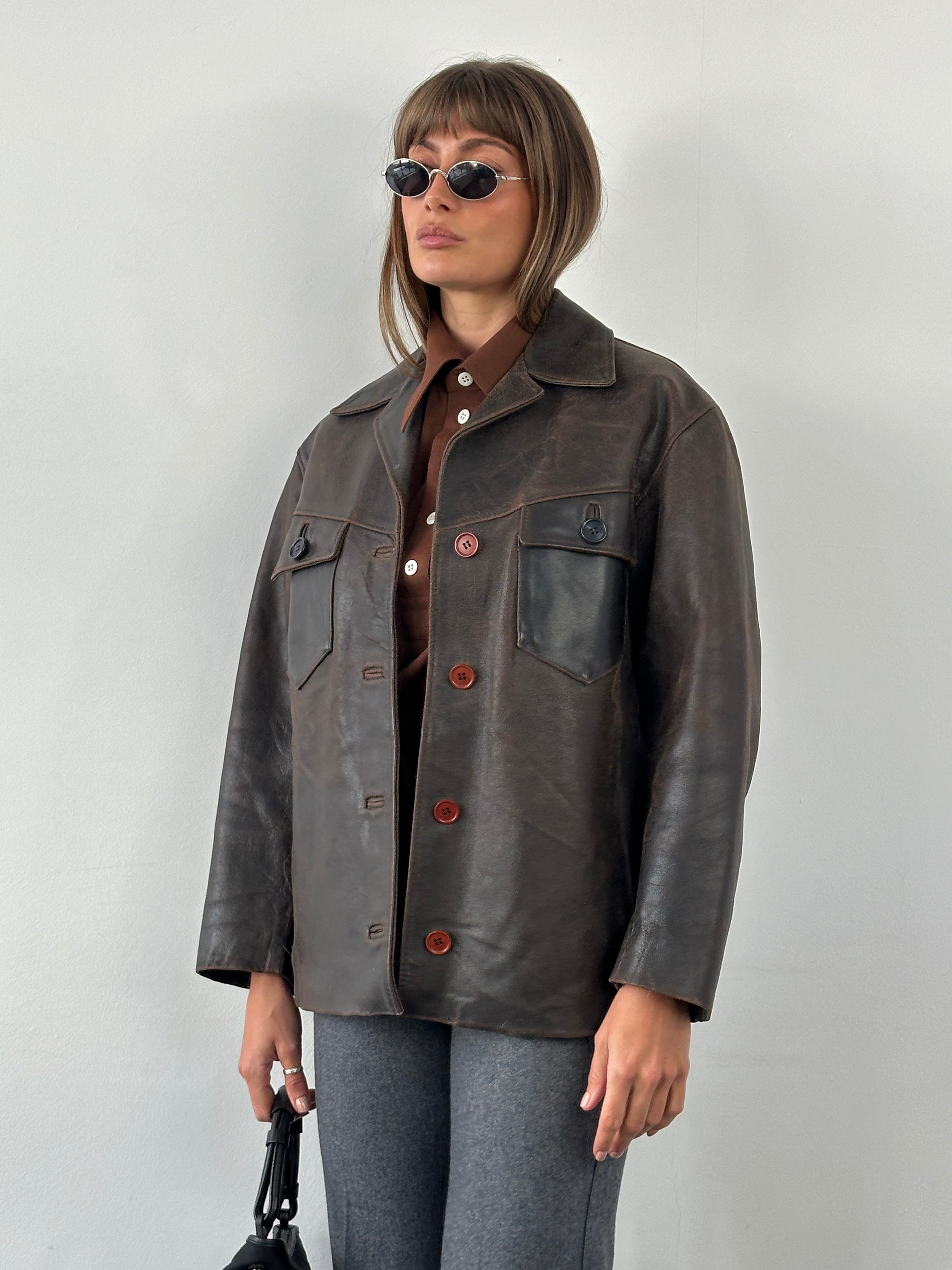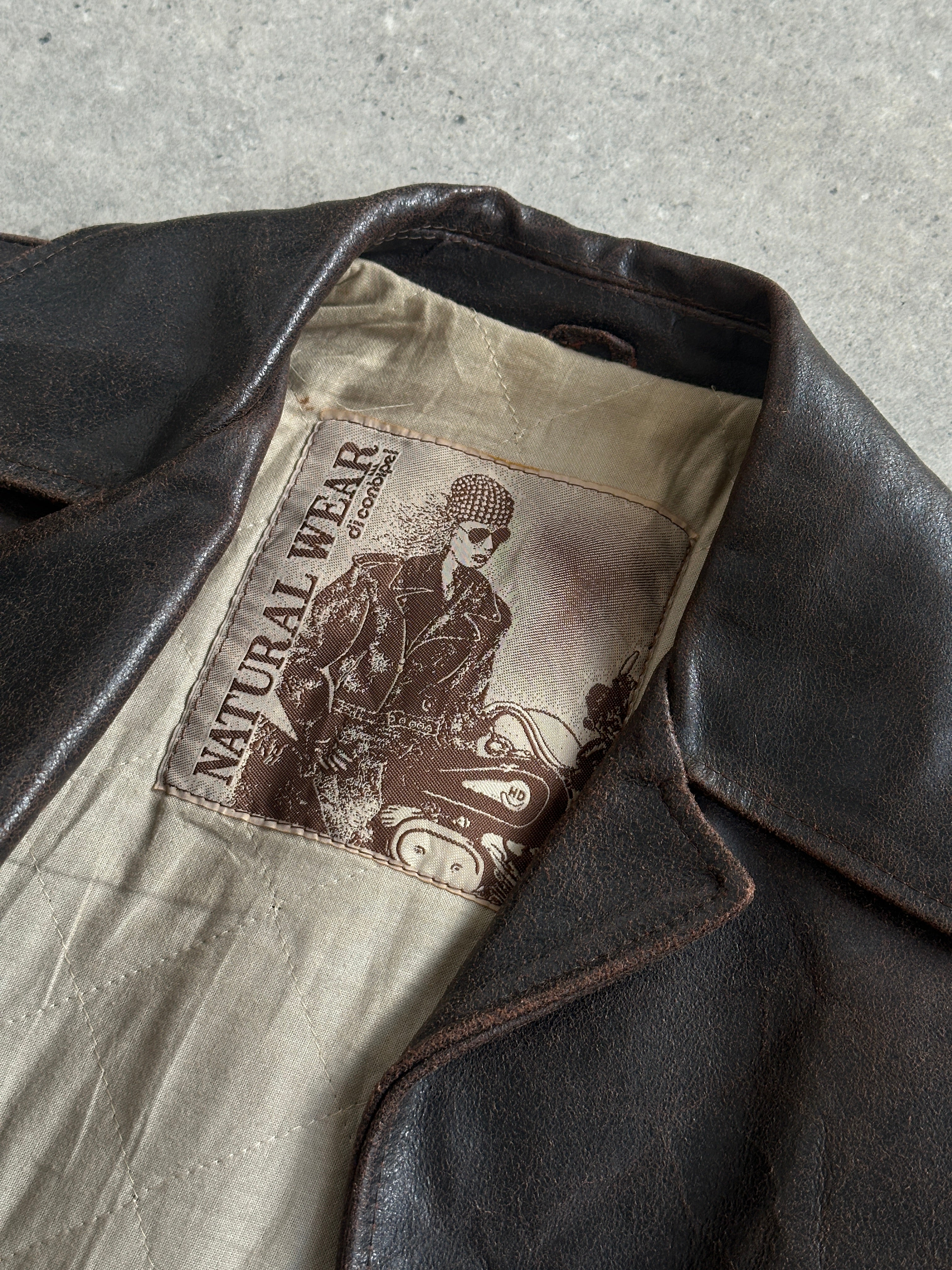 Vintage 1970s brown leather jacket by Natural Wear di Conbipel. Features two buttoned chest pockets, wide 70s collar and mismatched buttons from later replacements. The leather has developed a rich aged patina with a naturally distressed finish and a stiff, midweight handfeel.