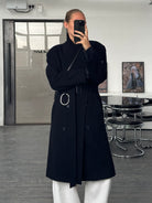 Timeless navy wool cashmere blend overcoat with structured tailoring, peak lapels and a self-tie belt. A refined, minimal silhouette crafted from premium natural fibres.