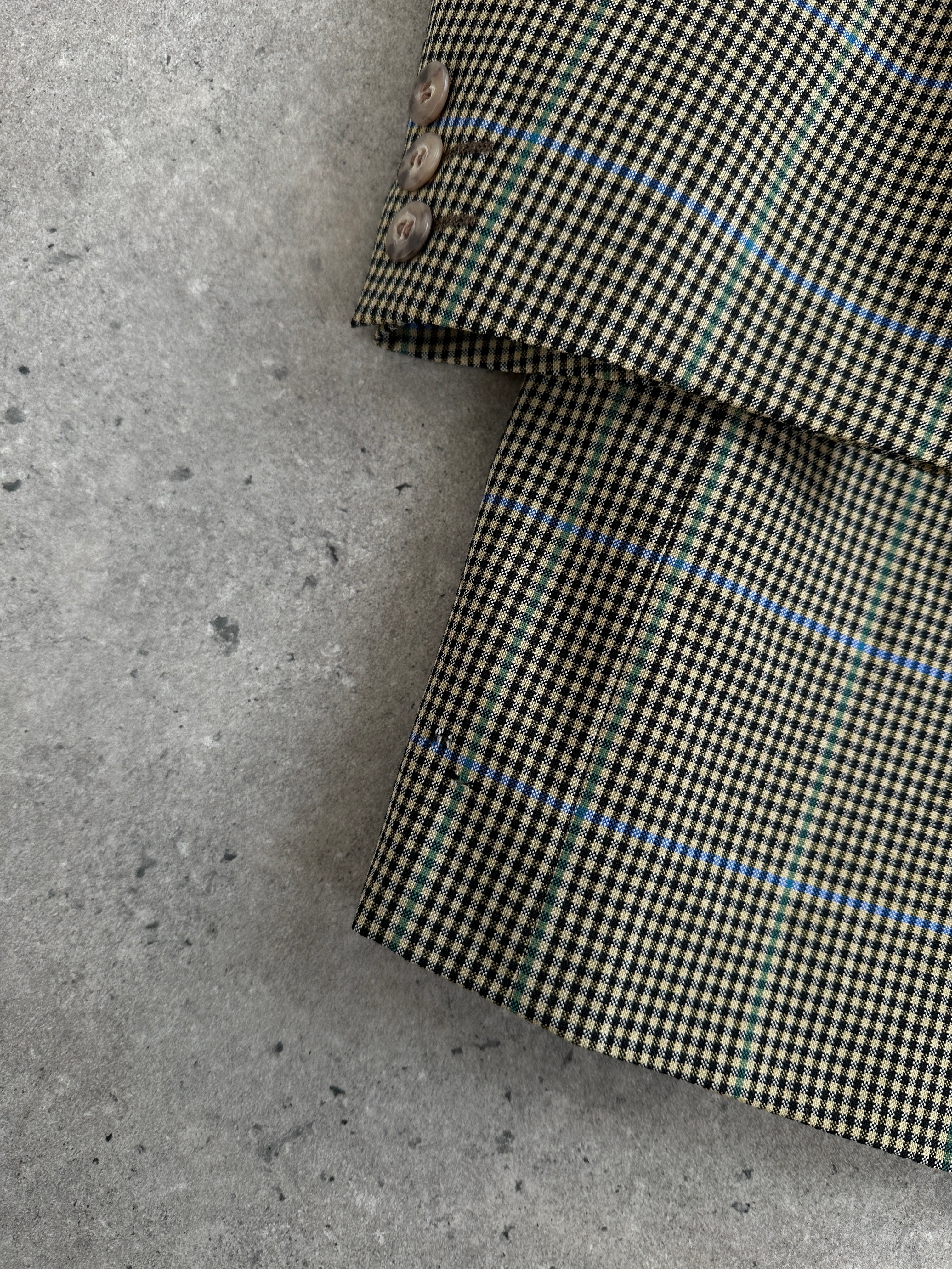 Vintage Yves Saint Laurent Pour Homme blazer in an overall green tone with a multicolour check pattern featuring green, yellow, white, black and subtle blue accents. A classic tailored silhouette from the 1990s, made in France with clean lines and a softly padded shoulder.