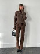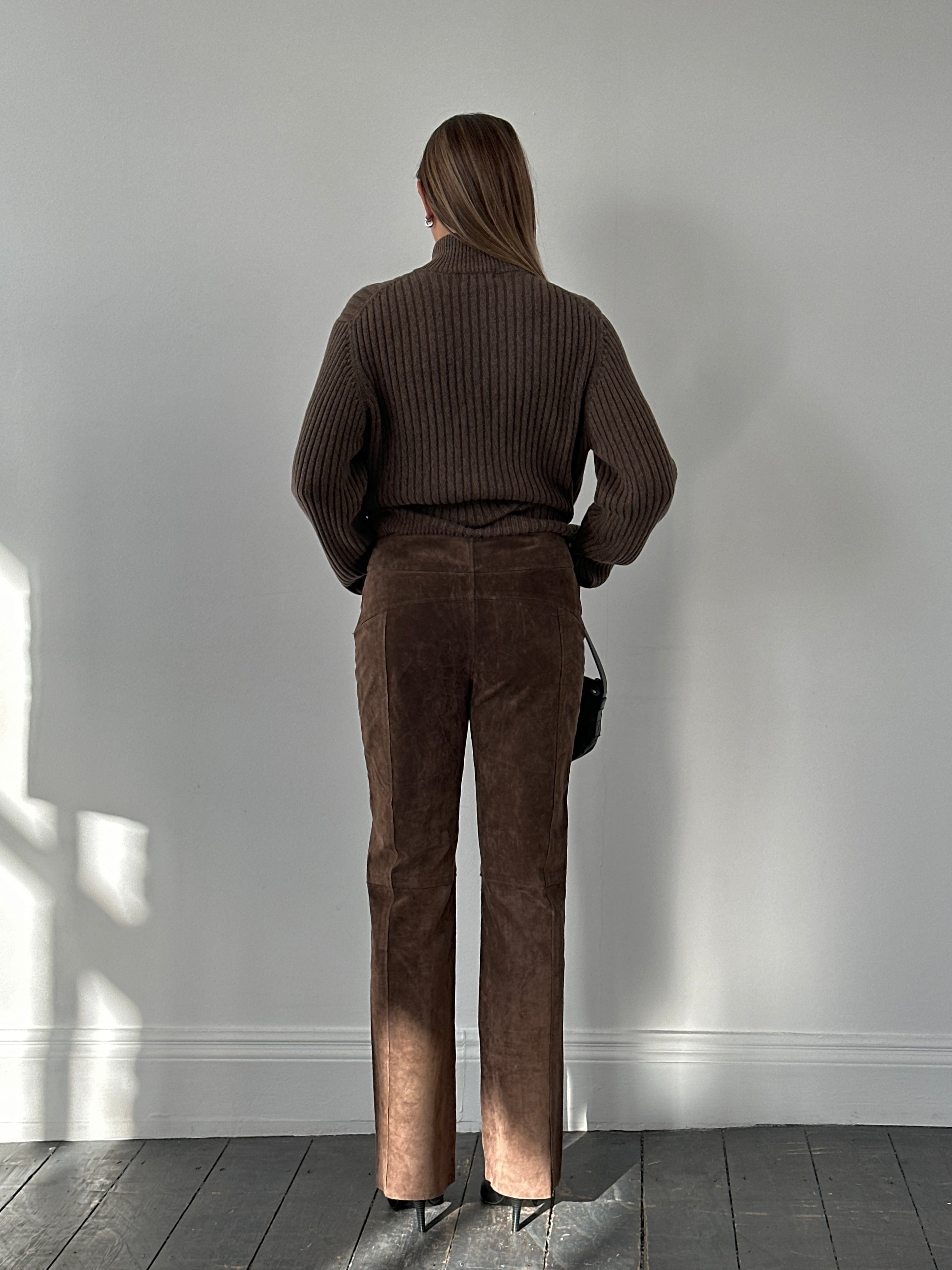Vintage 1990s brown suede trousers by TCM featuring a paneled construction and raw hem finish. Designed with a mise rise waist and straight leg silhouette for a flattering, elongating fit. Comes with the original leather care tag still attached.