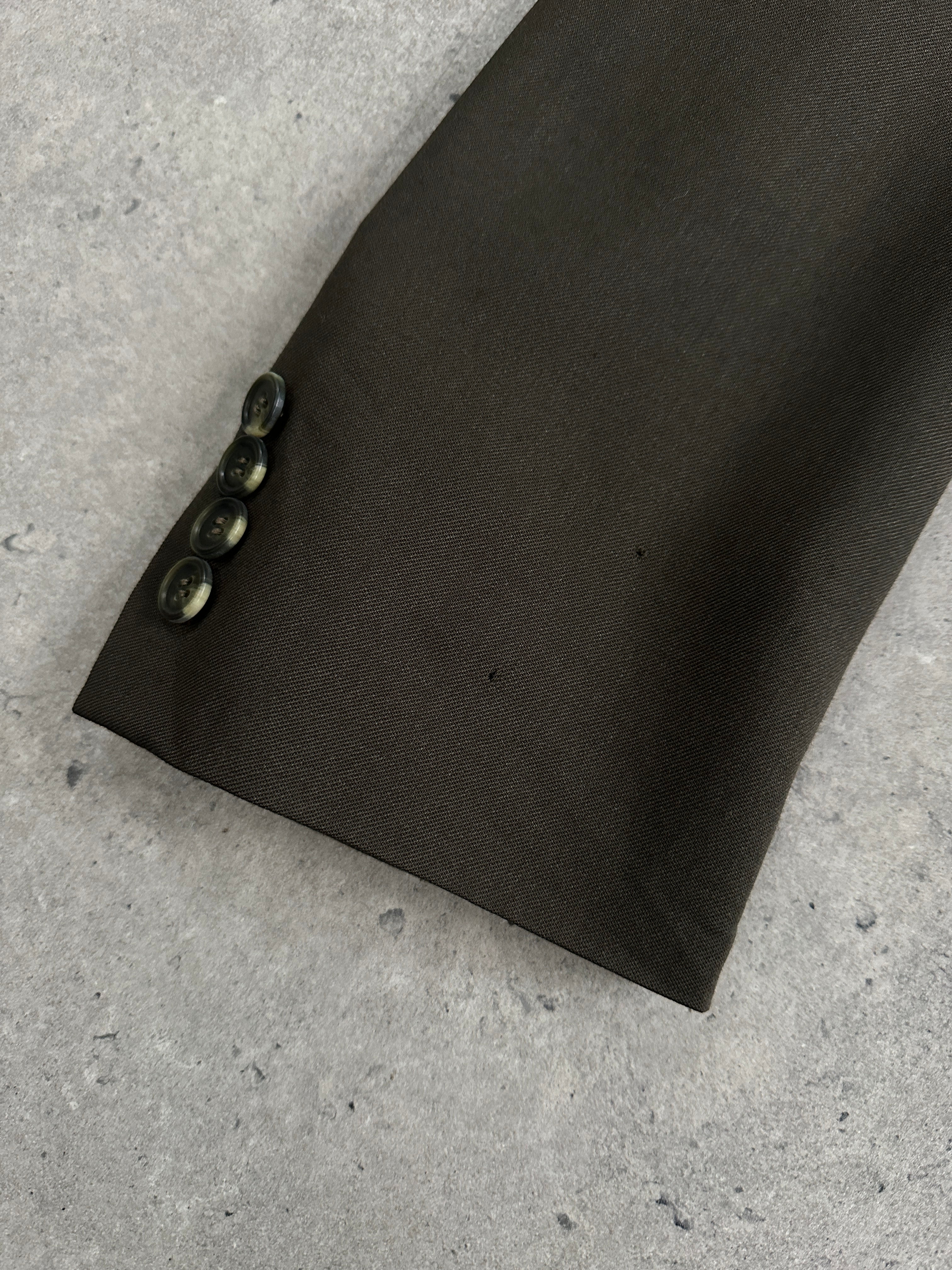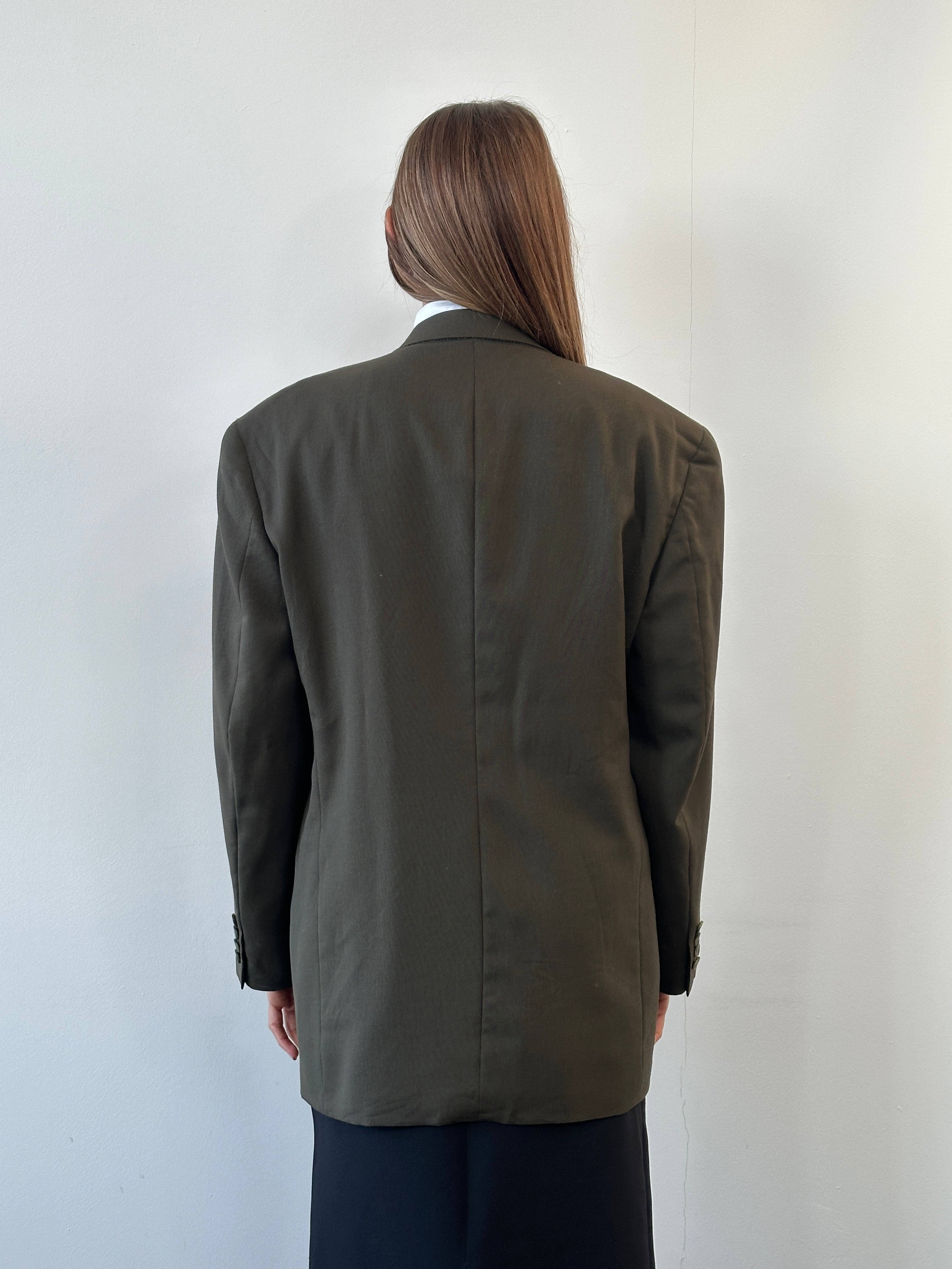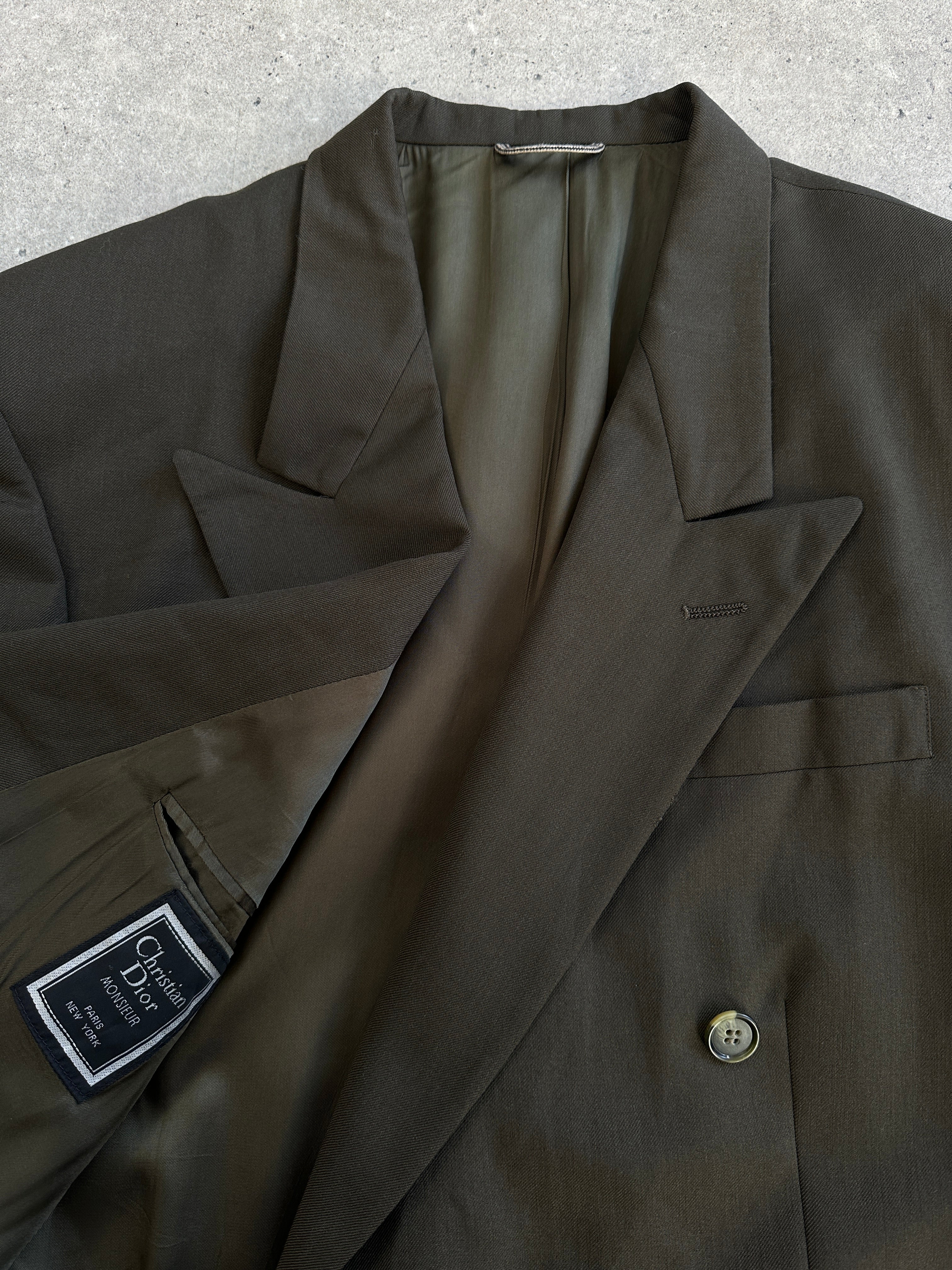 Vintage 1980s deep green double breasted Dior Monsieur blazer in pure wool, cut in a structured silhouette with subtle peak lapels. The tone is a muted green that reads refined and minimal.