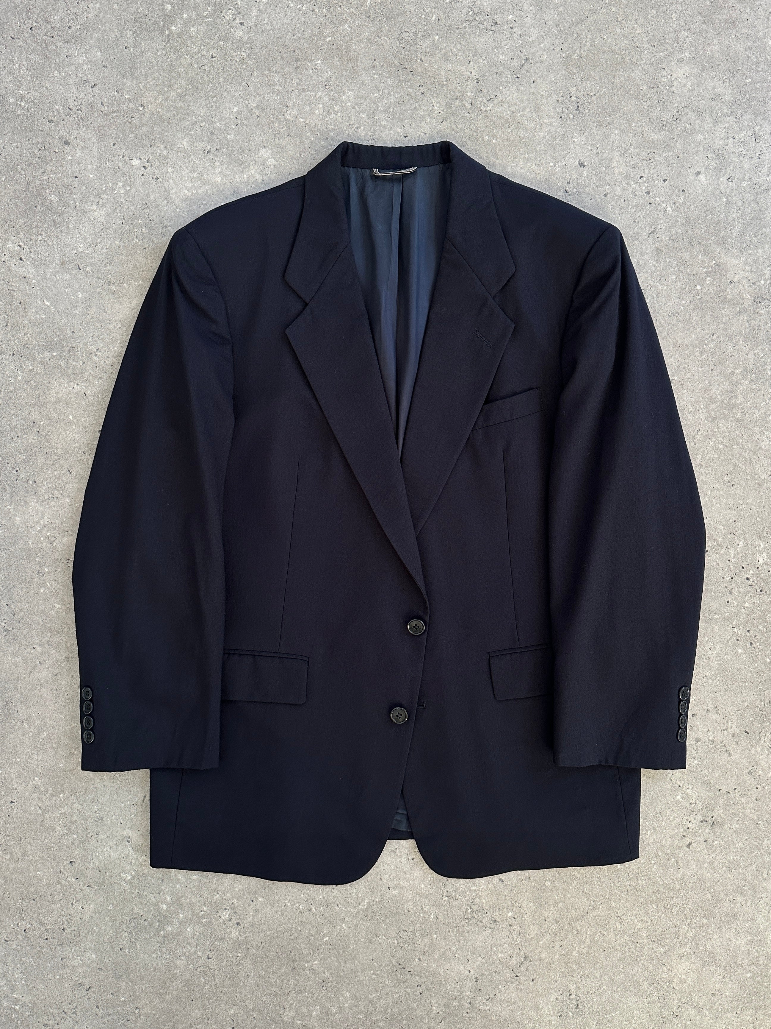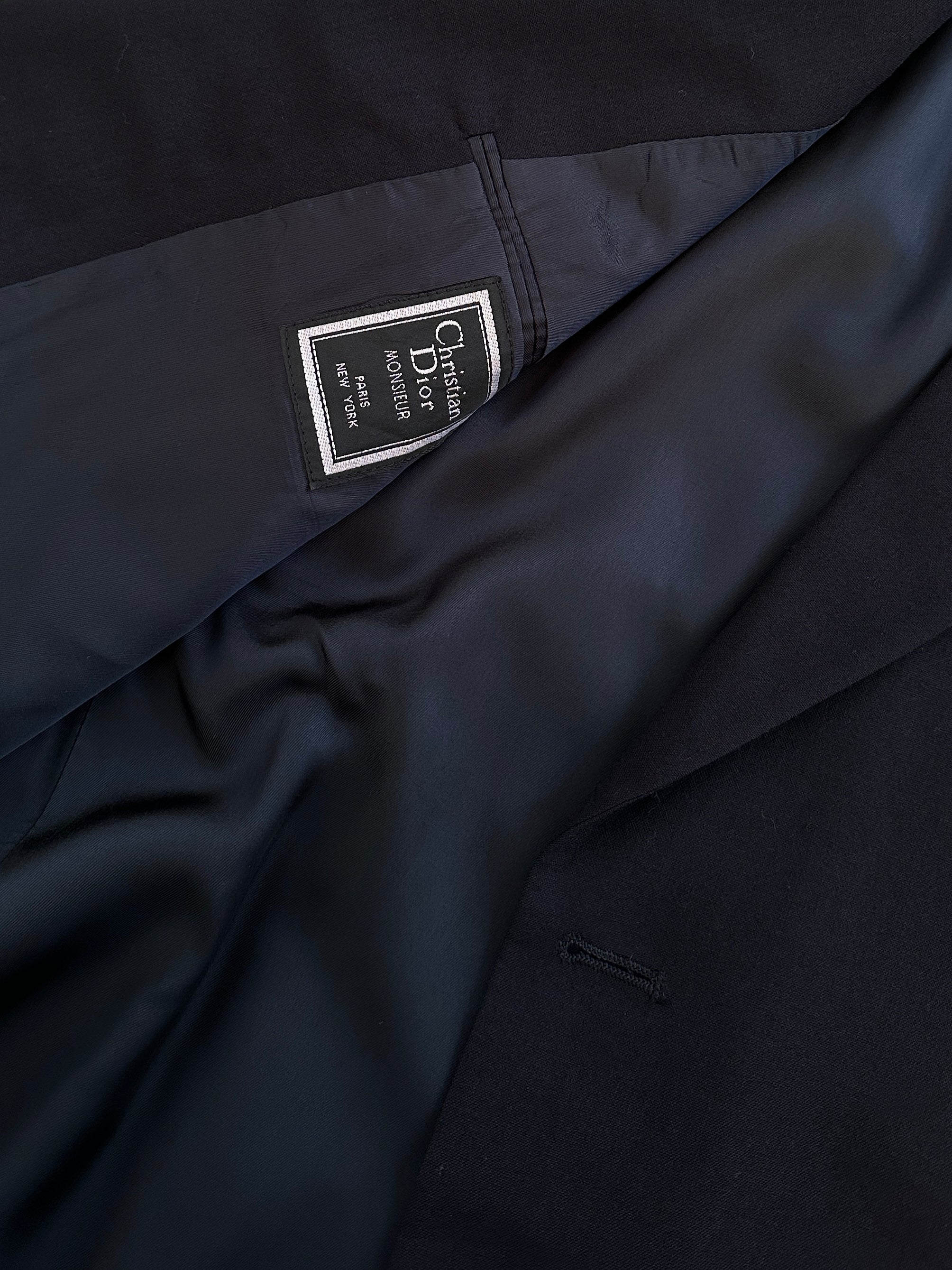 A vintage navy 1980s Christian Dior Monsieur blazer in a clean structured silhouette with a subtle tailored drape. Crafted in the USA from pure virgin wool and finished with a smooth lining for refined everyday wear.