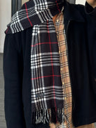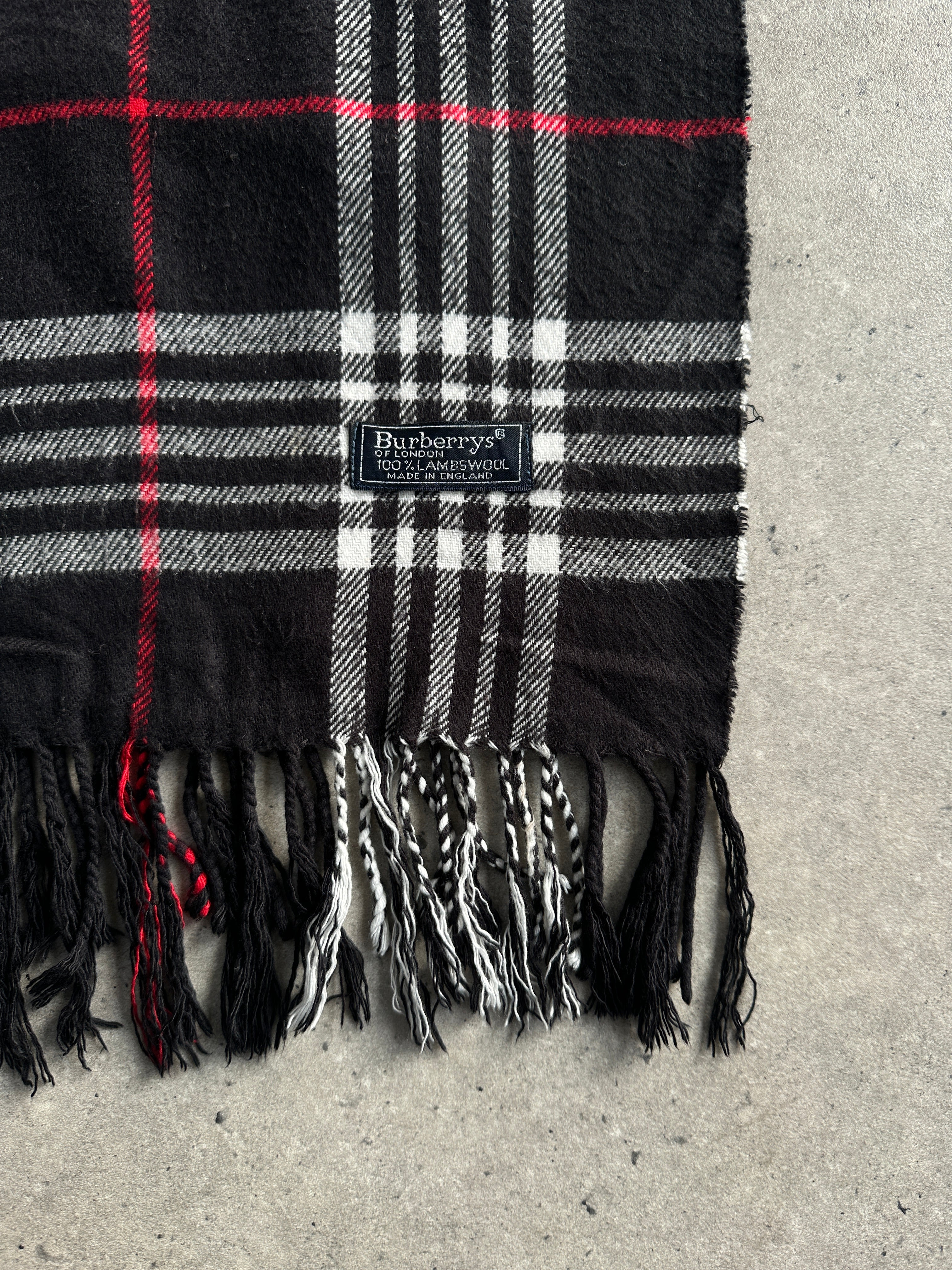 Burberrys 100% lambswool scarf woven in England in heritage black nova check and classic fringe finish.
