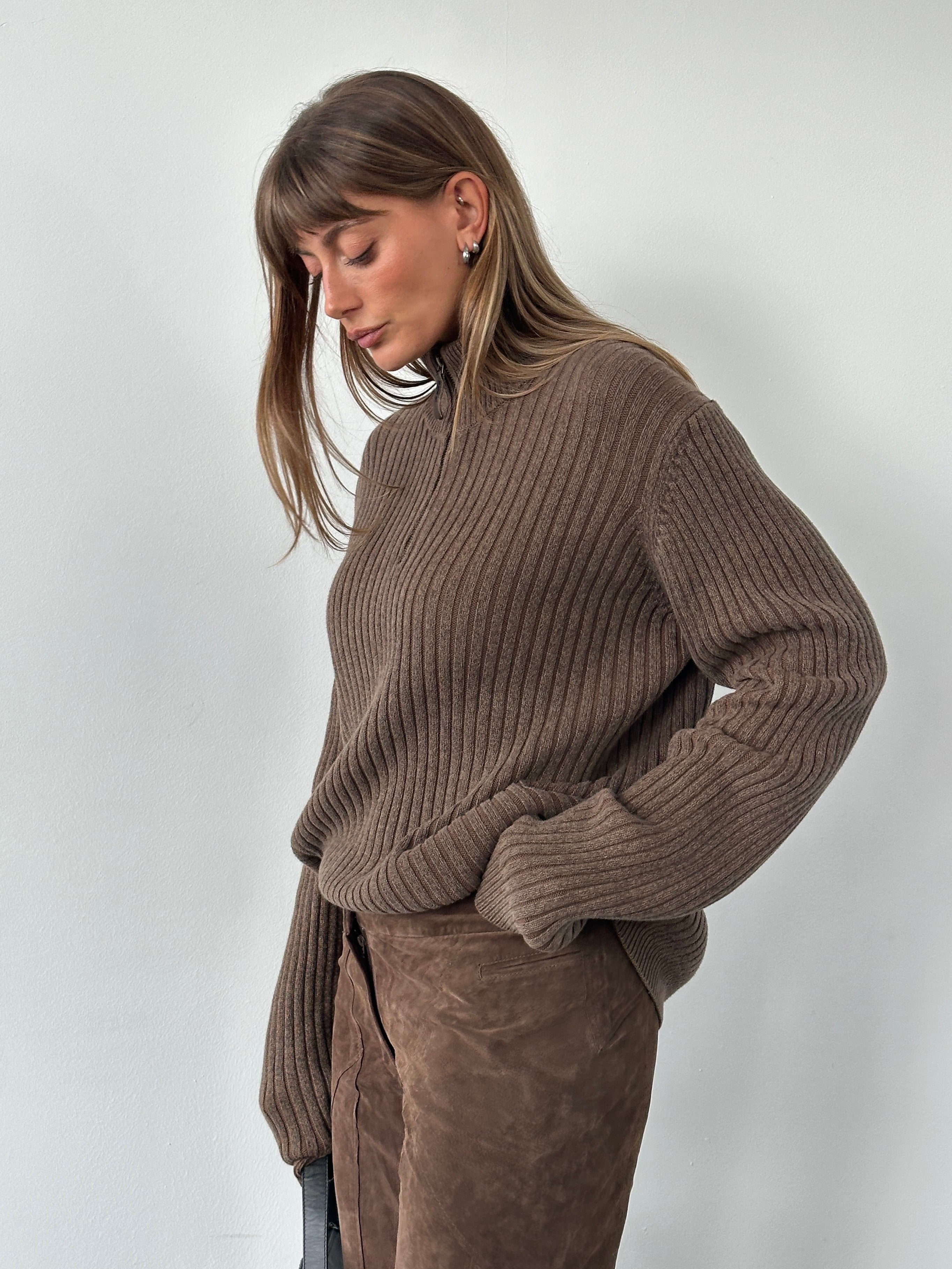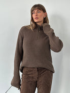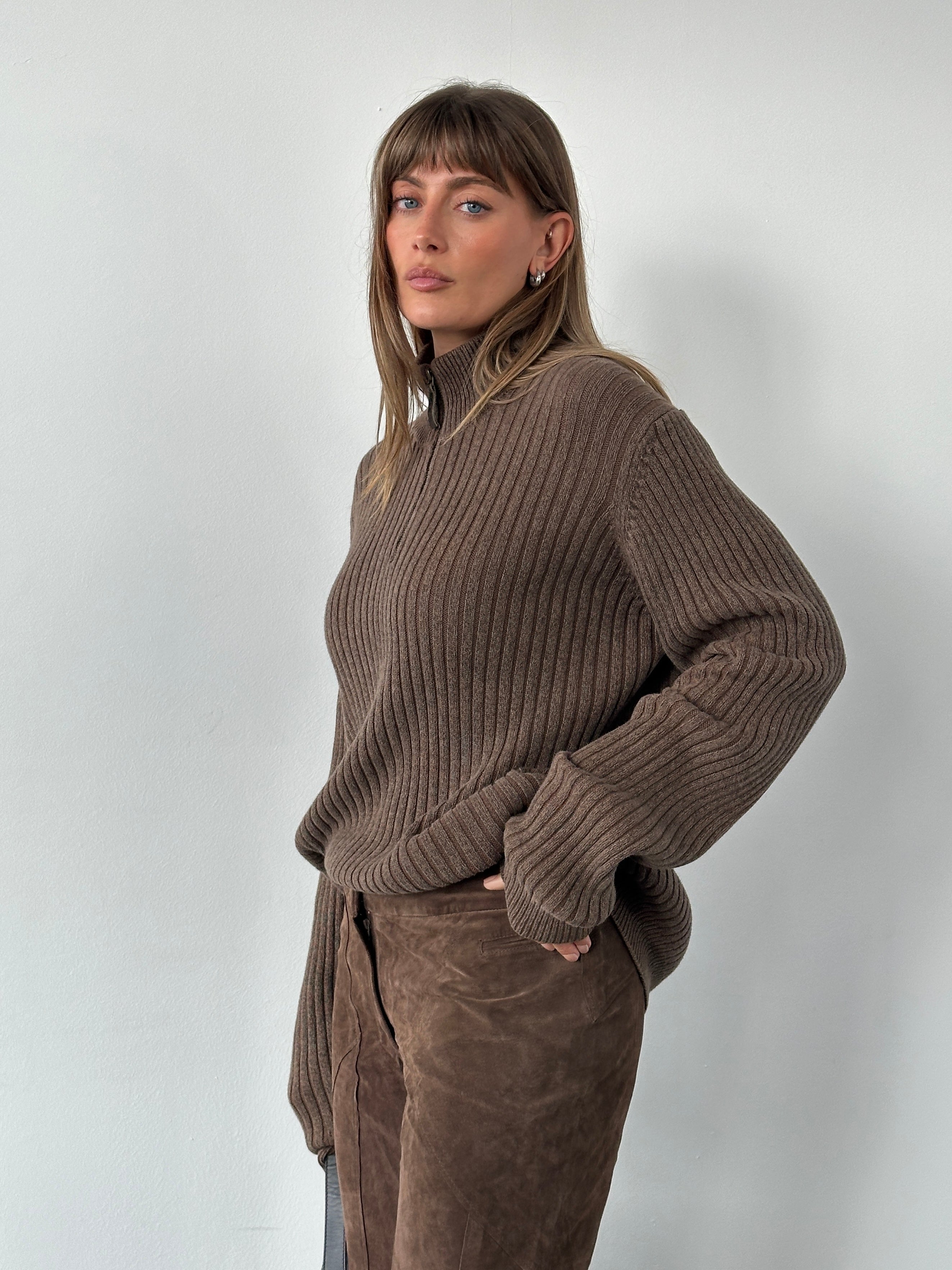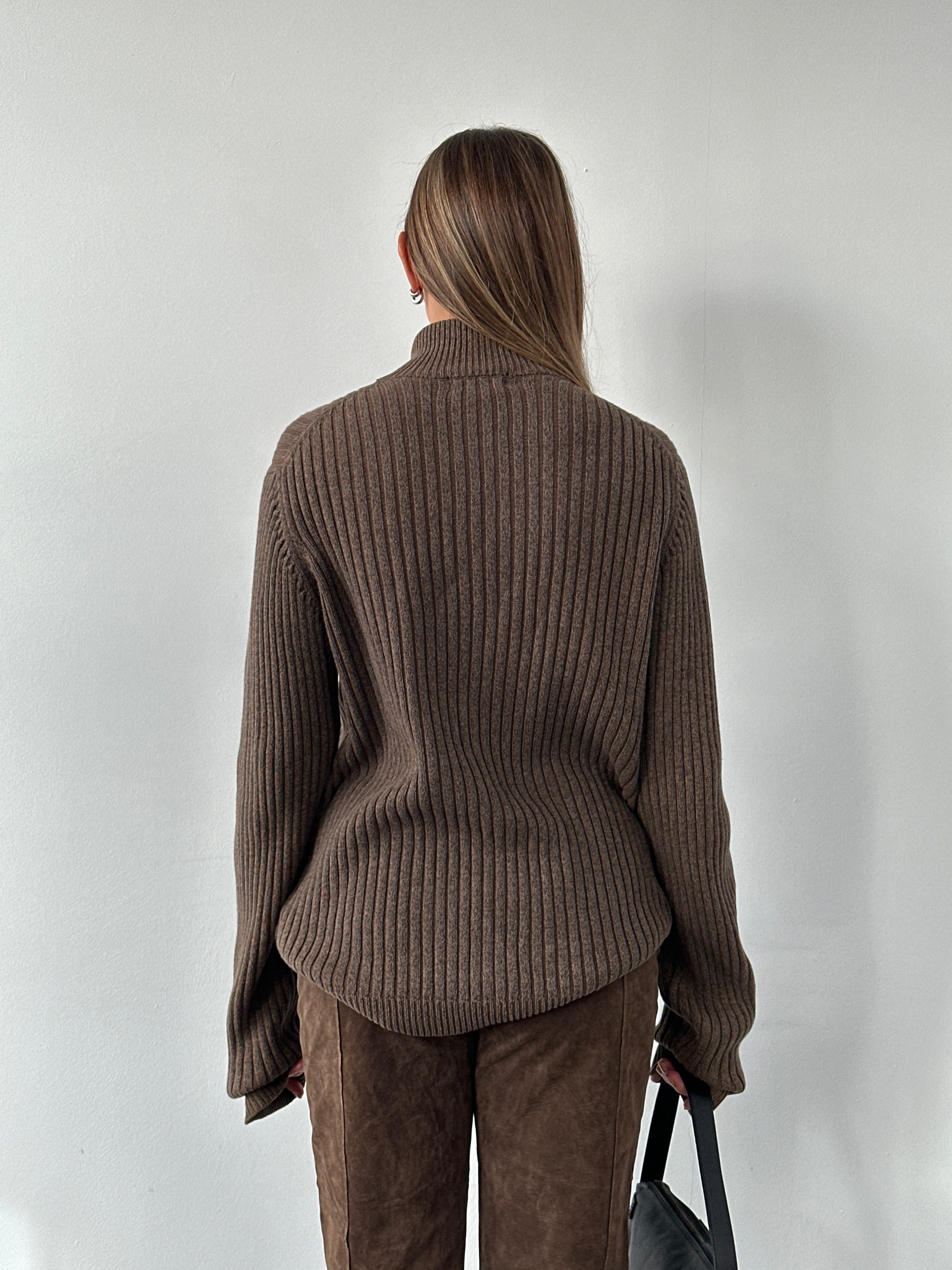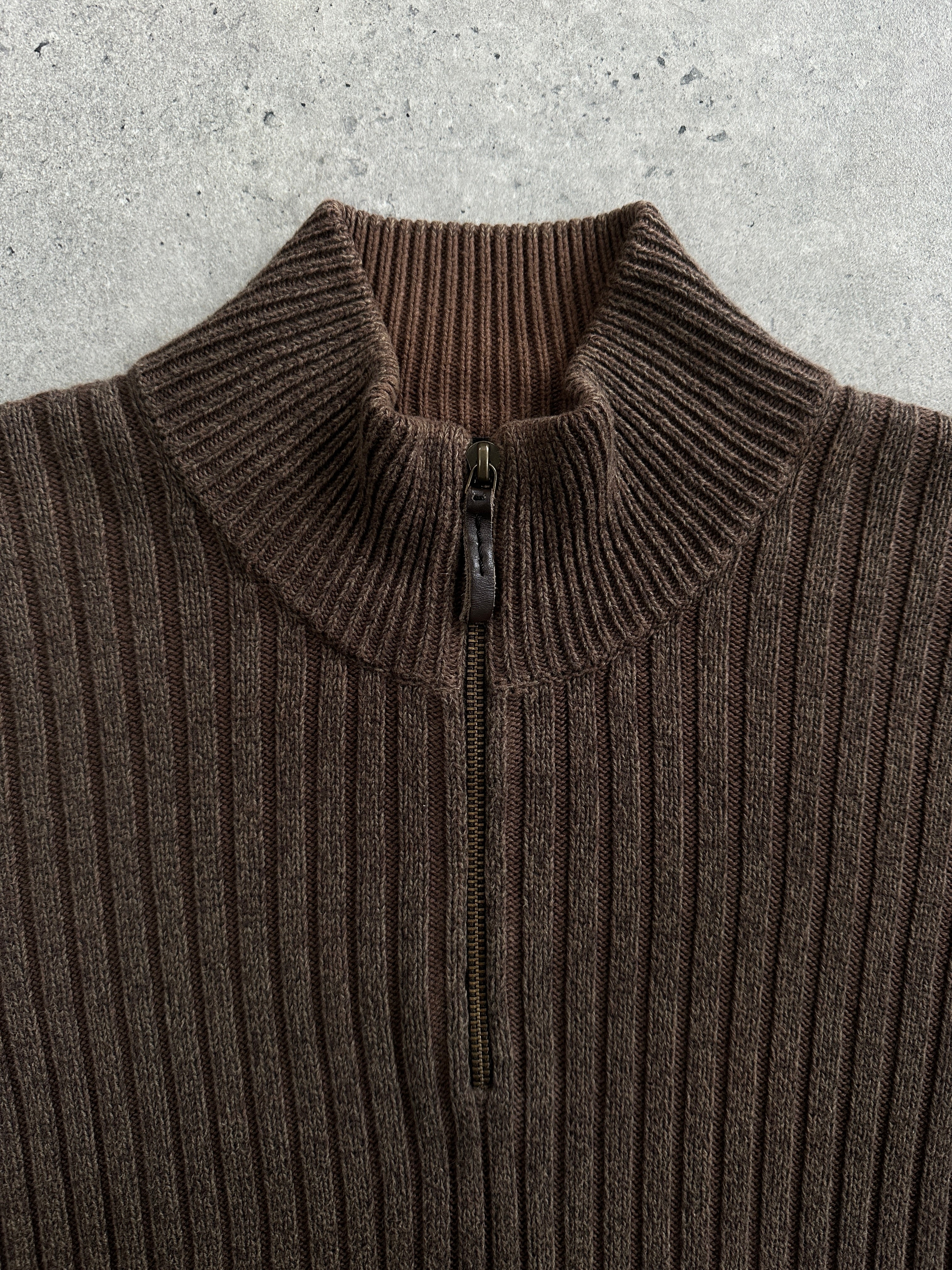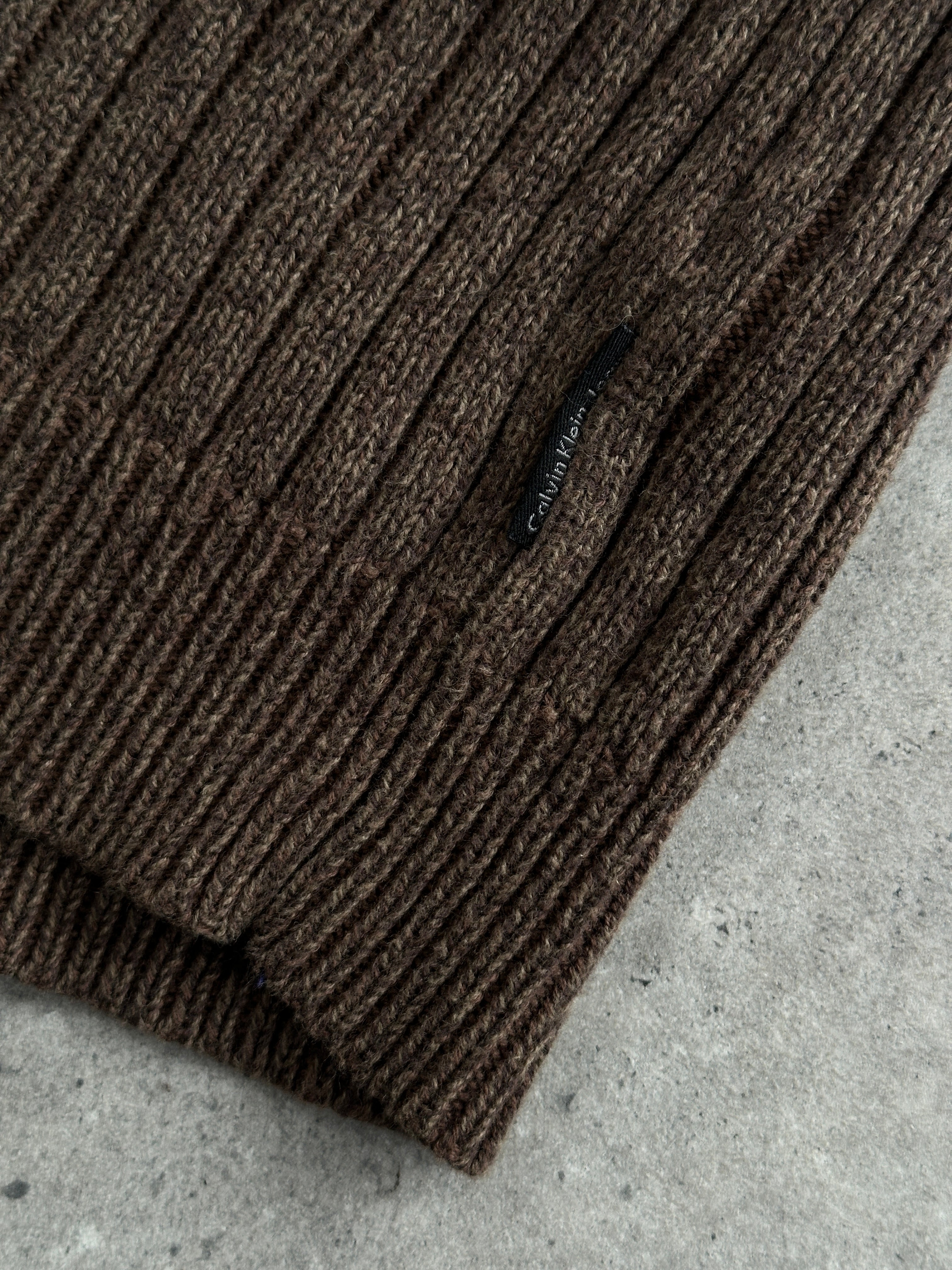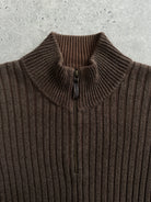A soft midweight brown ribbed knit sweater from Calvin Klein Jeans 2000 era featuring a half-zip funnel neckline and classic slim fit silhouette.