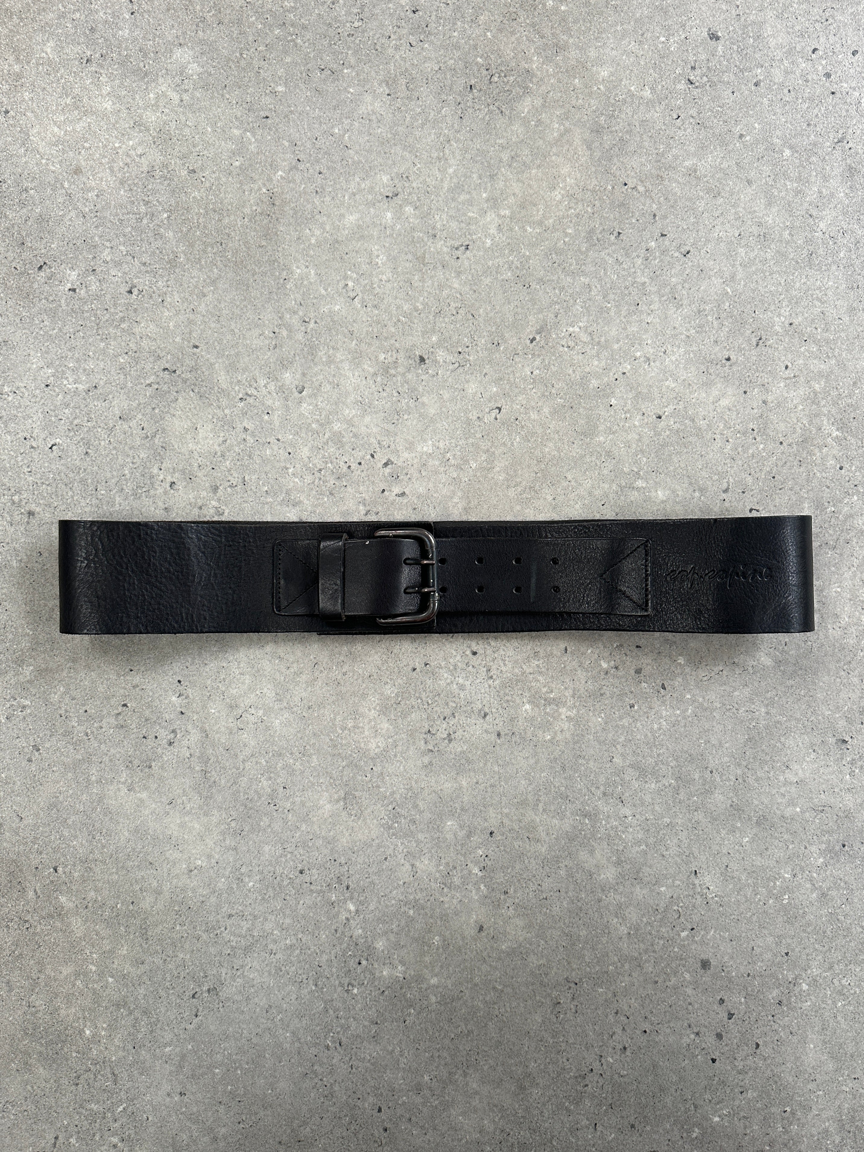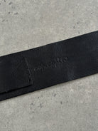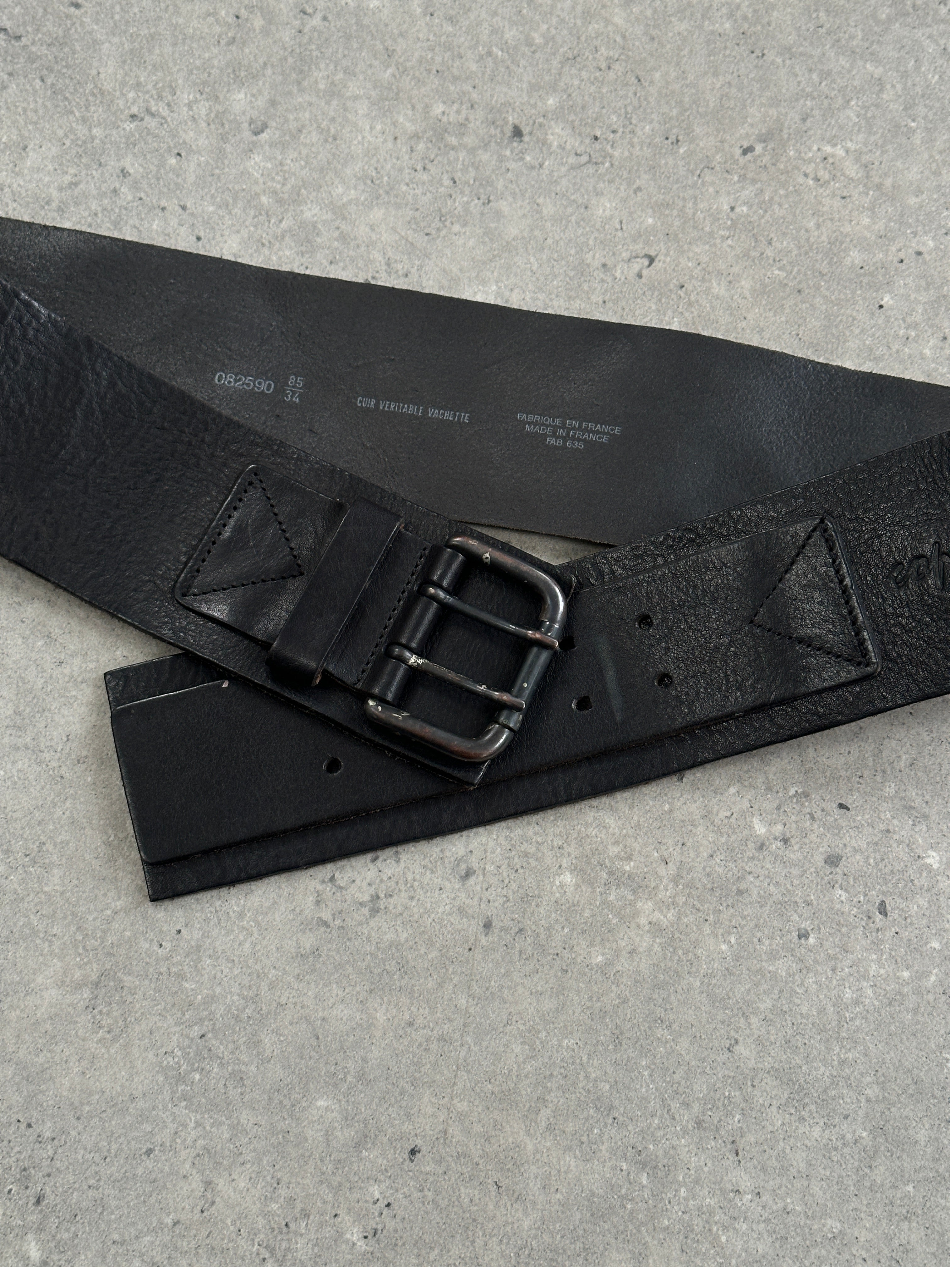 Minimal French made black leather belt by Cop Copine, featuring embossed branding and a tonal buckle design. A timeless 1990s piece with subtle texture and soft patina from age.